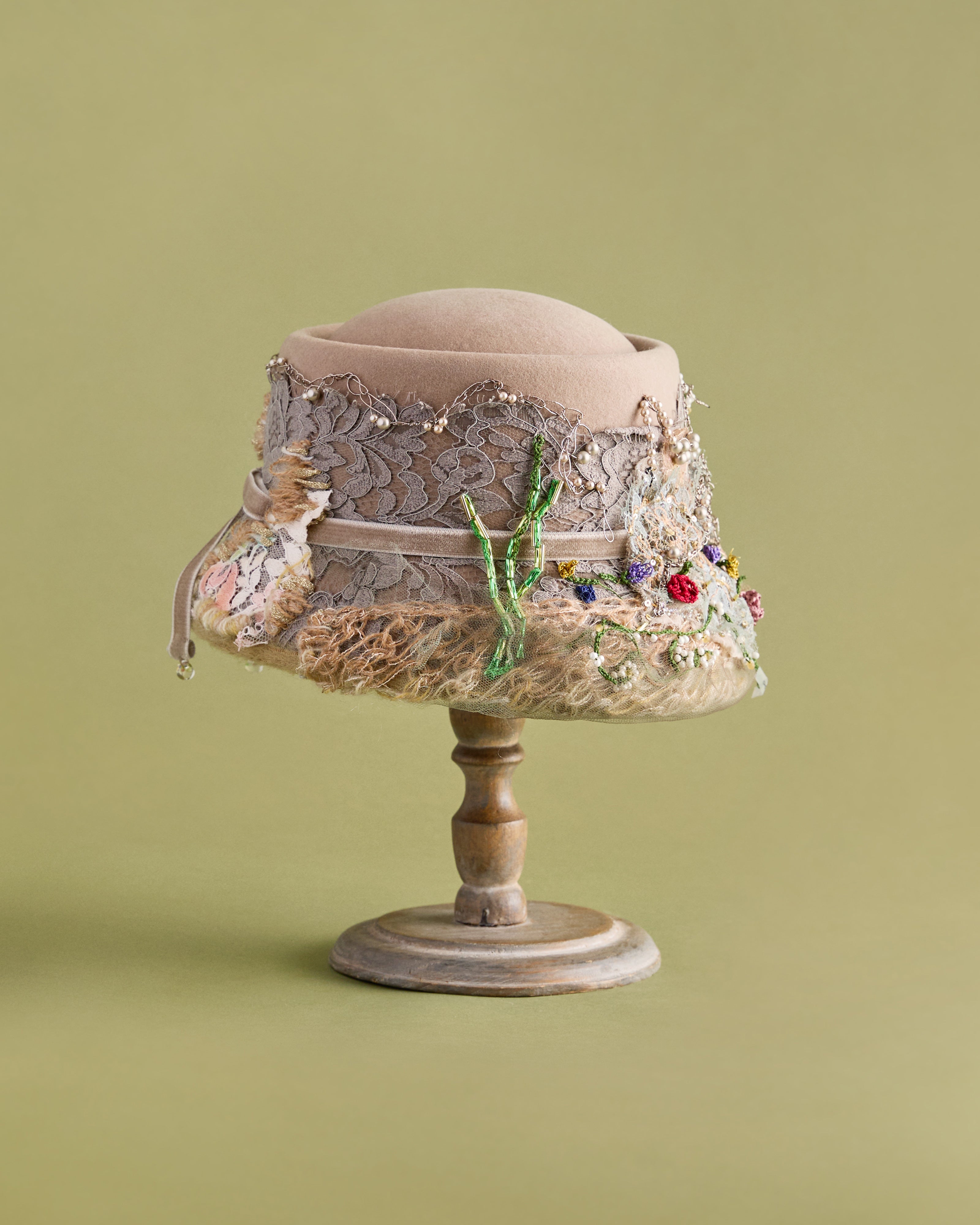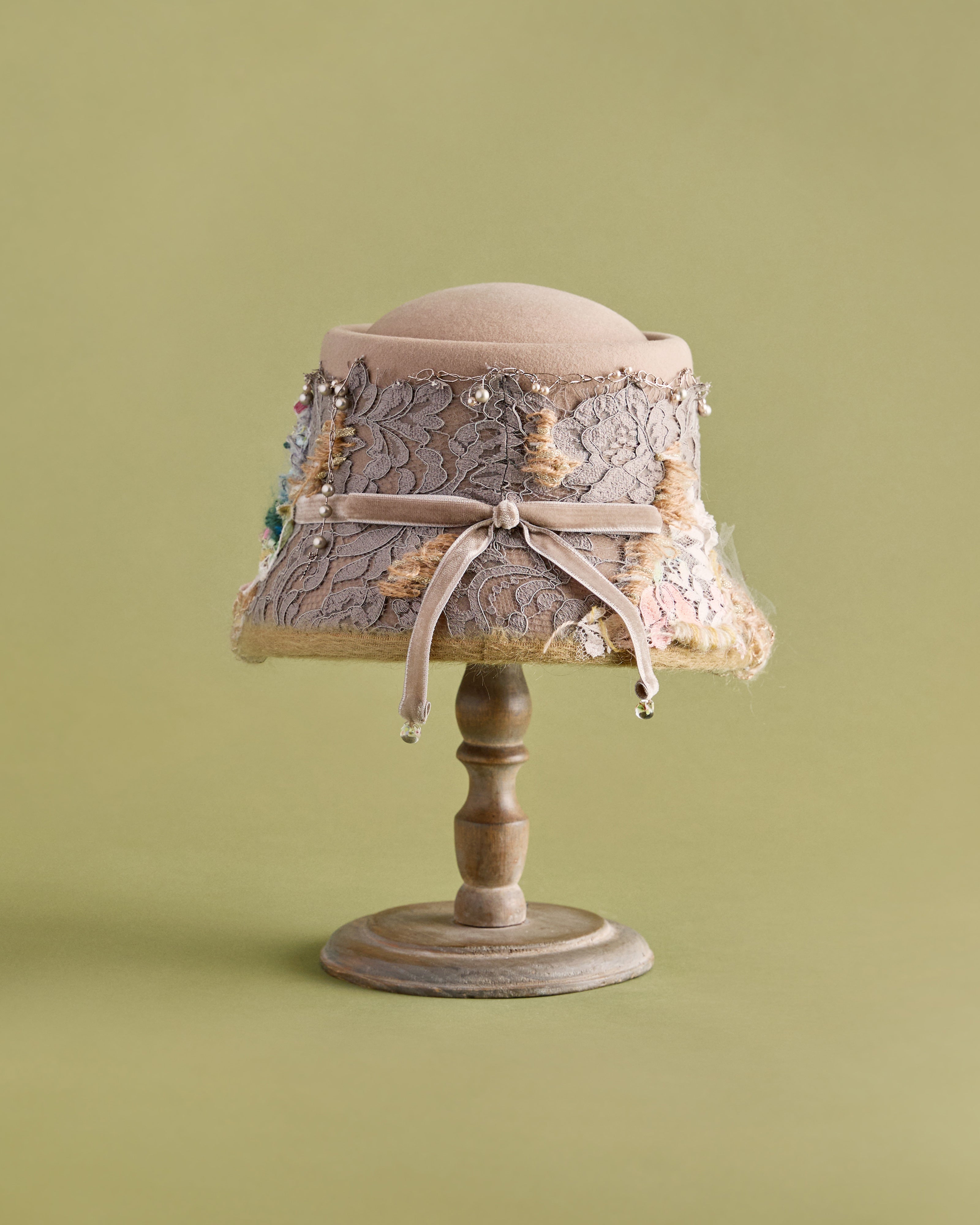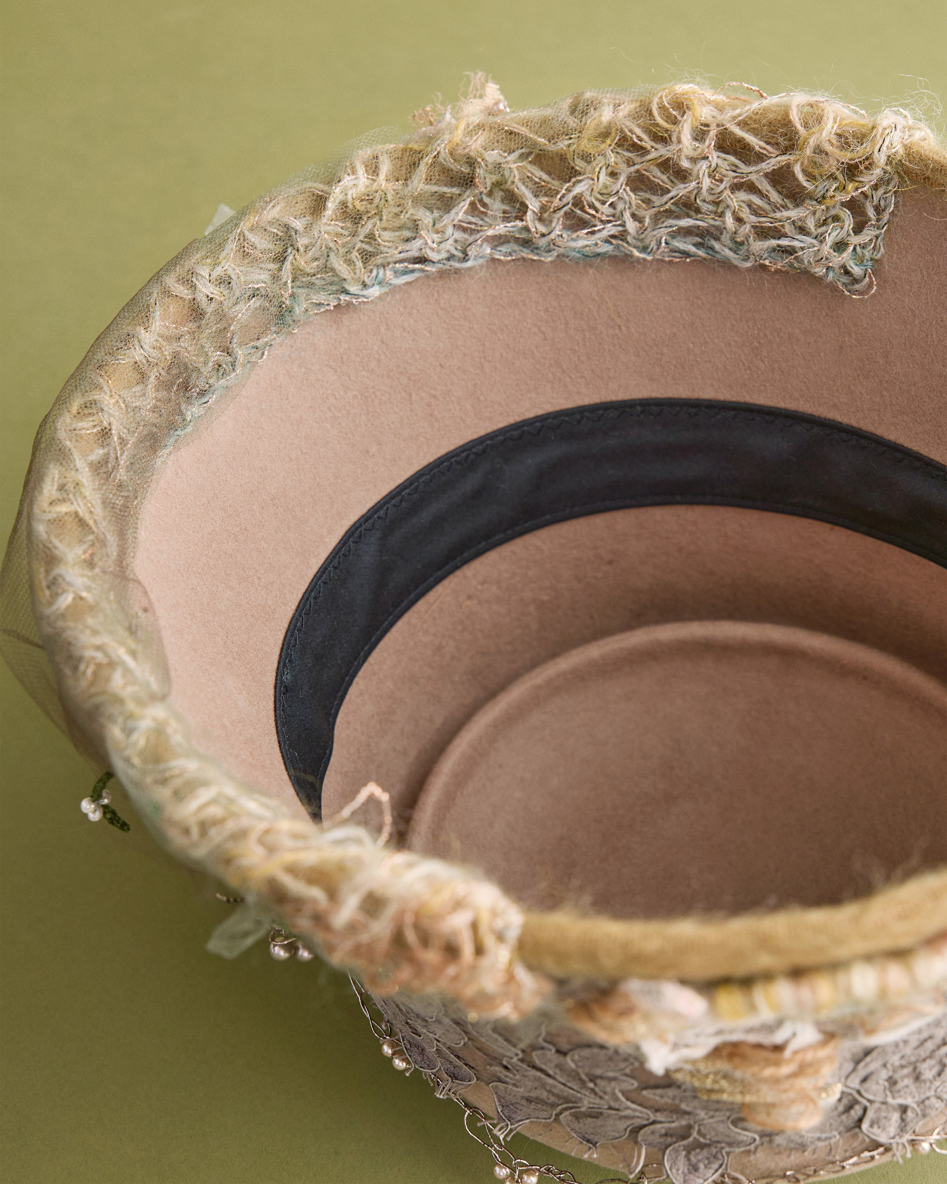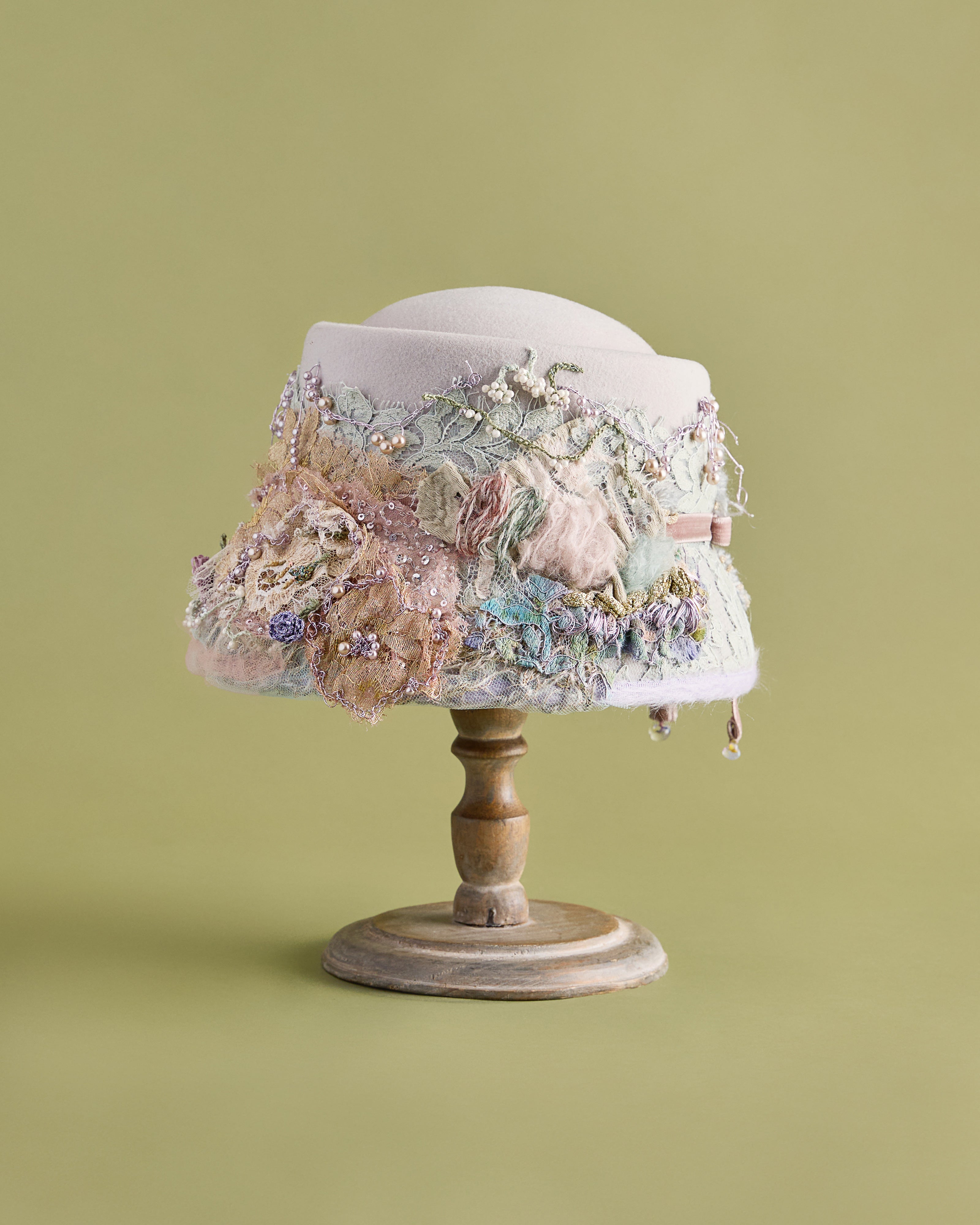 カラーは2色展開。Beigeはミレイの描いた「オフィーリア」そのままをイメージした色合い。MintはCIRQUTURE独自の解釈による、より淡く儚いファンタジックな色合いのオフィーリア。どちらも、帽子でありながらアートそのもののような存在感を放っています。「頭に乗せるアート」として、お客様に纏っていただけることを願っています。
