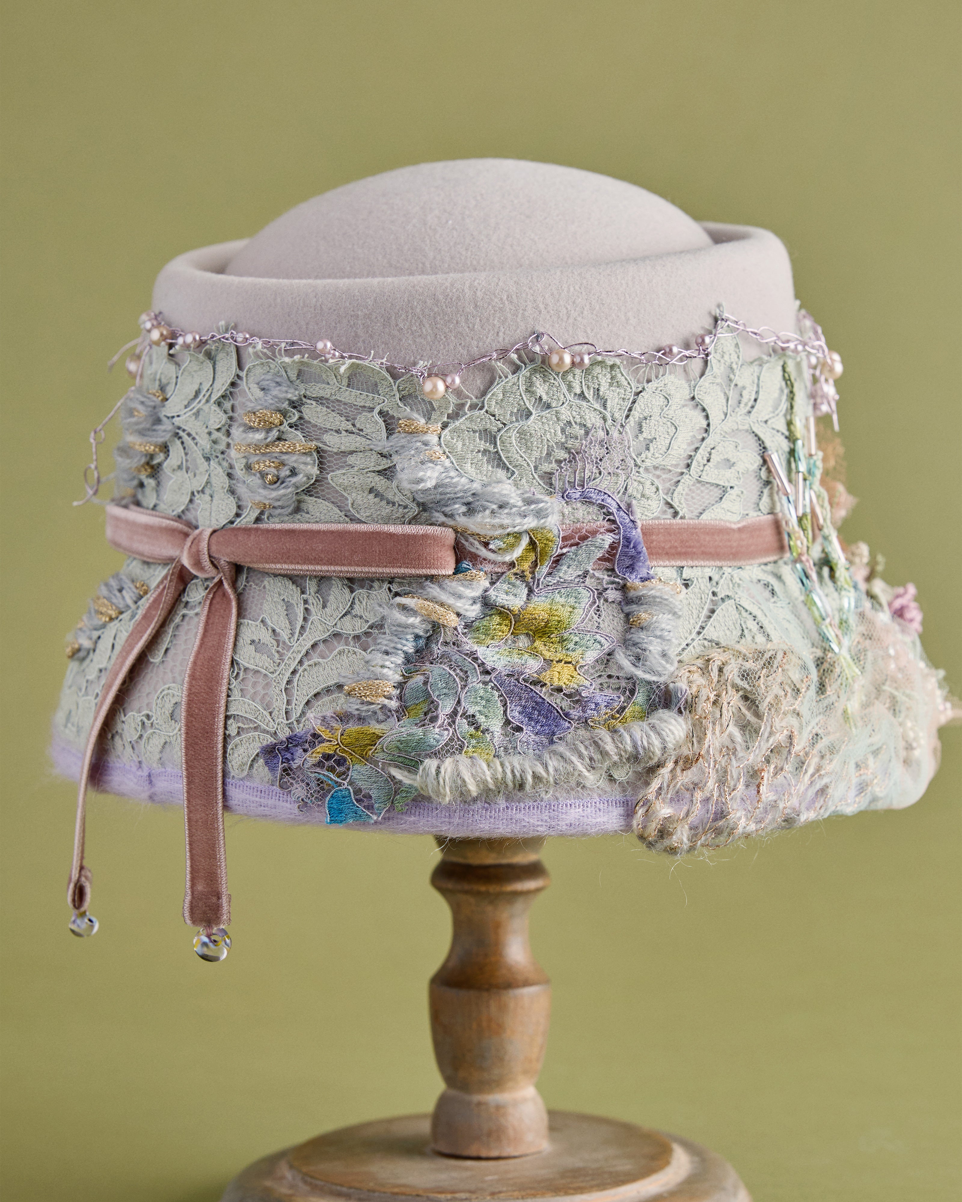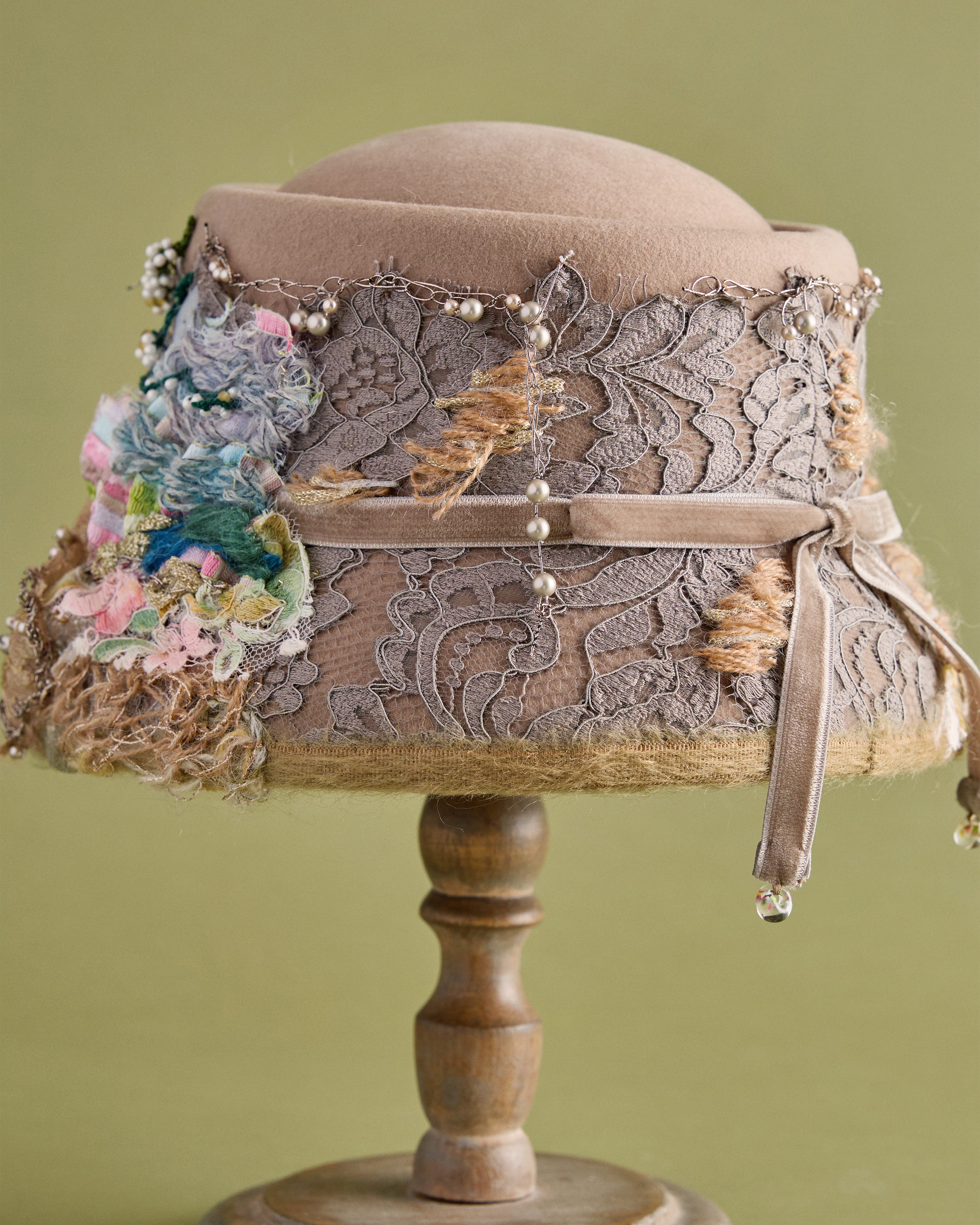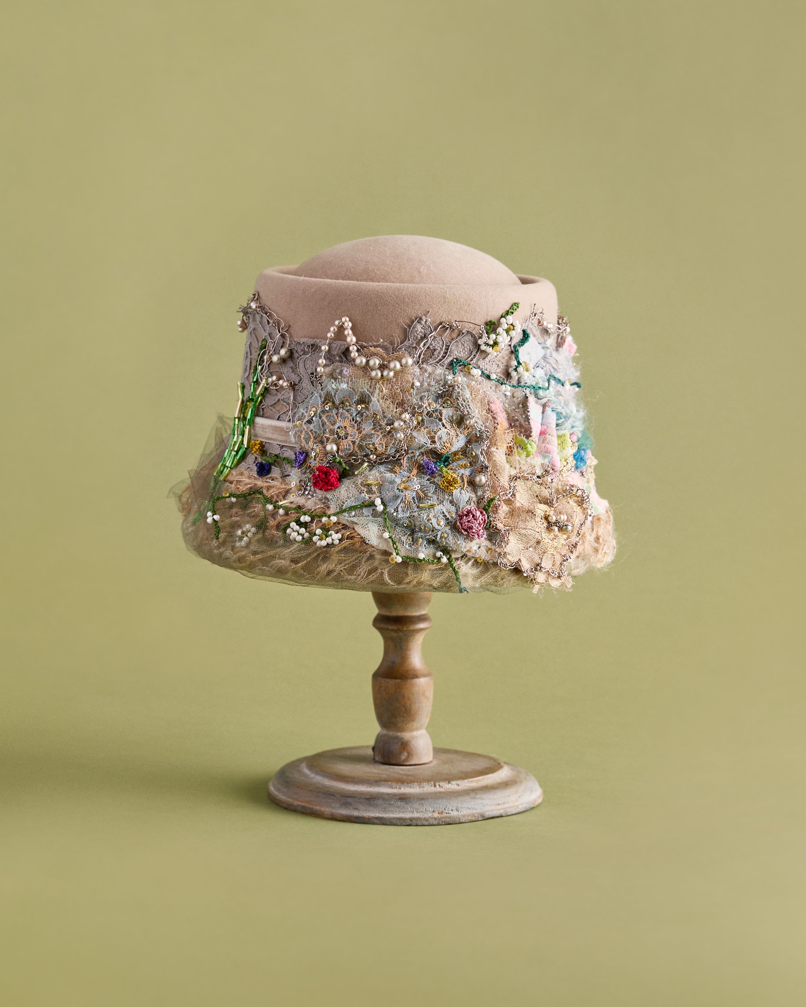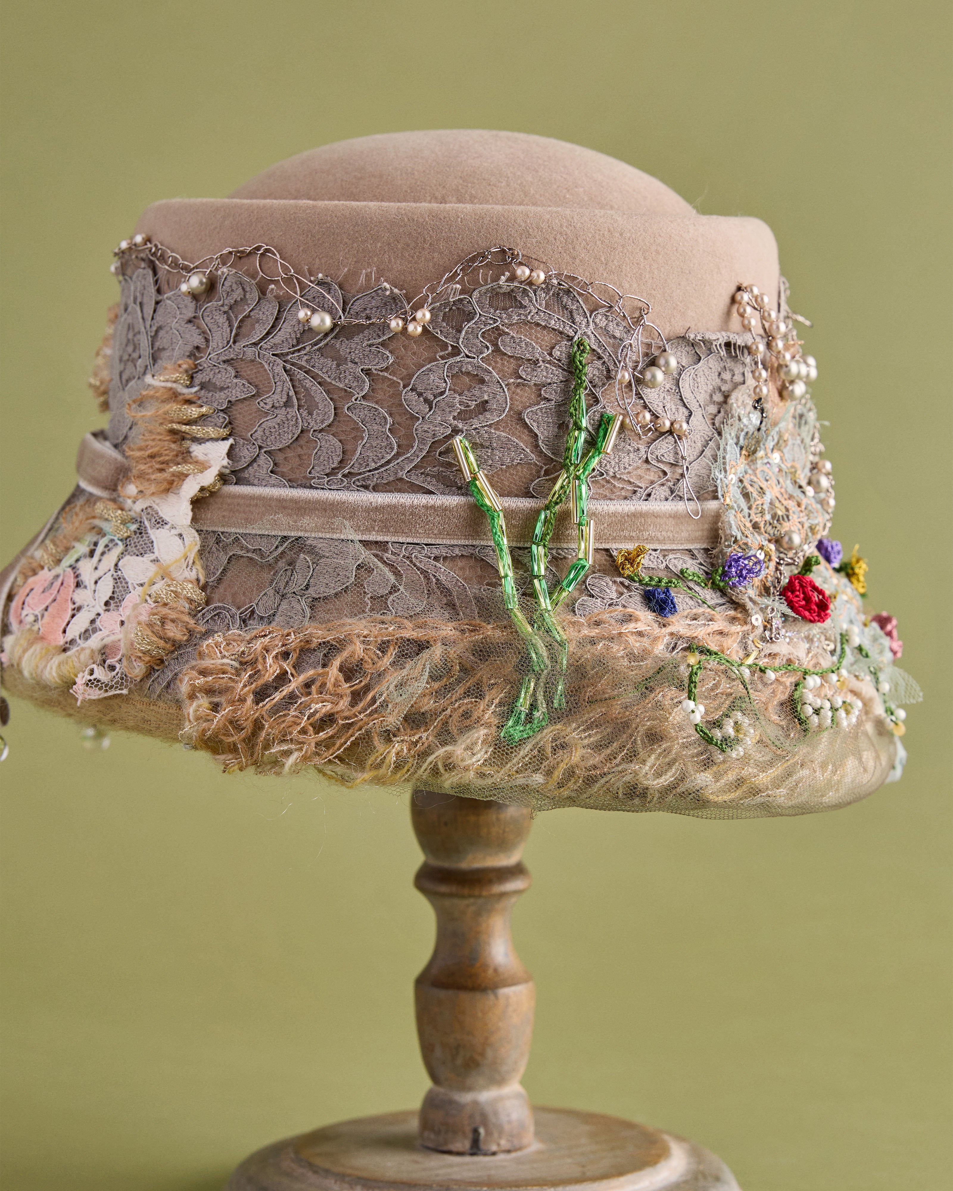 カラーは2色展開。Beigeはミレイの描いた「オフィーリア」そのままをイメージした色合い。MintはCIRQUTURE独自の解釈による、より淡く儚いファンタジックな色合いのオフィーリア。どちらも、帽子でありながらアートそのもののような存在感を放っています。「頭に乗せるアート」として、お客様に纏っていただけることを願っています。