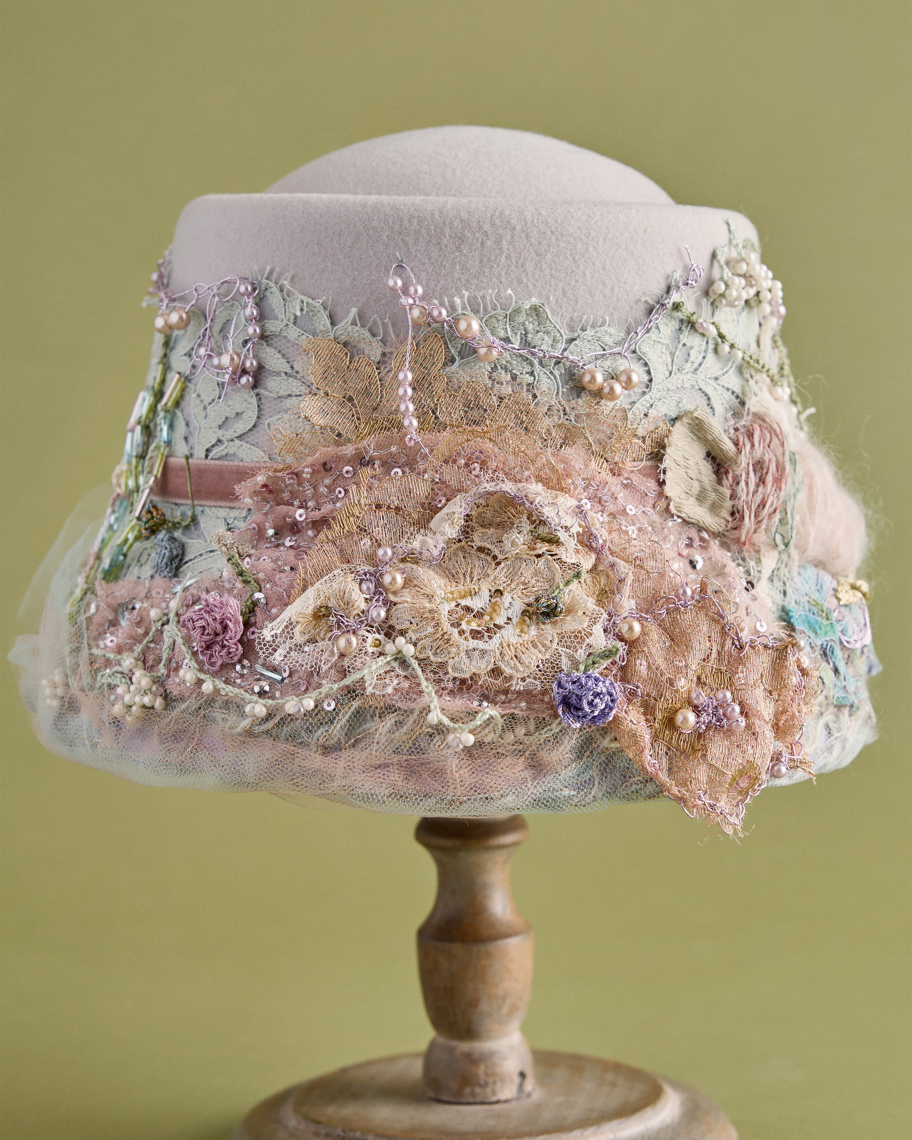 フランス製の最高級レースやスパングル、刺繍の絹糸、手描きで染めたレース、そして一点一点かぎ針で編んだ花やビーズ細工。数え切れないほどの素材と手仕事を重ね、360度どこから見ても美しい装飾を施しています。
