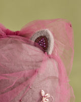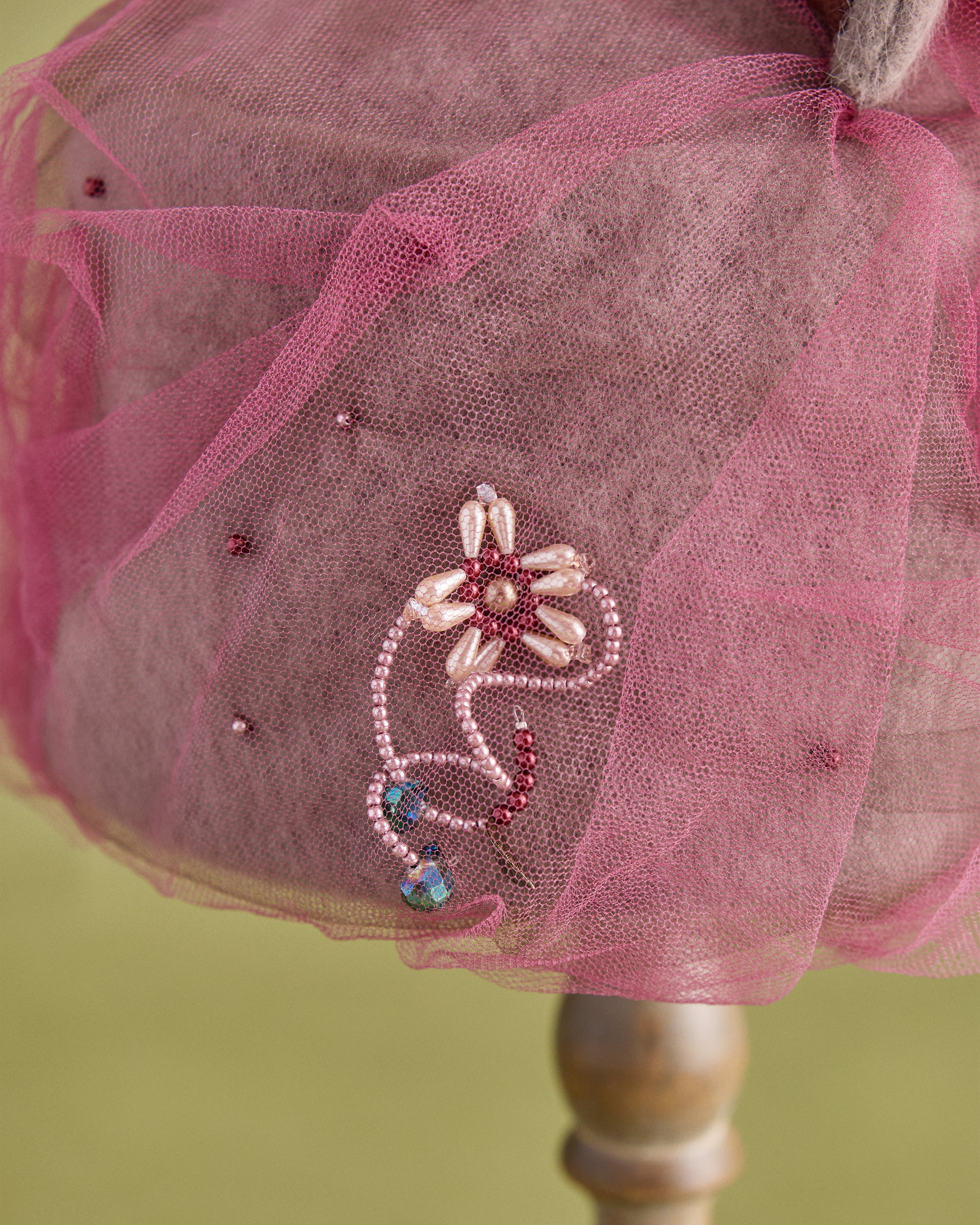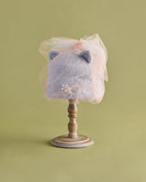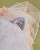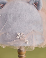 猫耳部分は2重仕立てで、小さな耳にはラインストーンをあしらい、さりげない輝きを添えました。背後には大きなチュールの耳が寄り添い、リボン飾りを兼ねた立体的な構造になっています。立体感と透明感、そして遊び心をあわせ持つファンタジックな一品。ニット帽のカテゴリーに属しますが、形がきちんと作られているため、被るだけで猫耳シルエットを楽しめます。