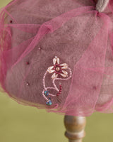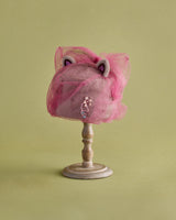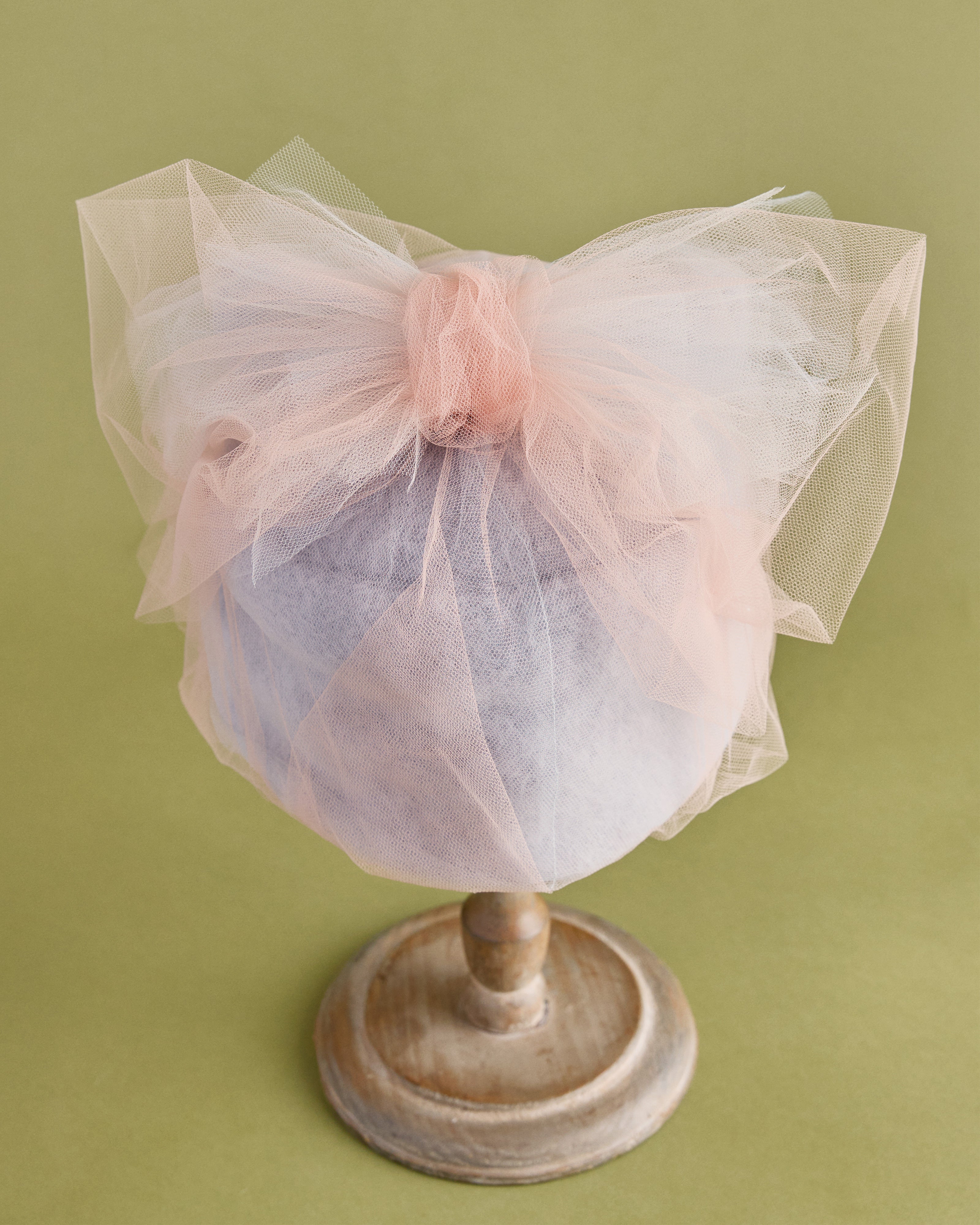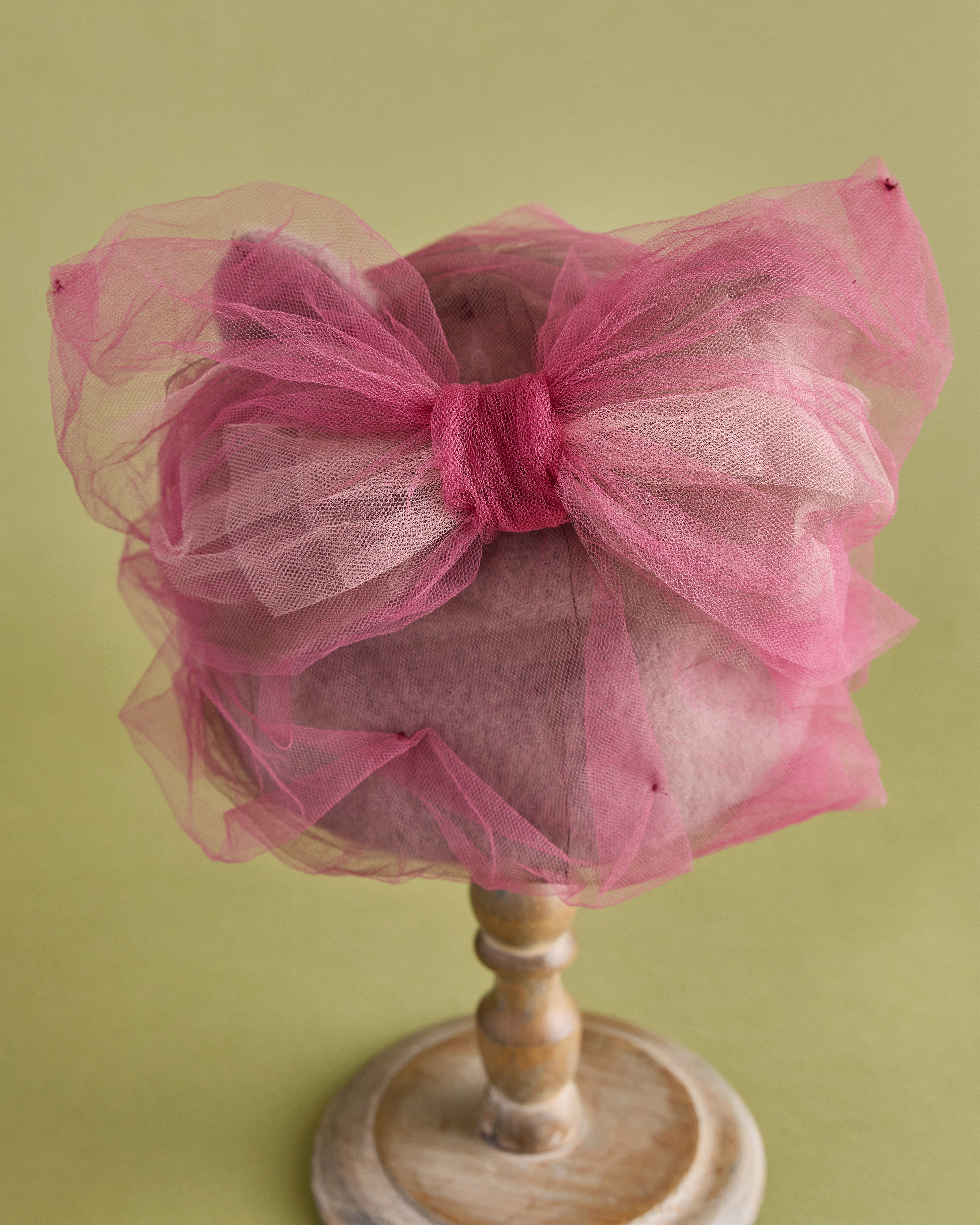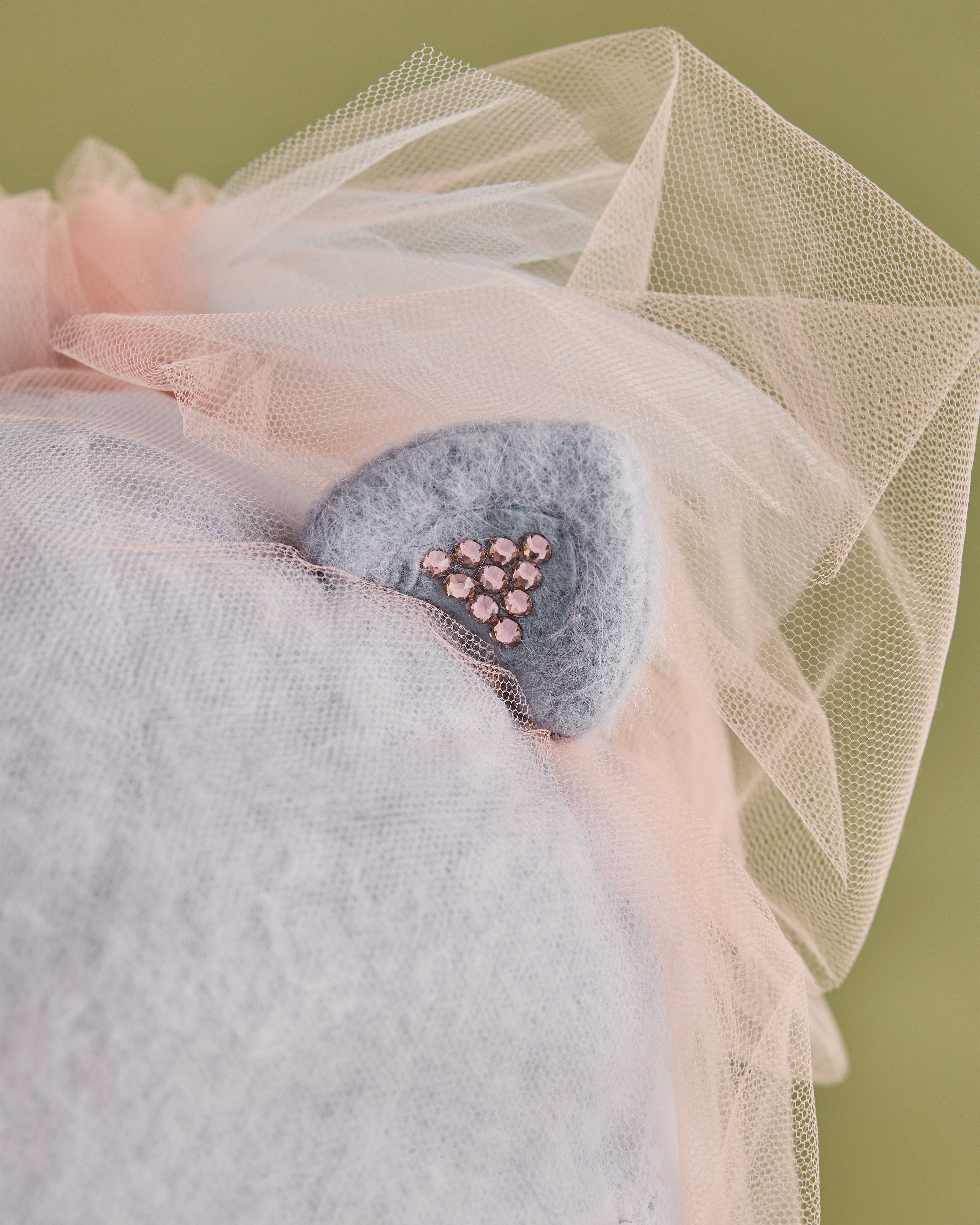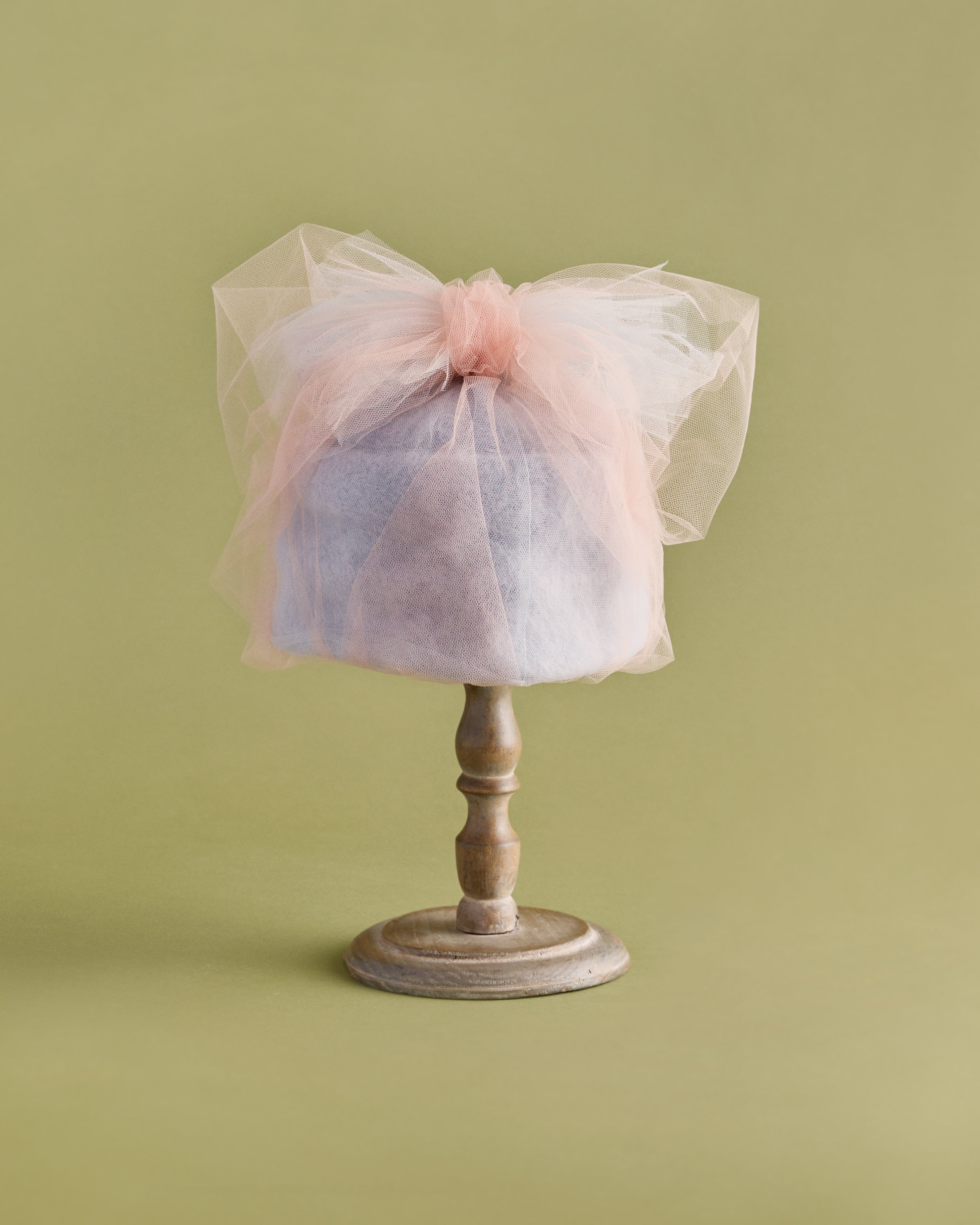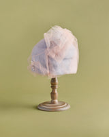 アンゴラ素材を縫製で立体的に構築した帽子を土台に、幻想的なチュールを纏わせたデザイン。
