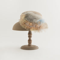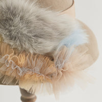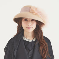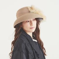 水彩画を描くように幾色ものチュールをフリルに縫い、重ねることで絵画のような帽子に仕立てました。フォックスファーとフリルのコンビネーションがとても華やかなのですが、更につば裏にもフリルを繰り返すことによって、お顔の隣に常に寄り添い、一層にドラマチックです。