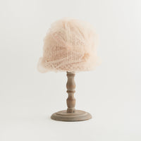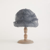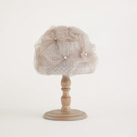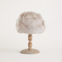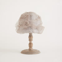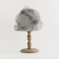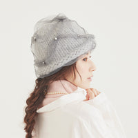 チュール表面には、薔薇のように見える泡、泡のように見える薔薇をイメージしたアンニュイな雰囲気の手仕事を施しました。浮遊するしゃぼん玉をイメージし、パールもベーシックなパールに加えて透明感のあるものをミックスしています。