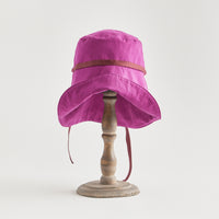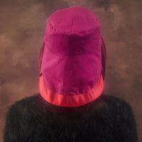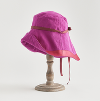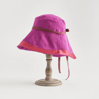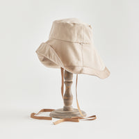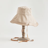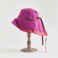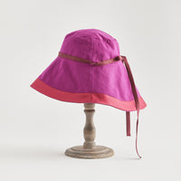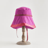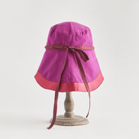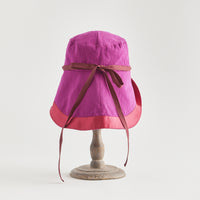 生地は2種類を使用し、部分ごとに適した素材を採用。ベースにはオーガニックコットンを、切り替え部分には光沢感のあるサテンを組み合わせました。動くたびにちらりと覗くサテンが、さりげないアクセントになっています。ツバは前後どちらを前にしてもかぶることができ、折り返してアレンジすることで、さまざまなフォルムを楽しめるデザインです。