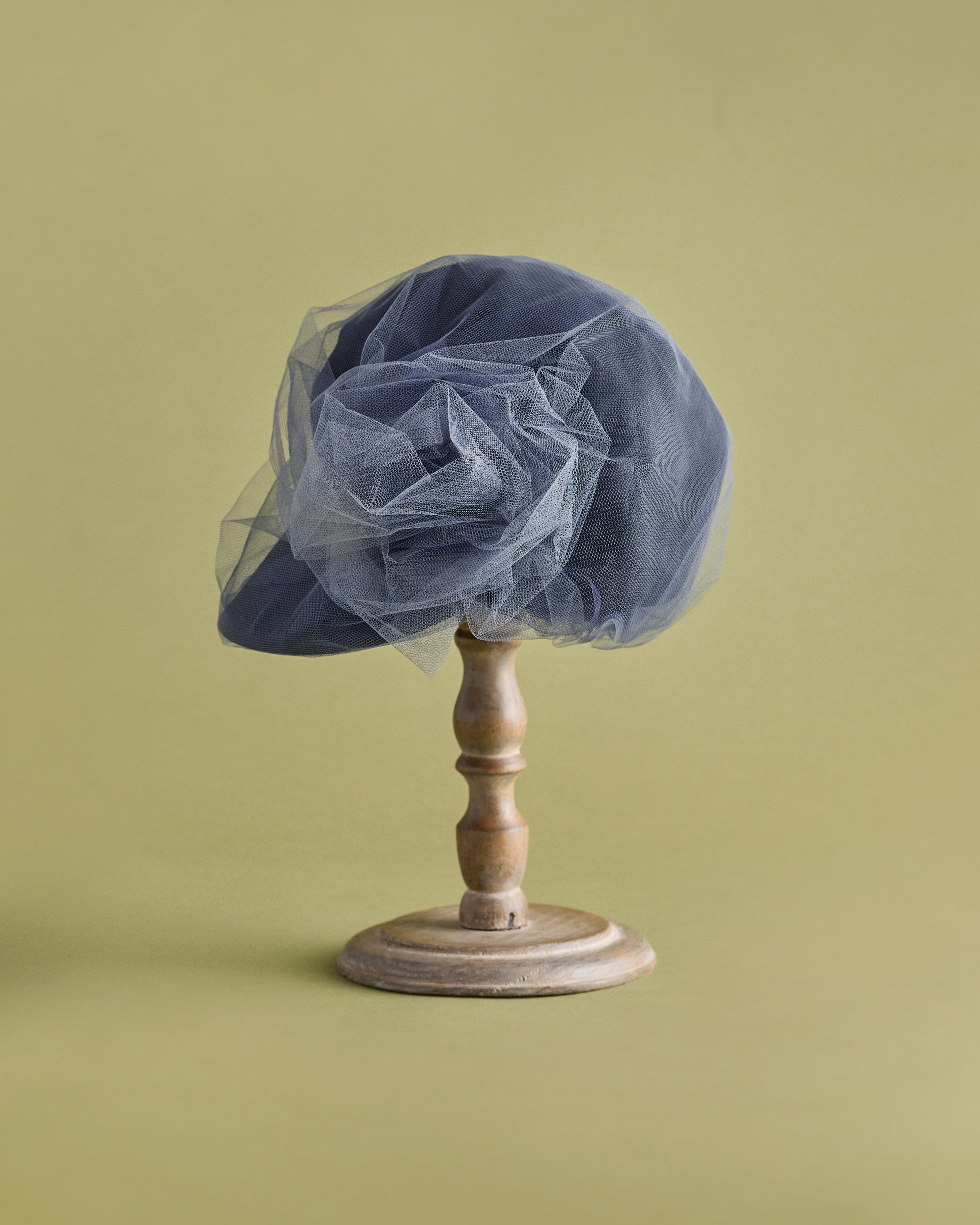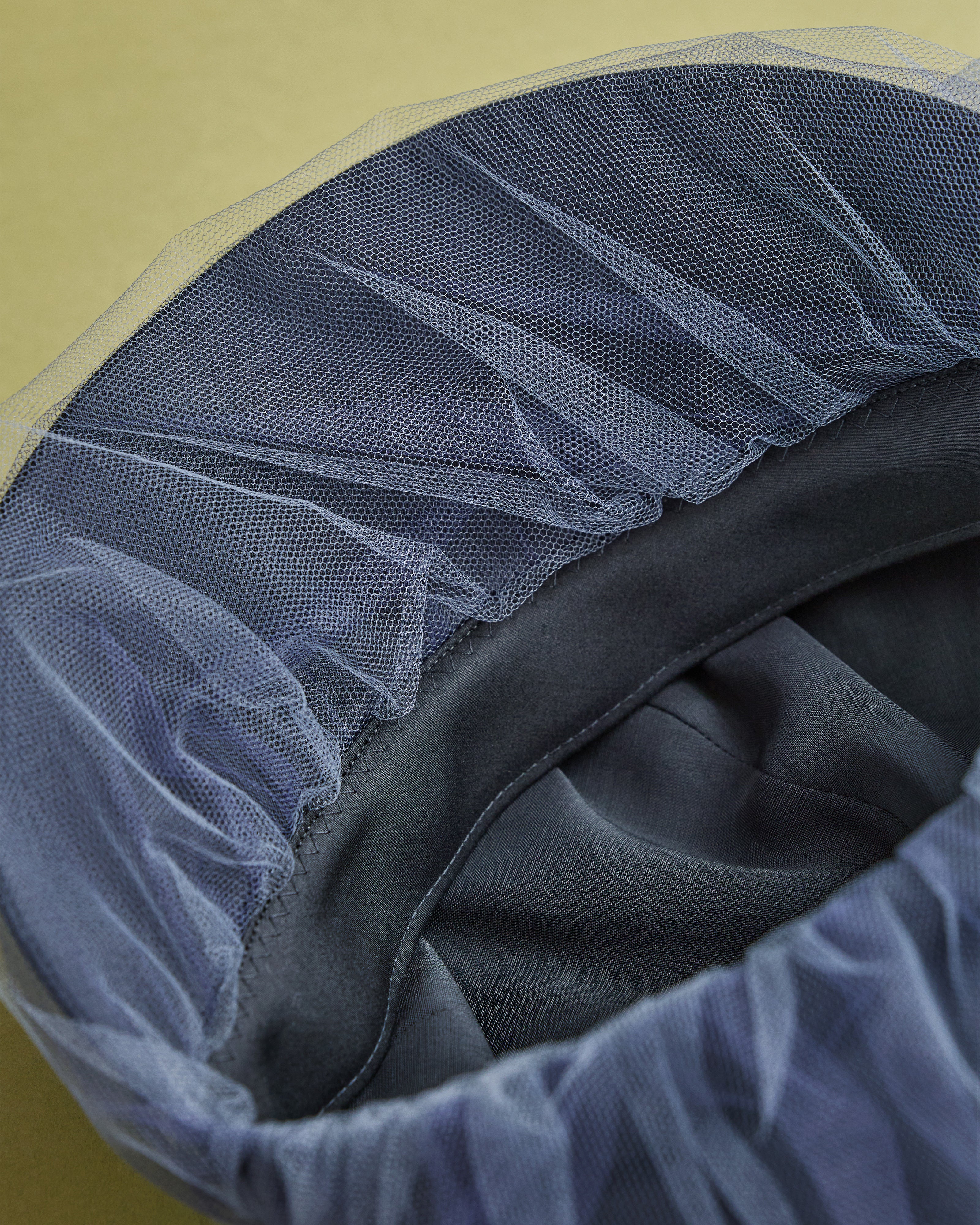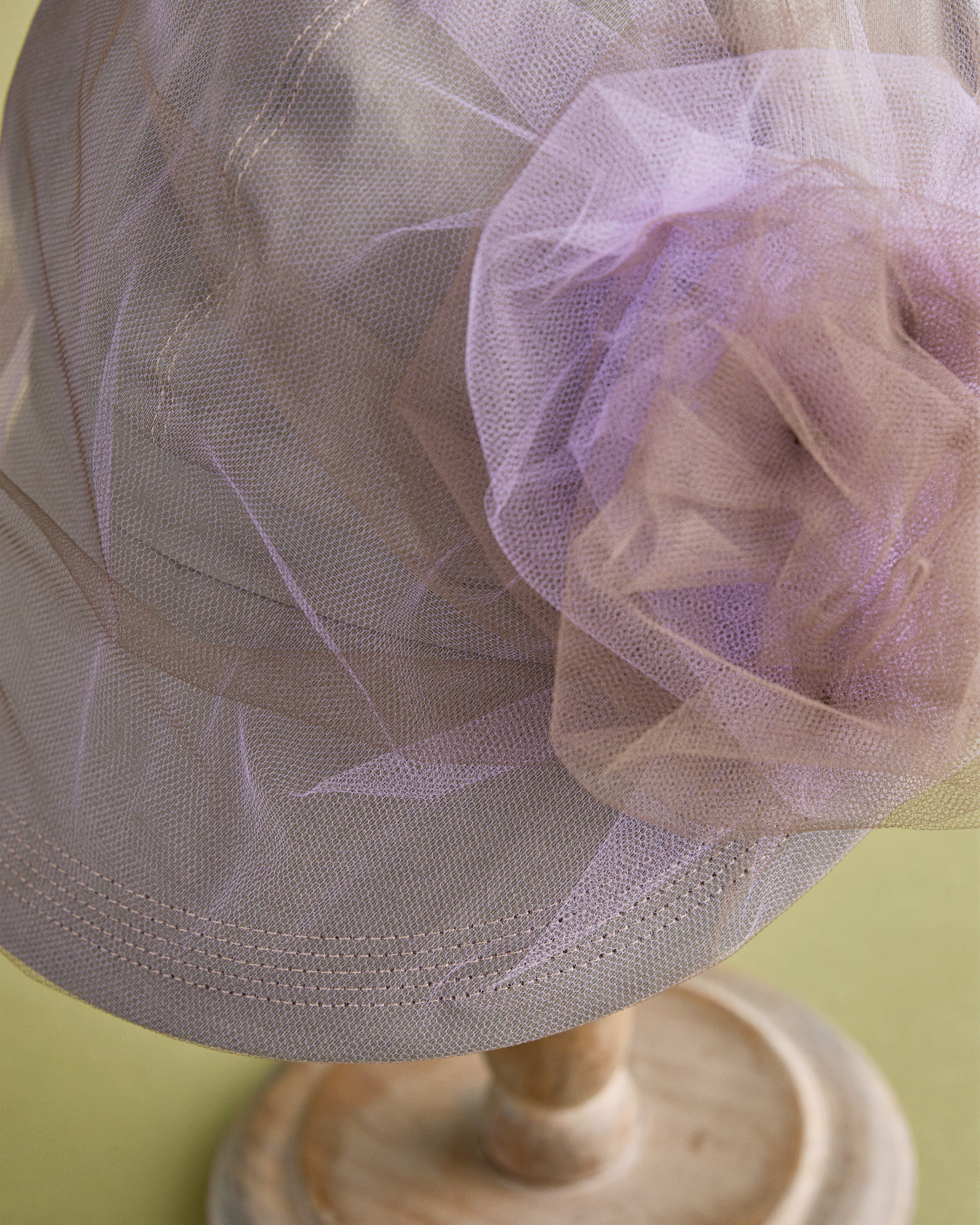 帽子をキャンバスに見立て、2色のチュールを重ね合わせ、抽象と具象のあいだを漂う薔薇を描きました。ワーカースタイルを思わせるステッチミシンの力強さと、チュールの繊細な質感と薔薇のデリケートなディテールが交差し、相反するムードが絶妙なバランスで調和しています。