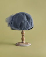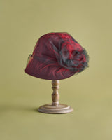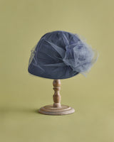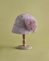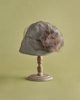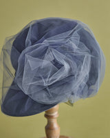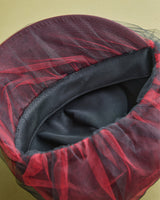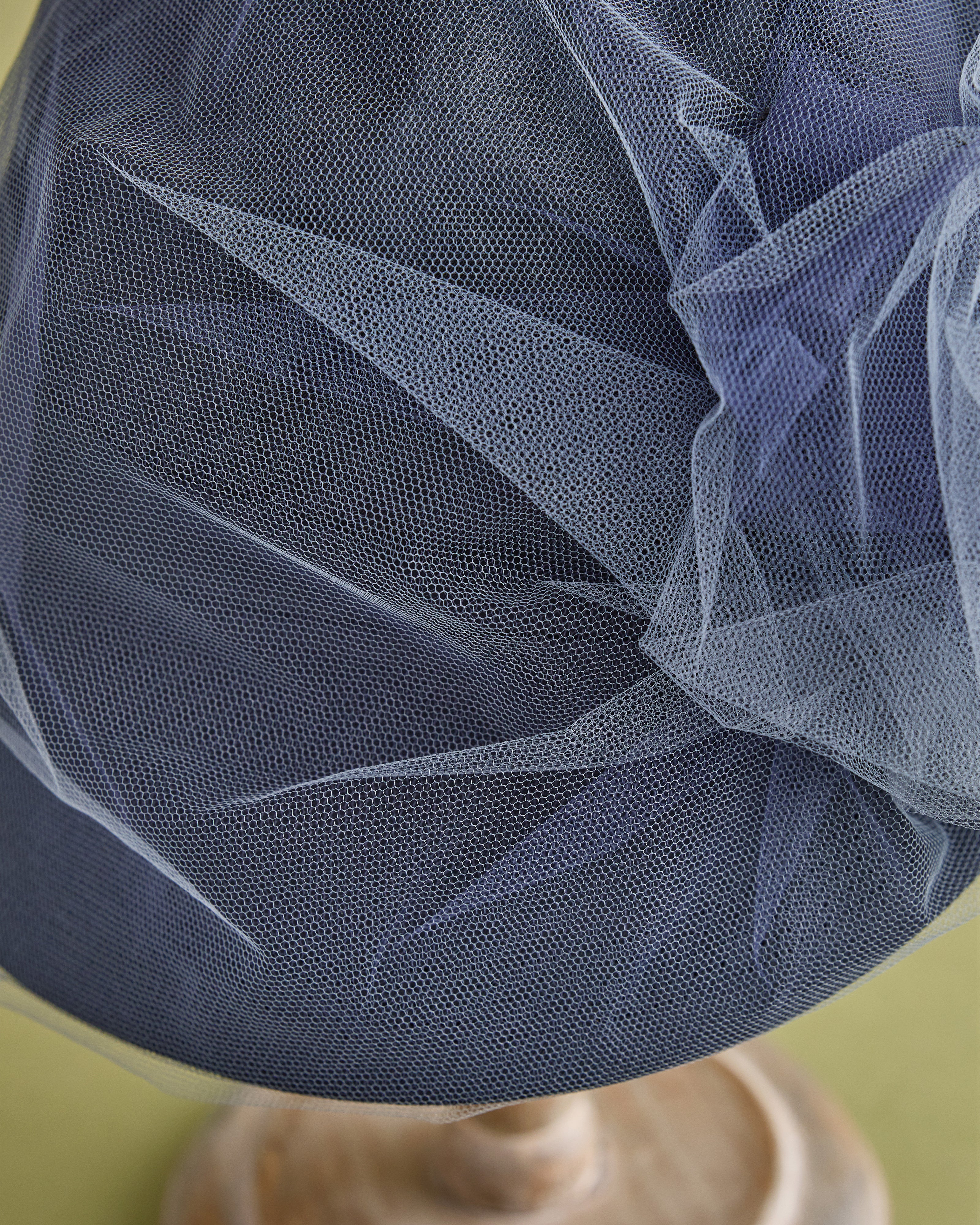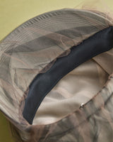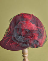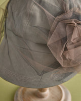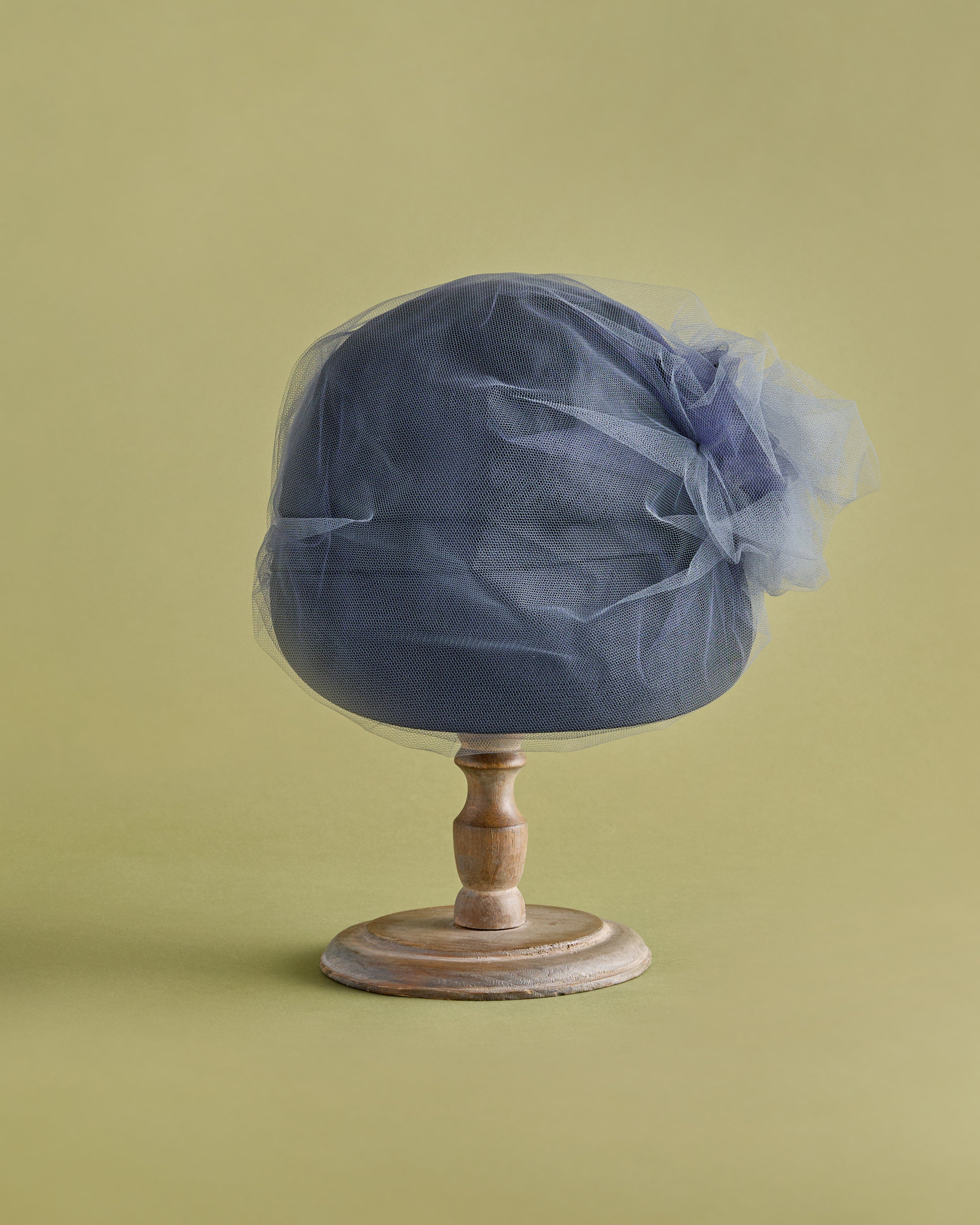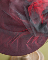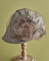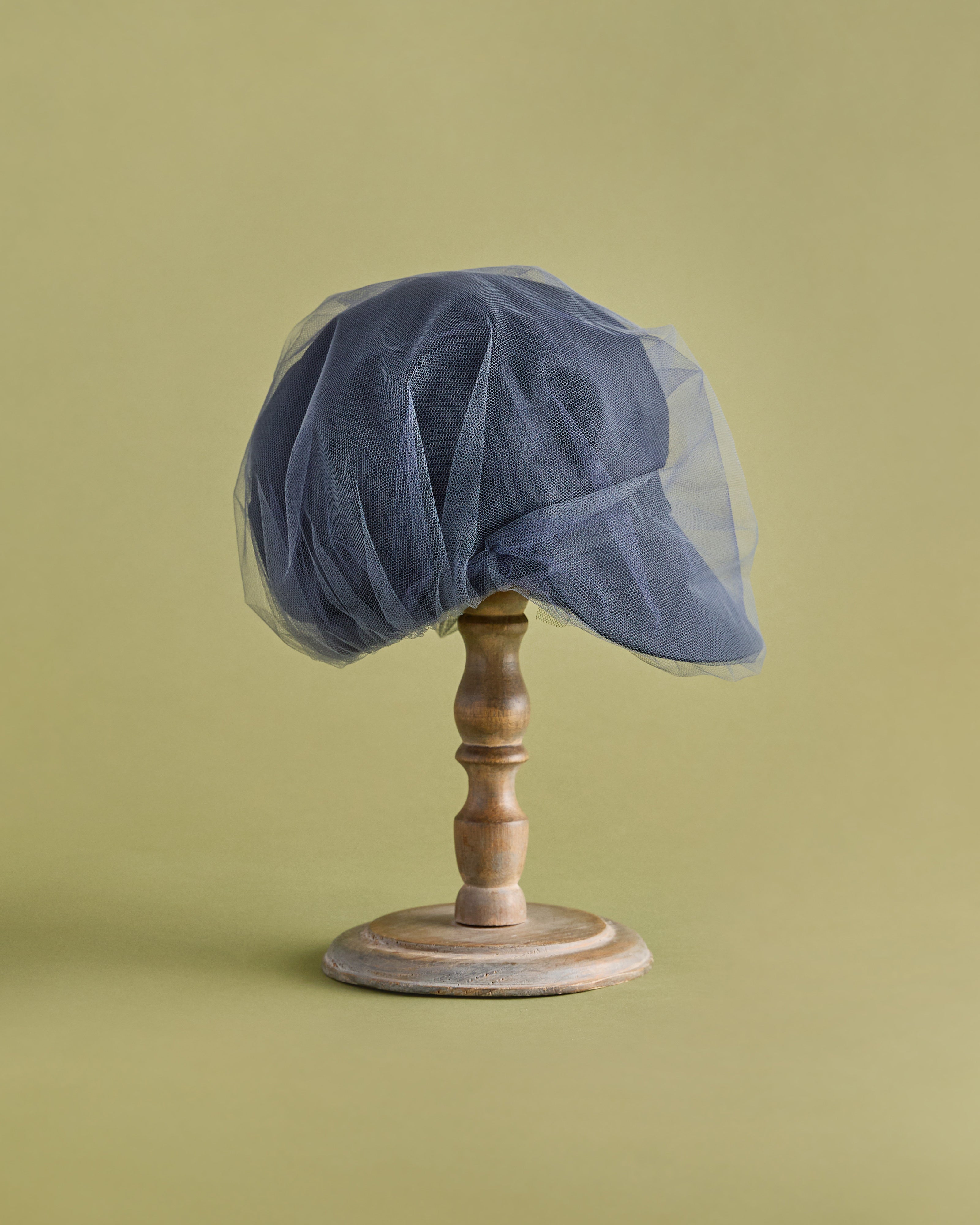 帽子をキャンバスに見立て、2色のチュールを重ね合わせ、抽象と具象のあいだを漂う薔薇を描きました。ワーカースタイルを思わせるステッチミシンの力強さと、チュールの繊細な質感と薔薇のデリケートなディテールが交差し、相反するムードが絶妙なバランスで調和しています。