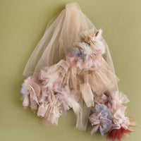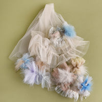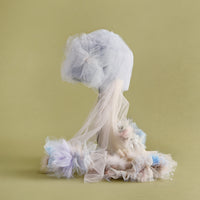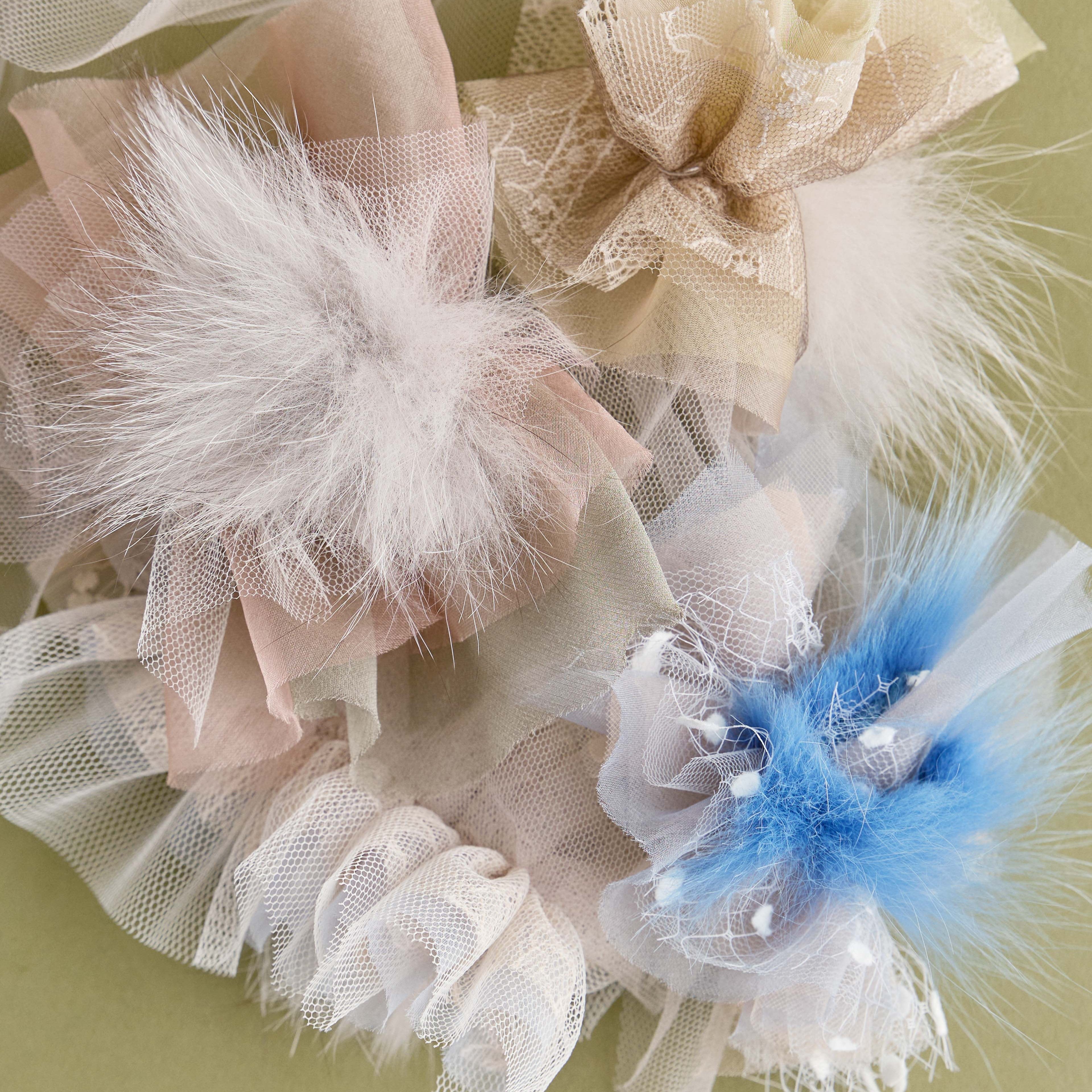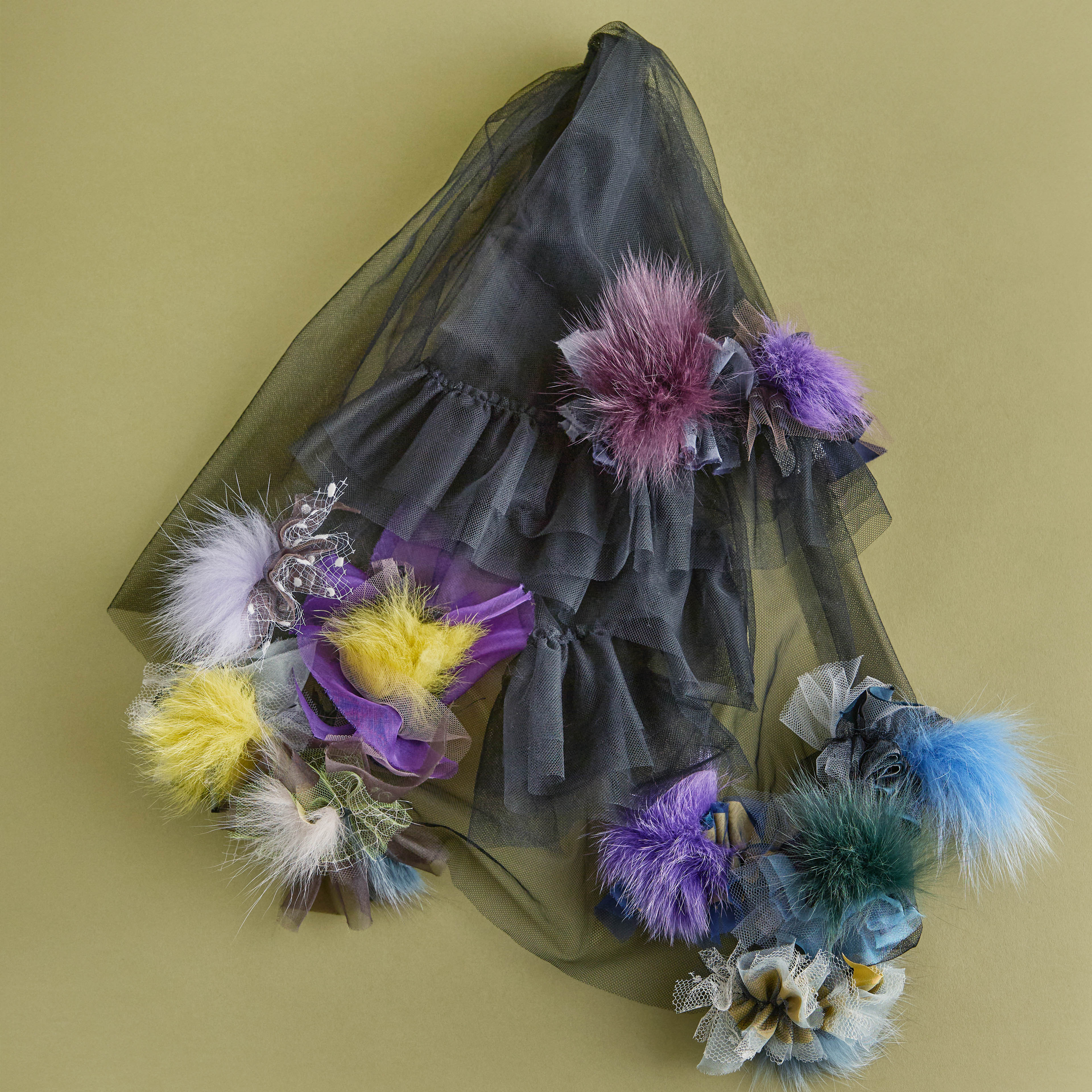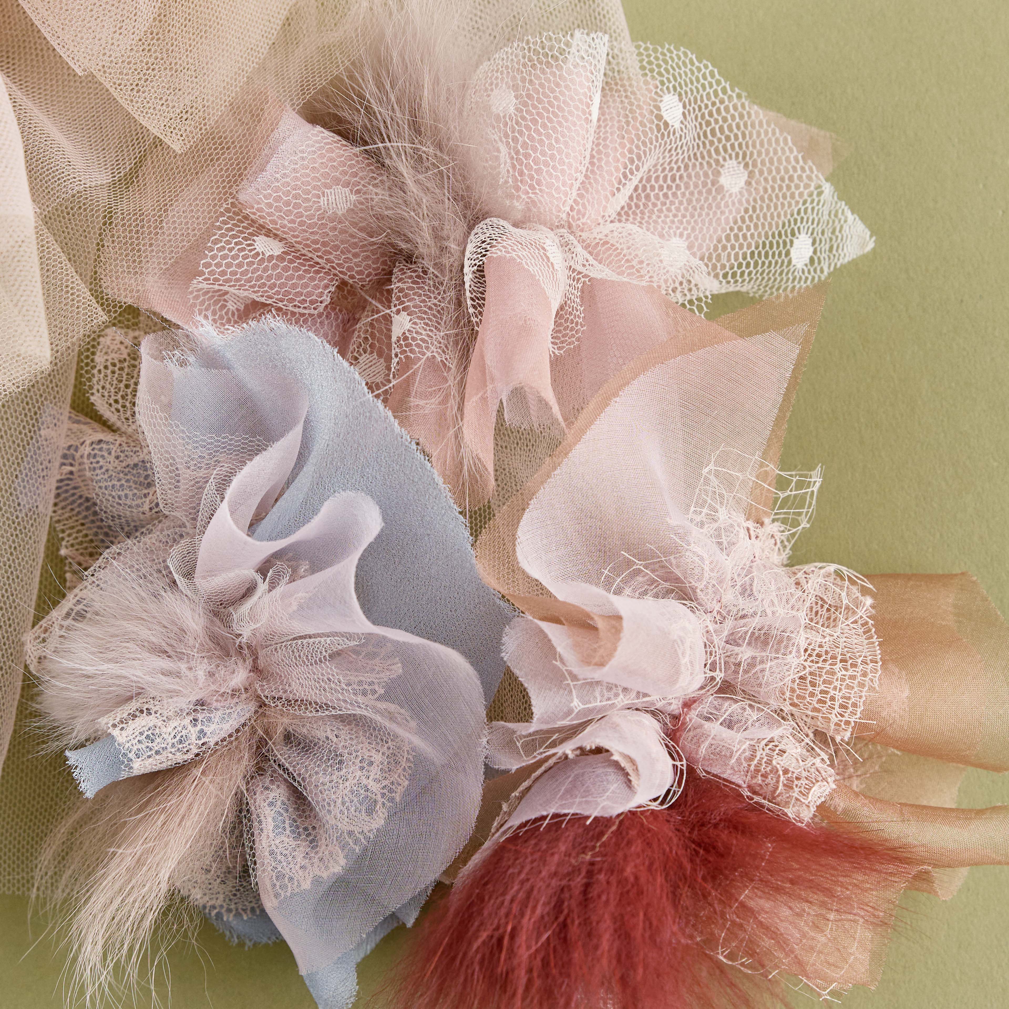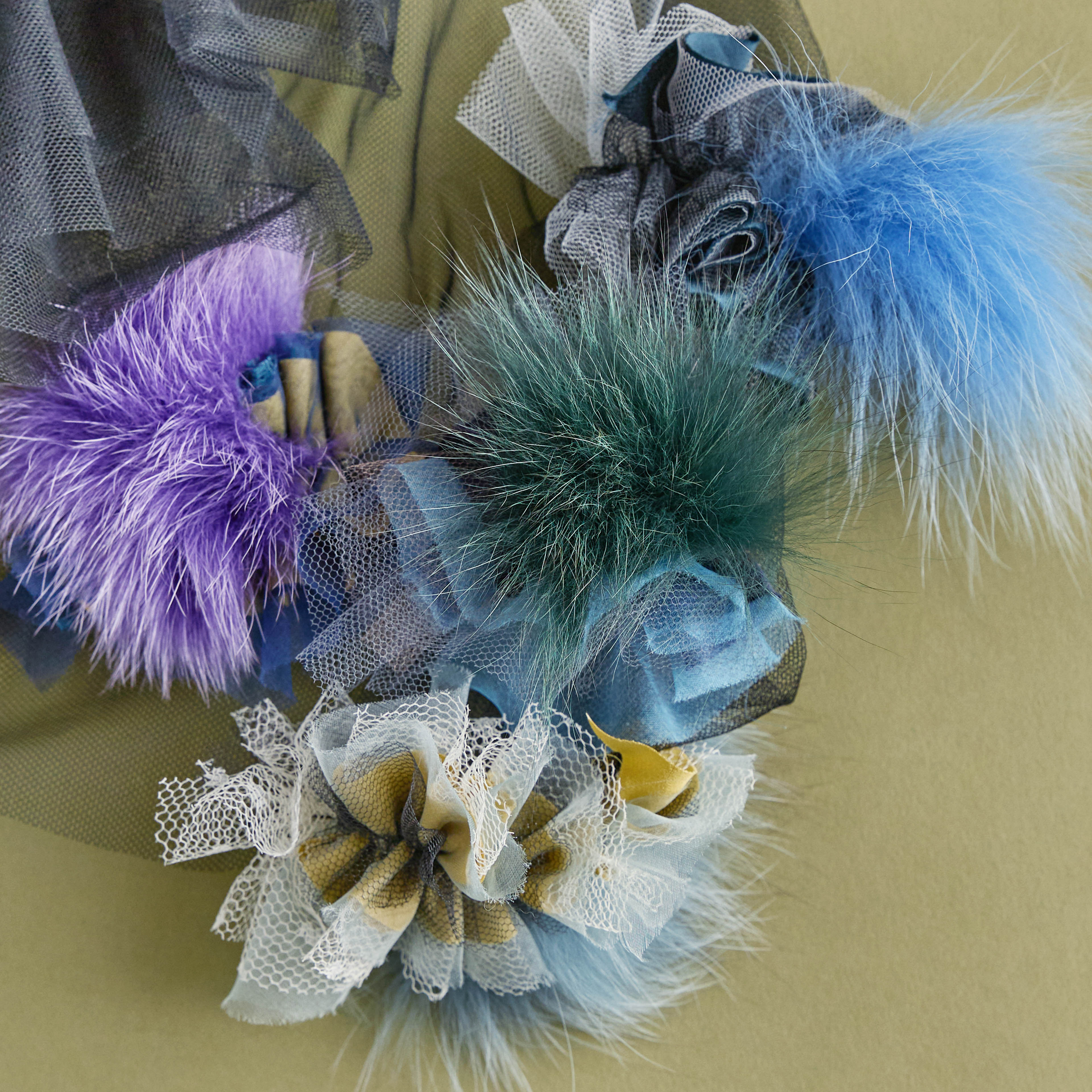 CIRQUTUREのものづくりから生まれた布のかけらを、大切に切り取り、組み合わせて飾り付けています。チュール、レース、オーガンジー、フォックスファーパーツなどを使用し、同じものはひとつとして存在しません。布のかけらから生まれる唯一無二の物語を紡ぐ飾りになっています。