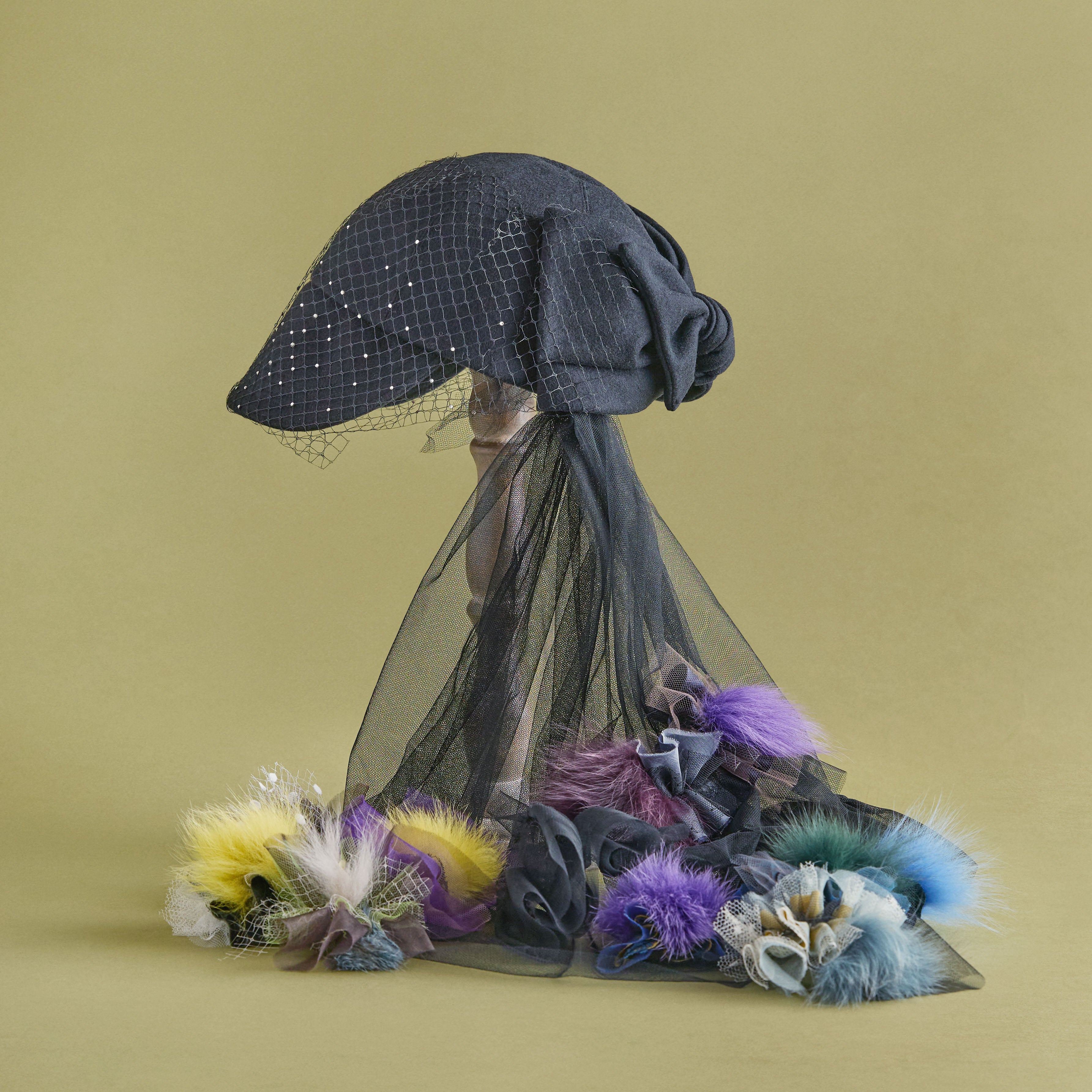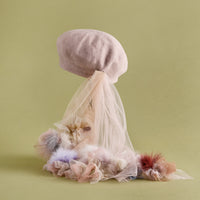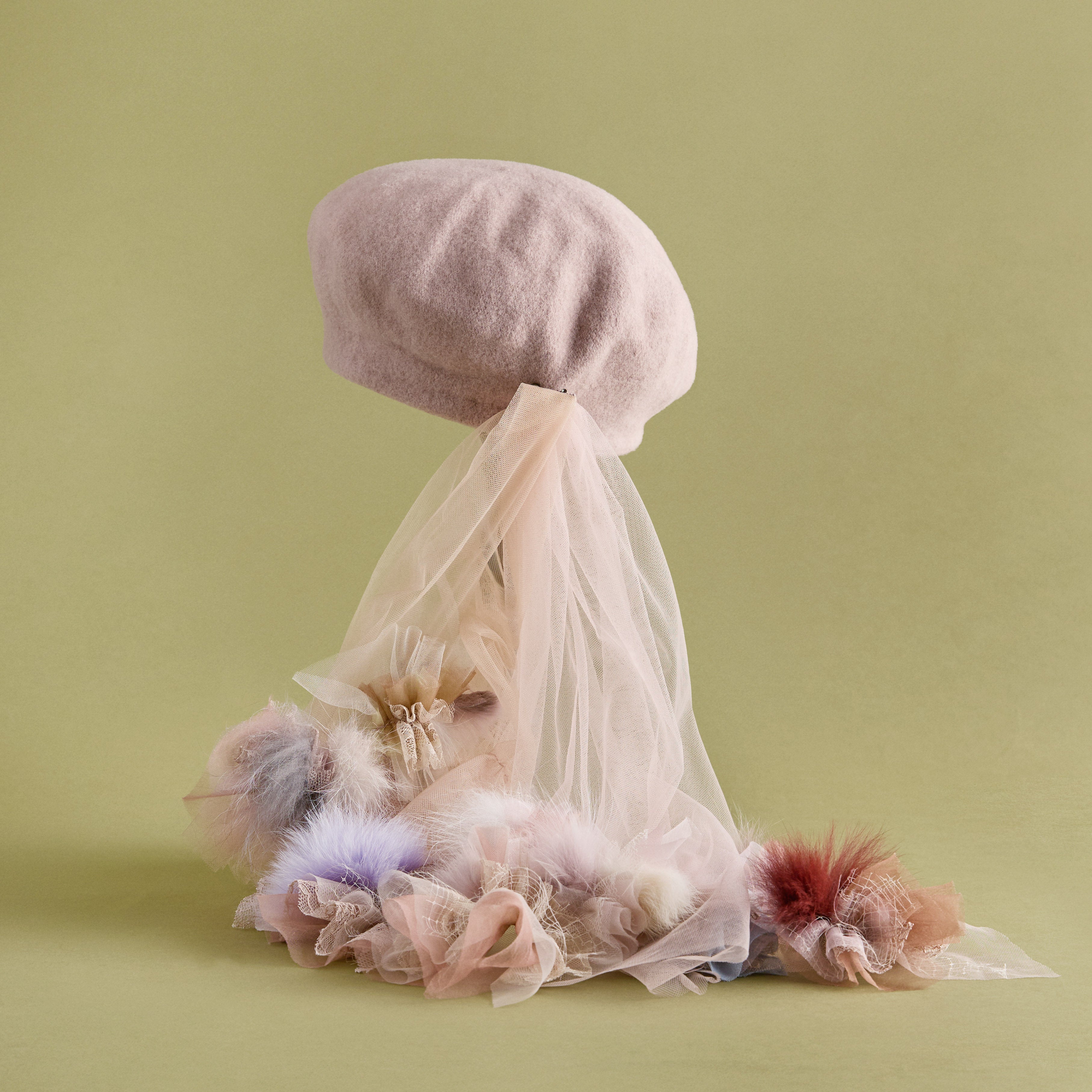 軽やかで繊細なチュール素材にフリルをあしらったヴェールブローチです。帽子やファッションアイテムにプラスして、自由な発想で身につけて楽しんでいただけます。