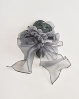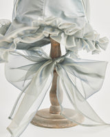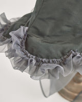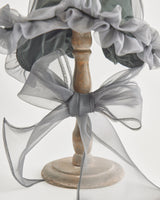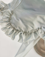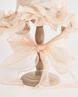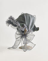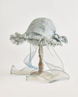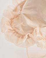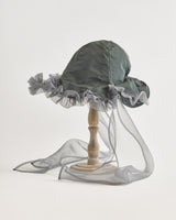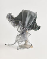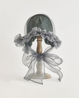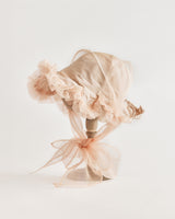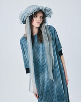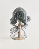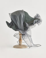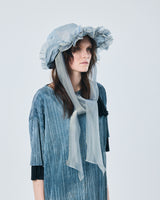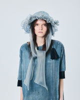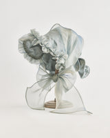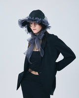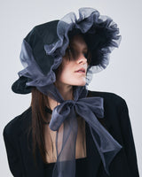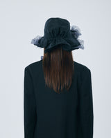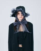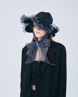 帽子全体を一輪の花に見立て、美しく立体的なシルエットをつくりました。つば先には、光をふわりと透かすオーガンジーのフリルをあしらい、花のようにやわらかな曲線と、ほのかに妖艶な陰影を描き出します。