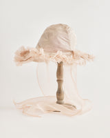 自由に形を変えるブリムは、その日の気分に寄り添う小さな相棒のよう。折り上げて動きを付けたり、顔まわりをやさしく包み込んだり、咲き方はあなたの気分次第です。付属のリボンは巻いたり、垂らしたりとアレンジができ、様々な表情をつくることができます。