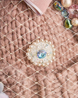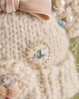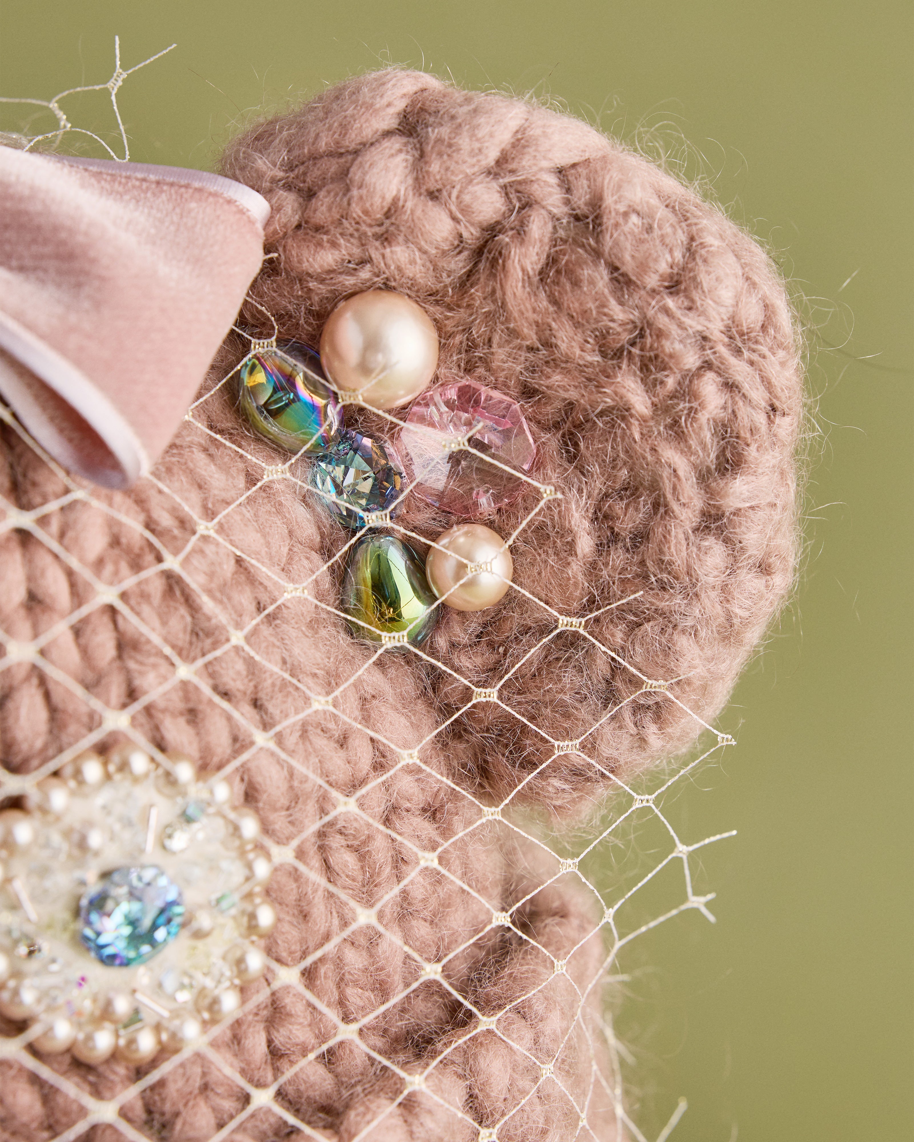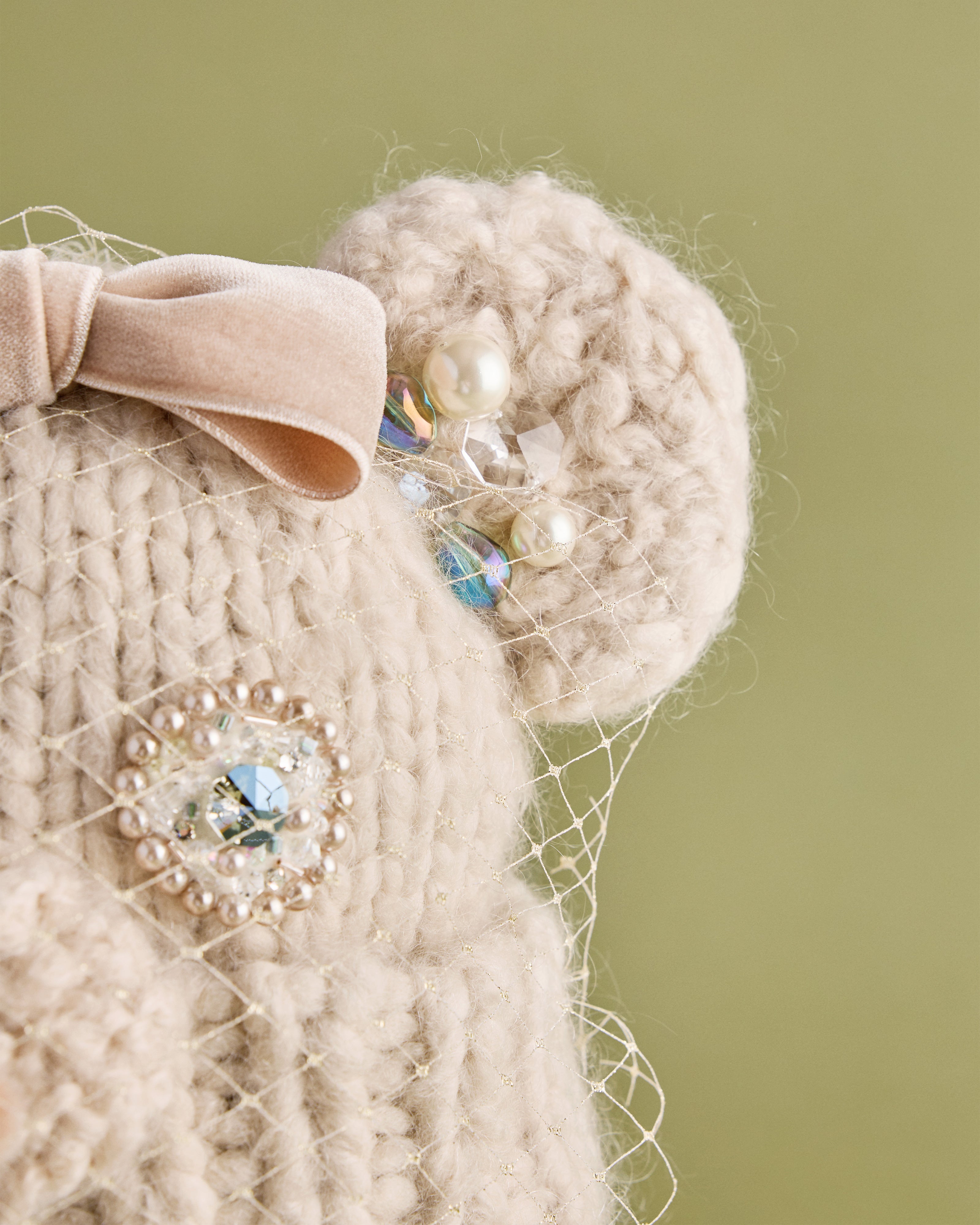 顔の細部にこだわりを凝縮。白目部分には土台を埋めるほどたっぷりのビーズを縫い付け、ほっこりした中にリッチな輝きを演出。黒目にはガラスビーズを使い、きらりと光るアクセントに。鼻は密かなハート型。その上には、さらに手描きのハートを重ねて、遊び心を添えました。口もと「むにゃむにゃ」の表情は、子供の頃に見たアニメの動物の記憶からインスパイアされています。