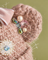被りやすさの工夫として、折り返し部分を作ることで厚みを出し、「ニット帽が似合わない」と感じる方にも心地よくフィット。さらにラメチュールをニット本体から少し覗かせることで、エレガントな要素をプラスしました。ラメチュールやビジューのきらめきを添えたことで、カジュアルすぎず、普段スポーティーな服装を選ばれないお客様にも心地よくフィットします。