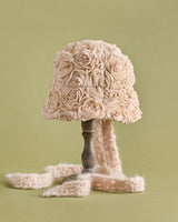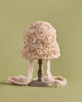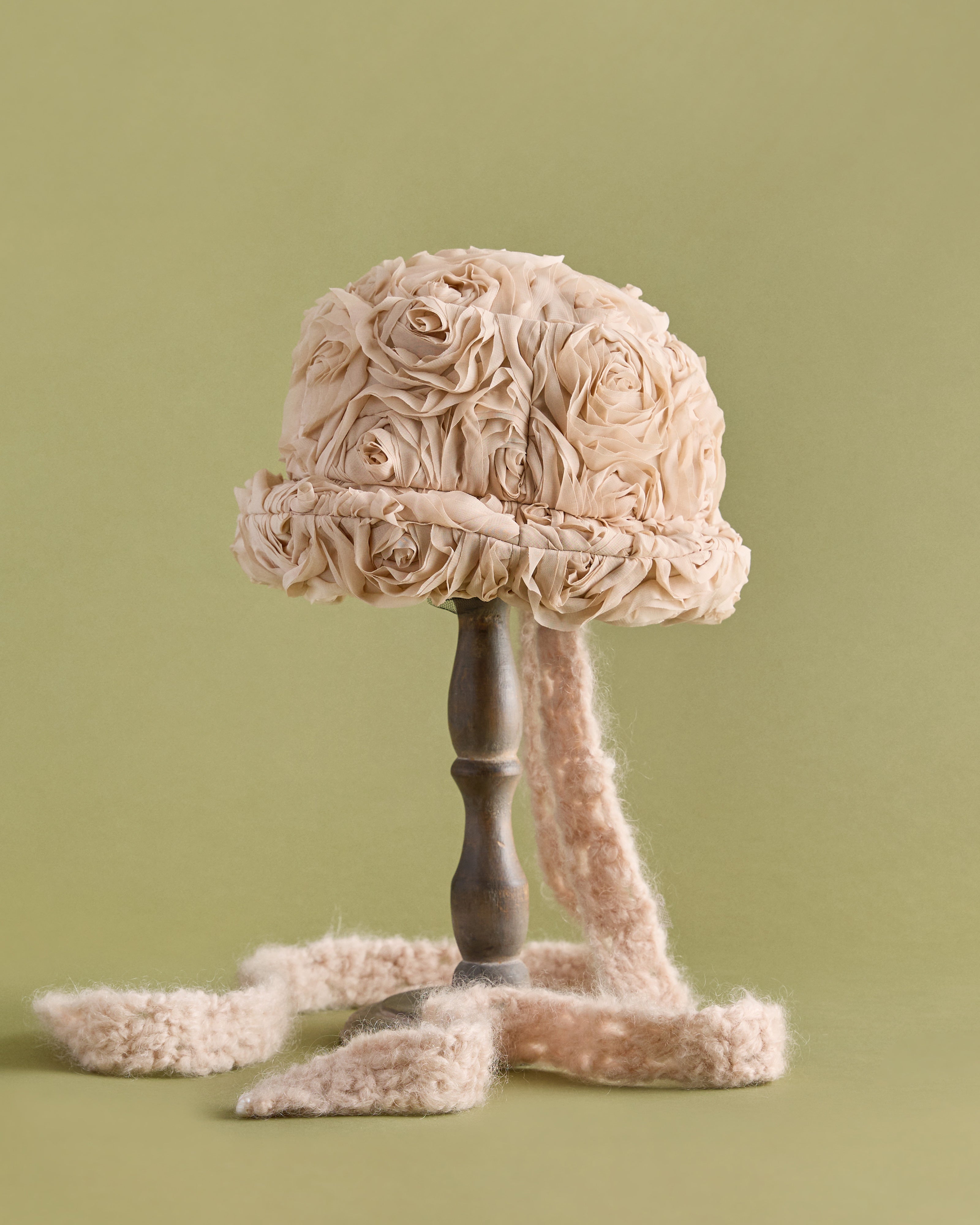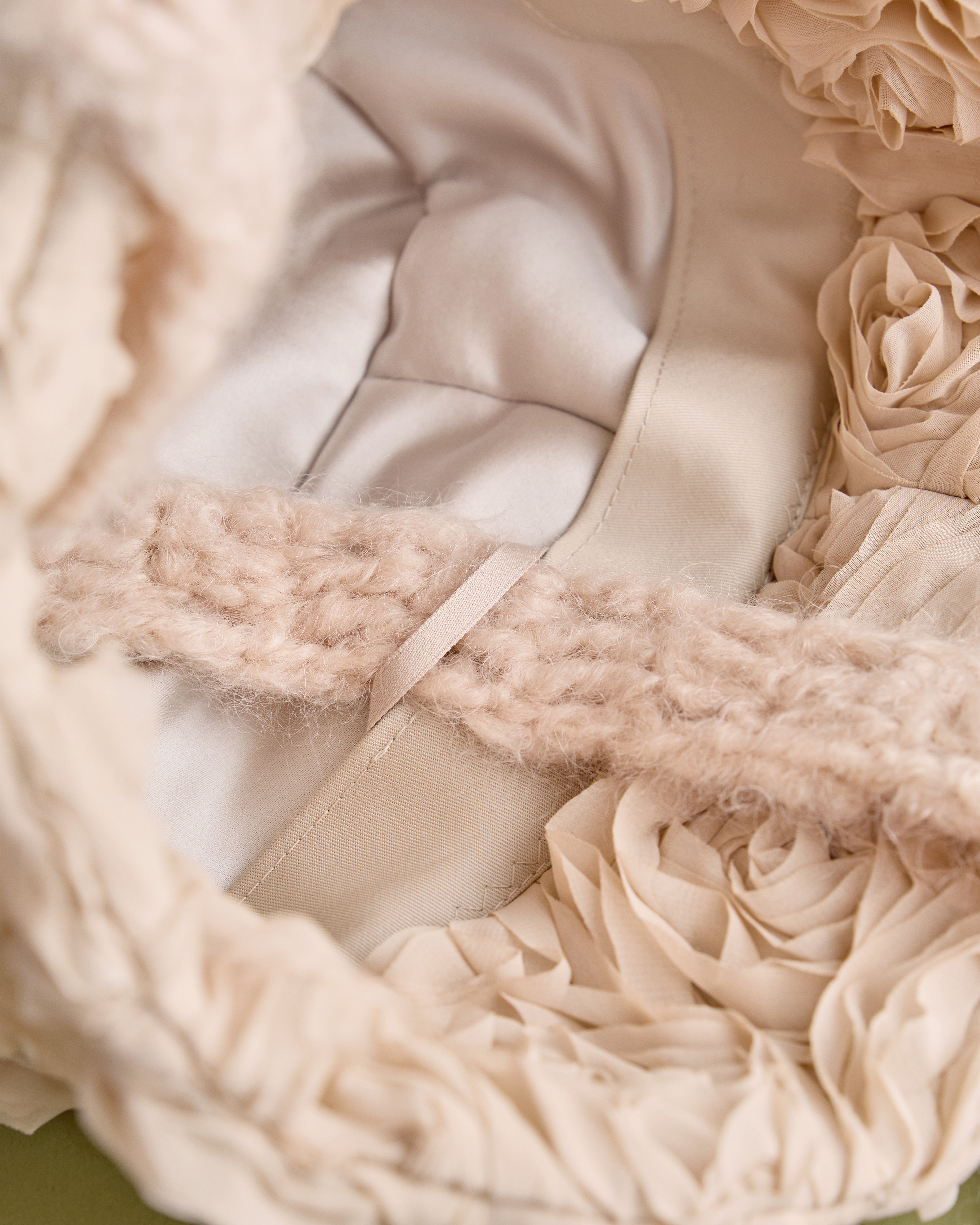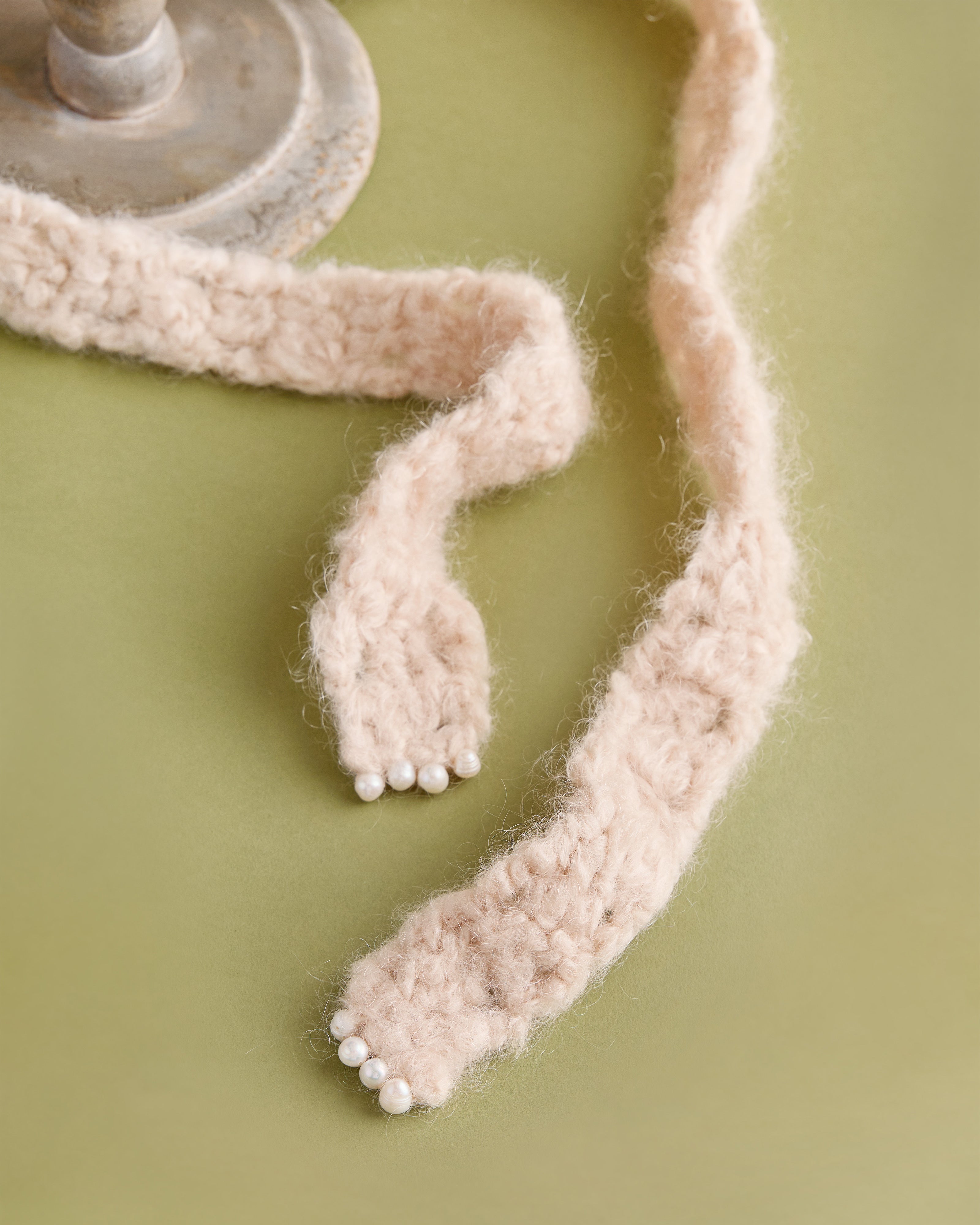 手編みのマフラーを思わせる、可愛らしいボリュームのある顎紐。モヘア毛糸で手編みしています。顎紐の先端には天然パールをあしらい、上品な優しさをプラス(ループ式で容易に取り外し可能。帽子本体にリボンとして巻いても可愛らしくアレンジできます)。