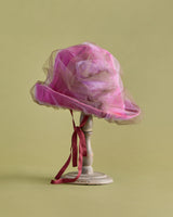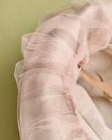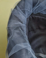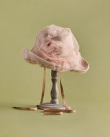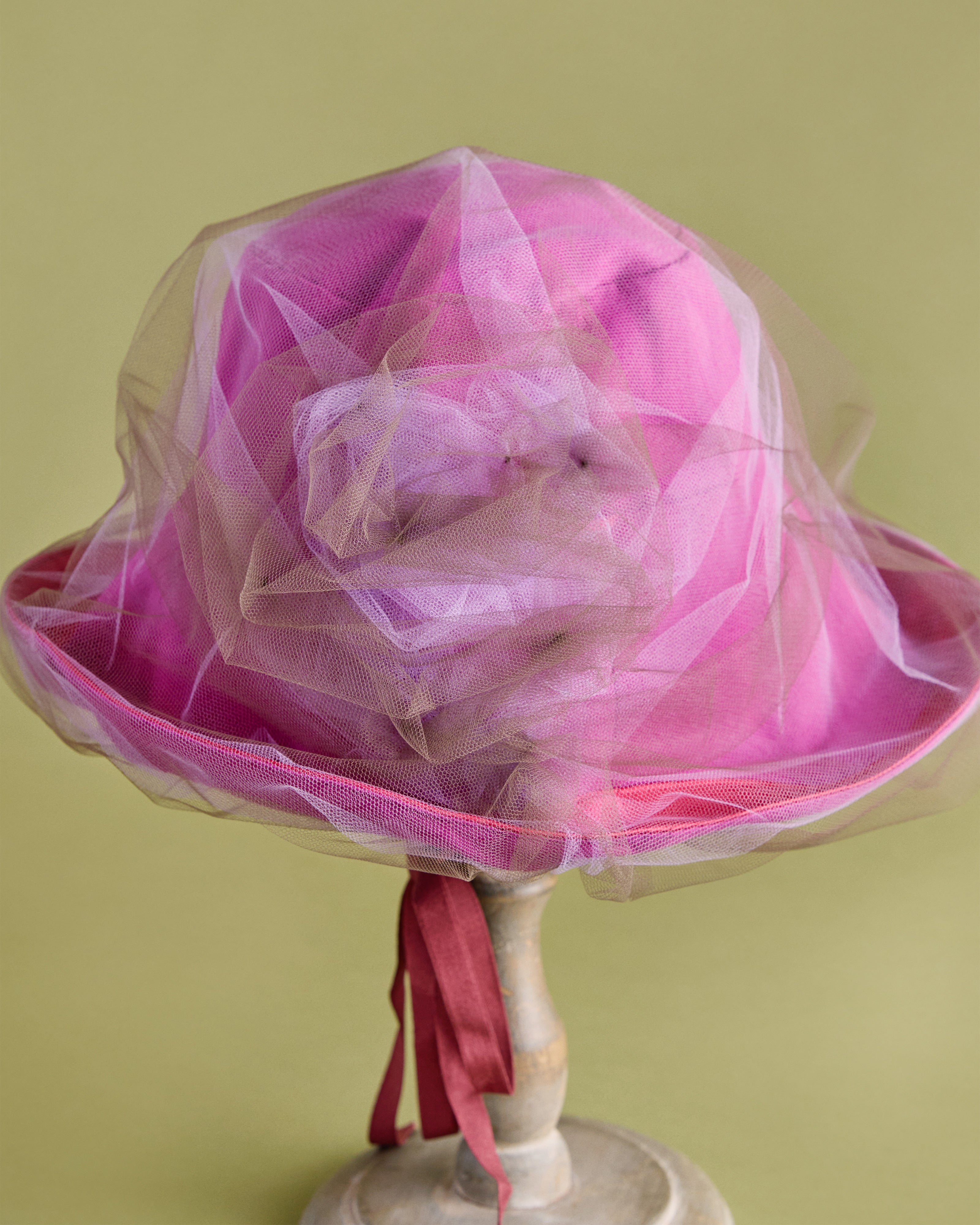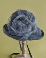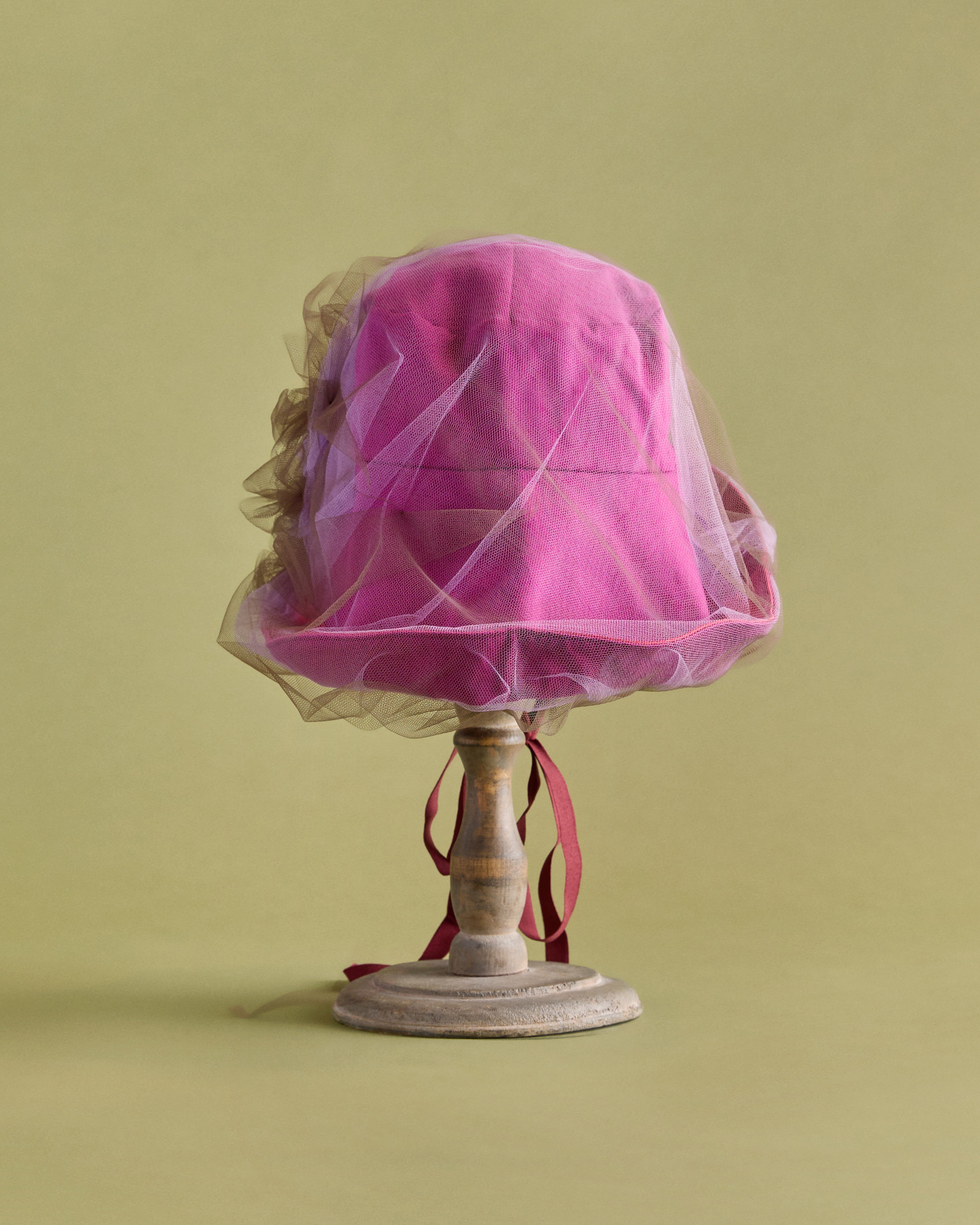 抽象的でありながら、どなたが見ても薔薇と分かる華やかさがあります。2色のチュールから生まれる色の奥行きは、幻想的なムードを漂わせ、ふんわりとしたボリューム感が小顔効果を演出します。さらに、本体の帽子には紫外線カット効果の高い素材を使用。エレガントでありながら機能性にも優れ、季節を問わず1年中お楽しみいただけます。