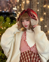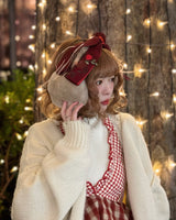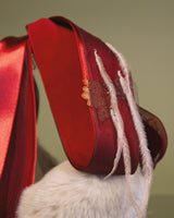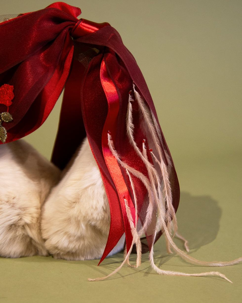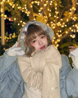 ・リボンは所々、イヤーマフラー本体と縫い留めしております。その部分を強く引っ張ると縫い外れてしまう可能性がございます。またとても繊細なリボンですので、何かに引っ掛けますと傷が付きやすいです。
