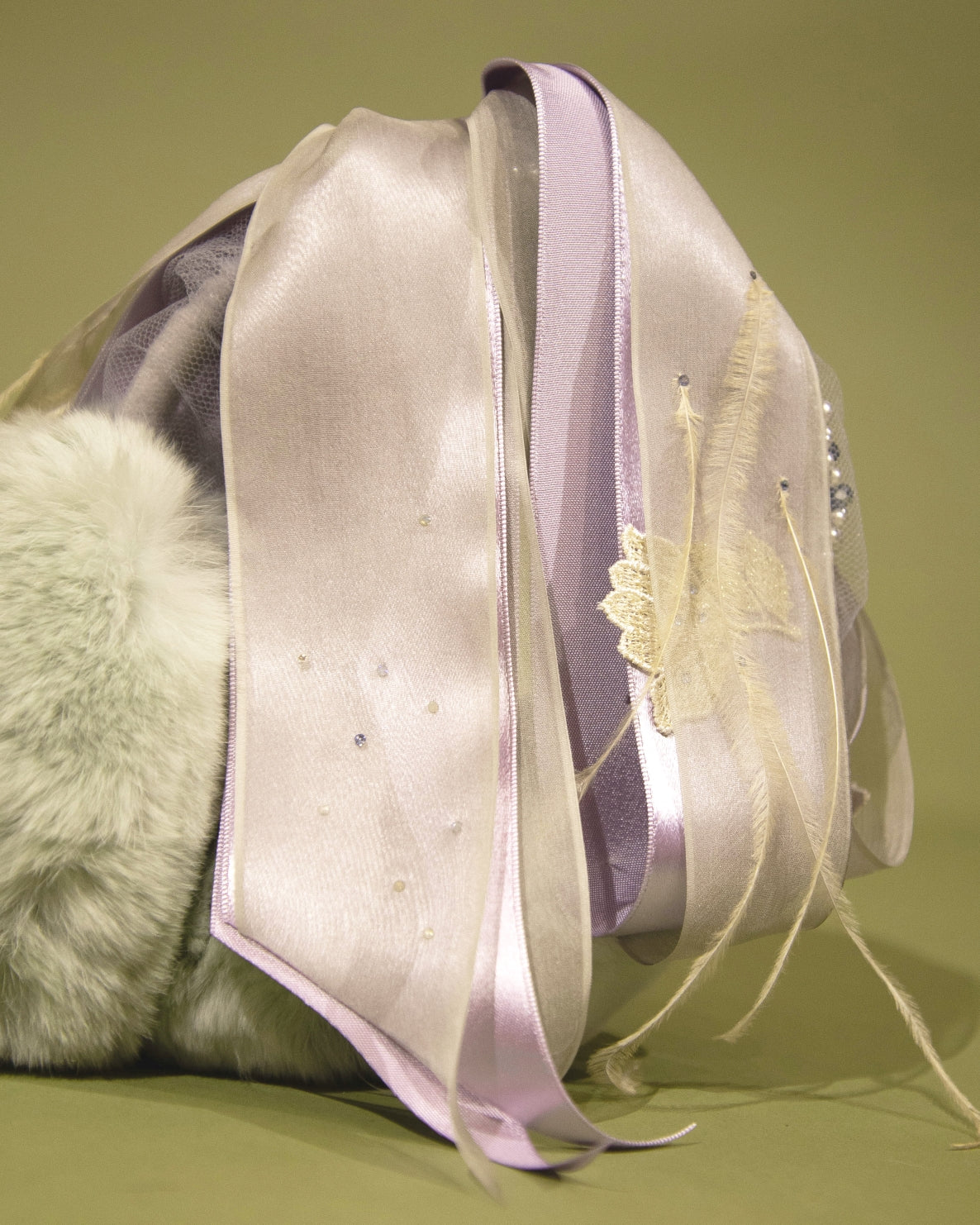リボン部分には、光沢とナチュラルさを併せ持つサテンリボンに、シルク製のジョーゼットリボンを重ね、そこにフランスで生まれた繊細な花刺繍のモチーフを添えました。