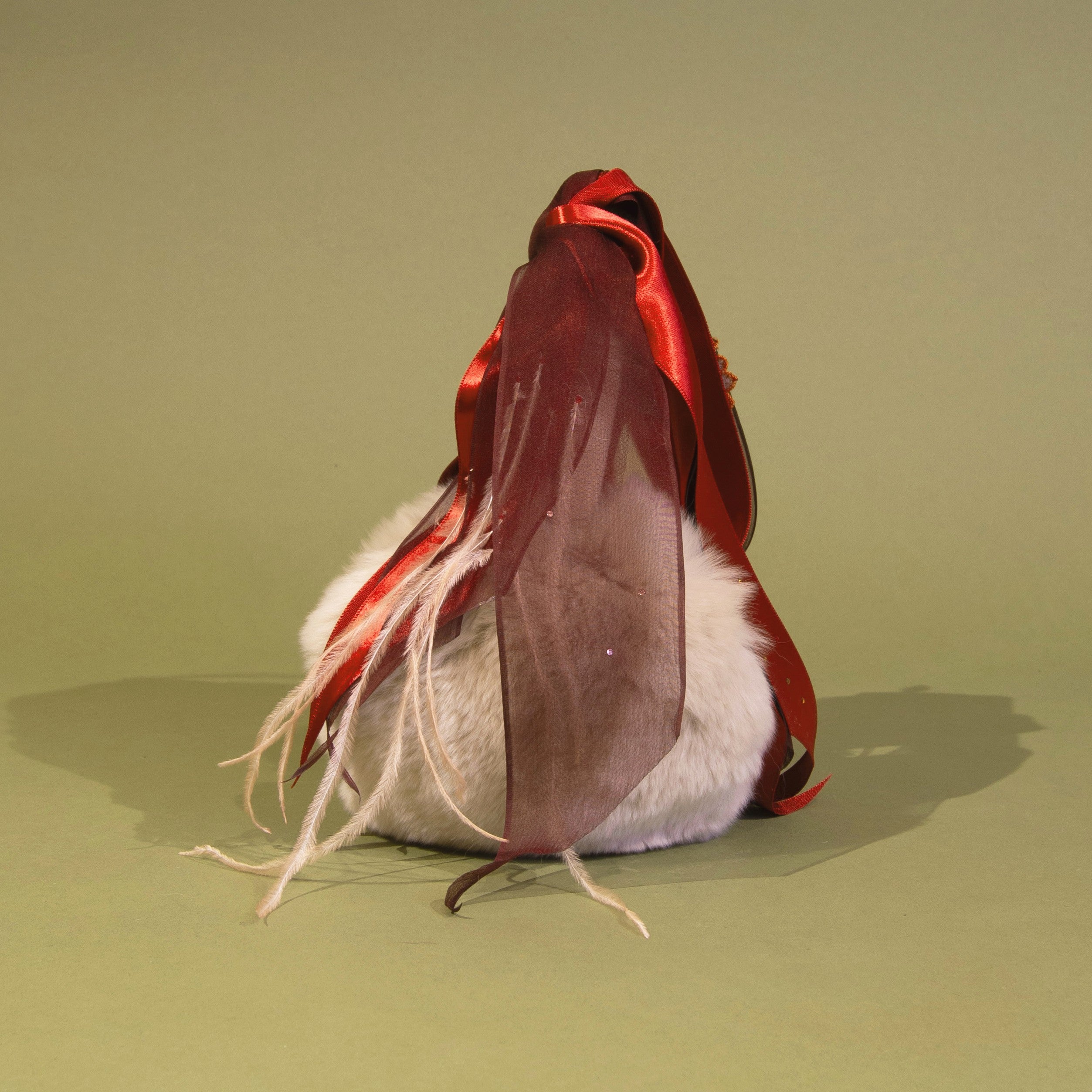 さらにアクセントとして用いているのは、毛足が長く優雅な面持ちのオーストリッチフェザー。主に翼に生える羽のごく一部のみが装飾用として使われ、1羽から採れる良質な羽はごく限られています。しなやかで美しいラインを描くその羽に、小さなラインストーンの粒を添え、自然素材の優美さと、きらめきの共存を叶えました。