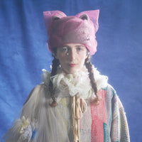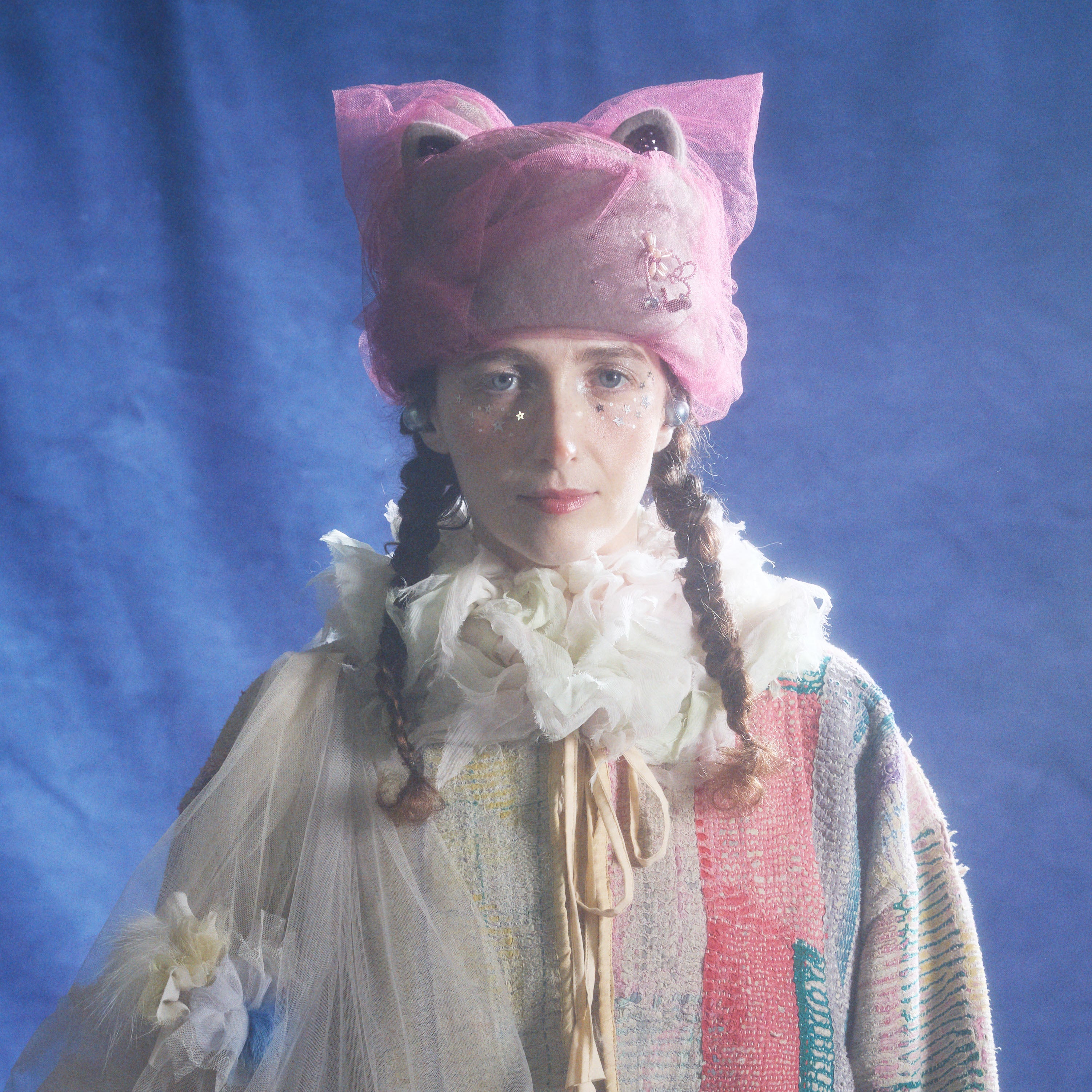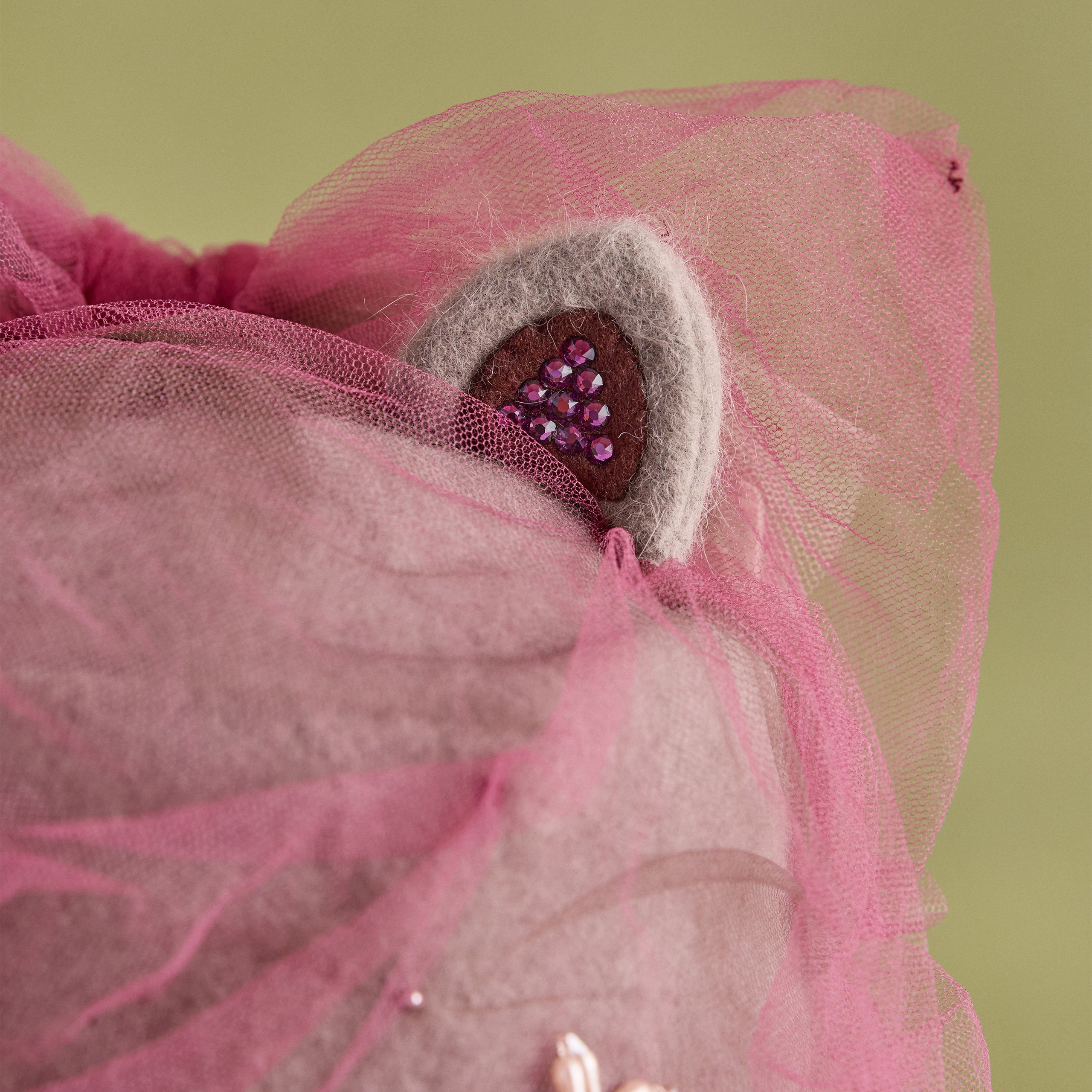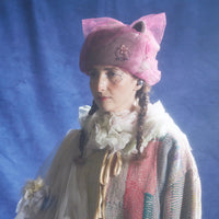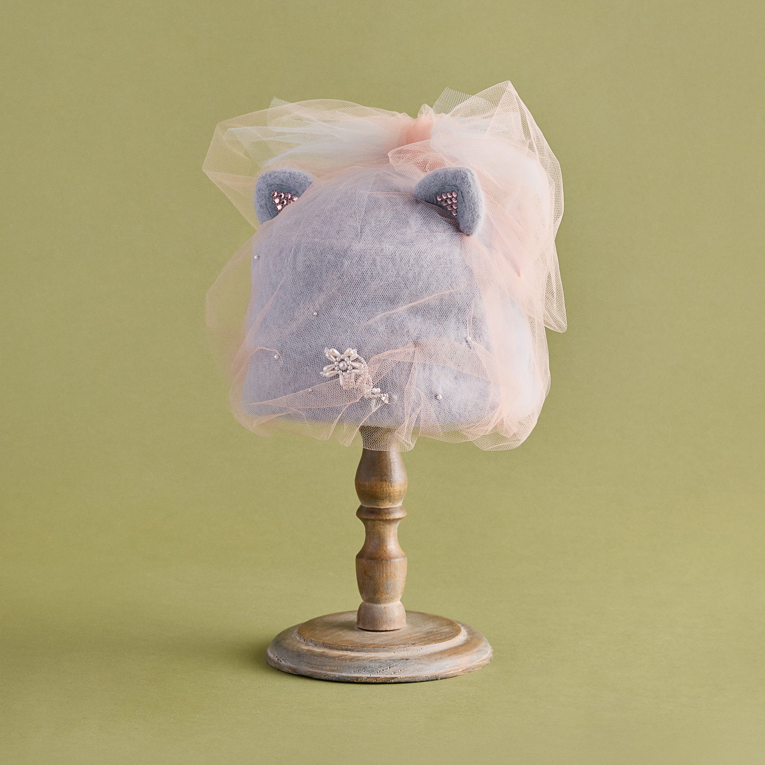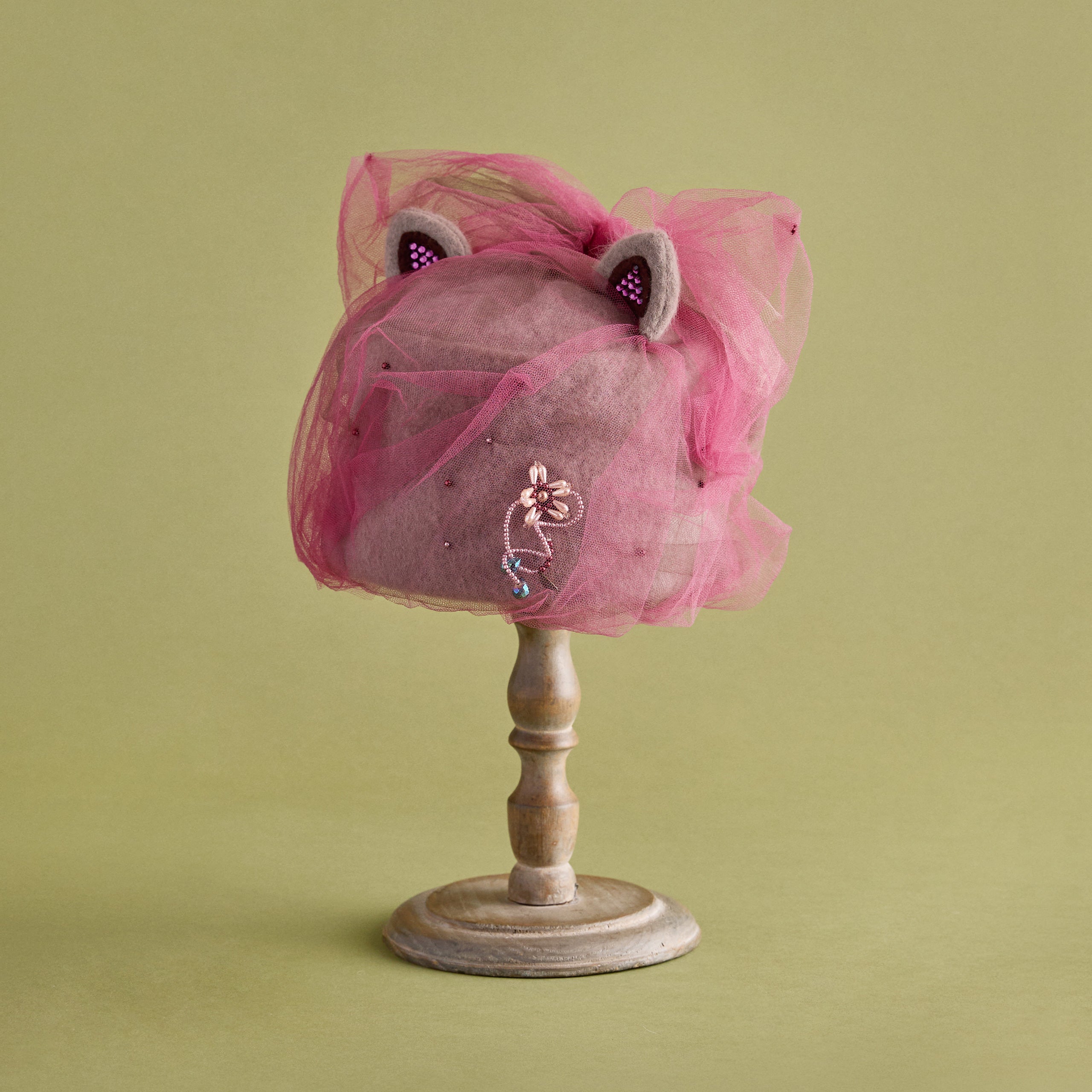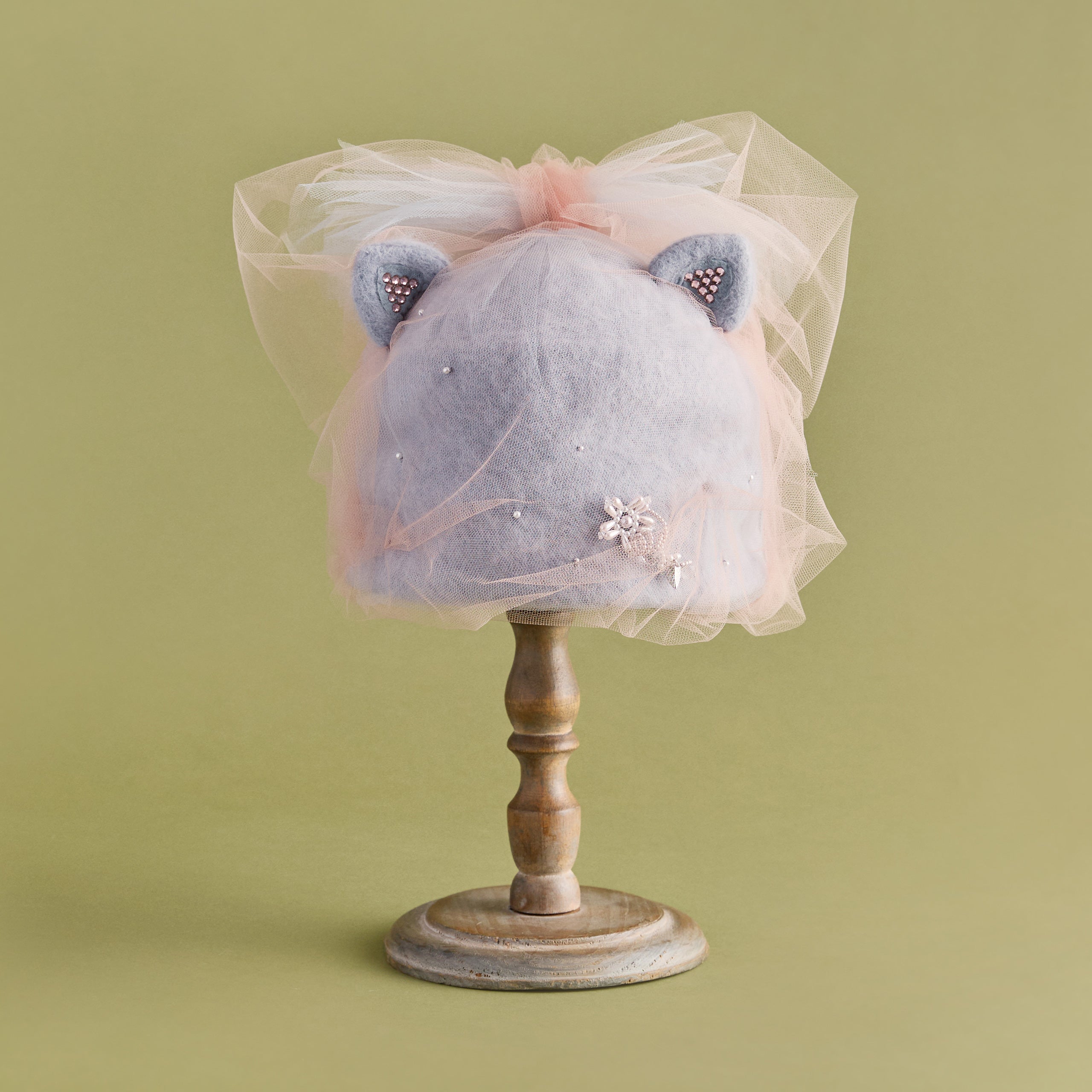 猫耳部分は2重仕立てで、小さな耳にはラインストーンをあしらい、さりげない輝きを添えました。背後には大きなチュールの耳が寄り添い、リボン飾りを兼ねた立体的な構造になっています。立体感と透明感、そして遊び心をあわせ持つファンタジックな一品。ニット帽のカテゴリーに属しますが、形がきちんと作られているため、被るだけで猫耳シルエットを楽しめます。
