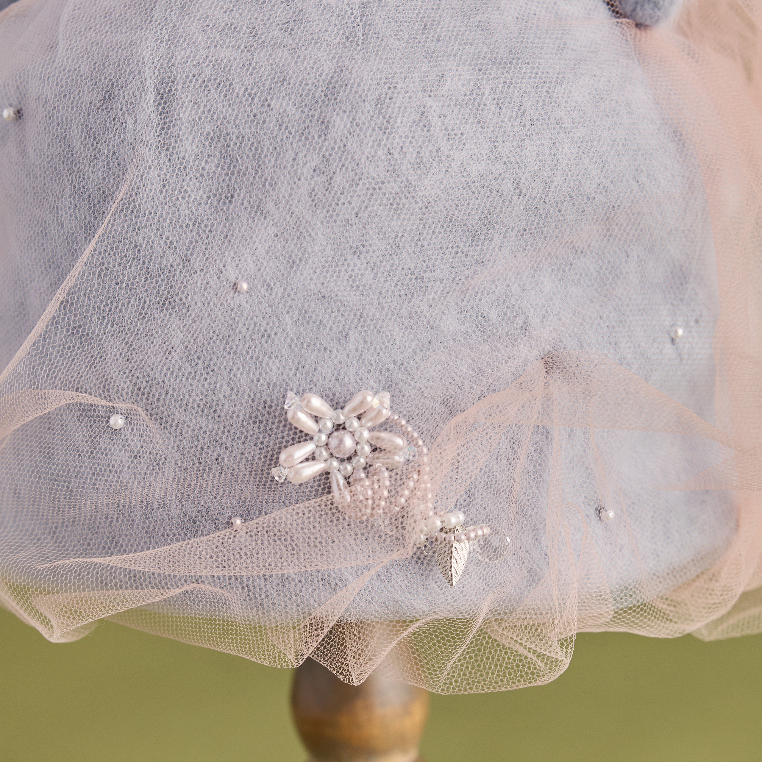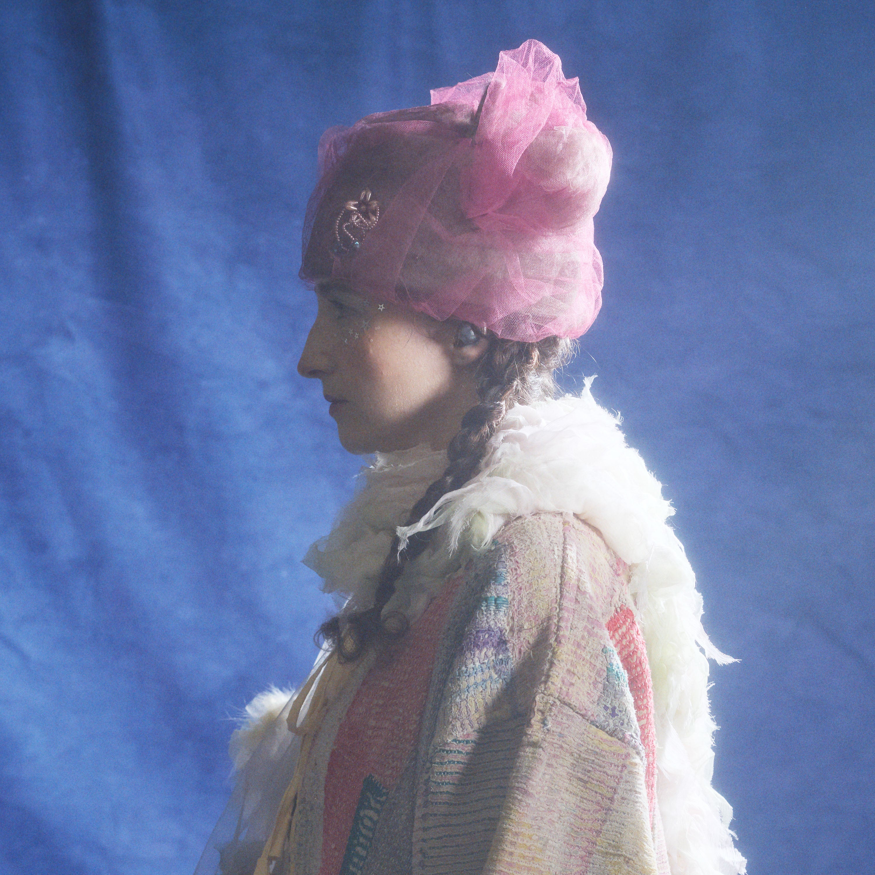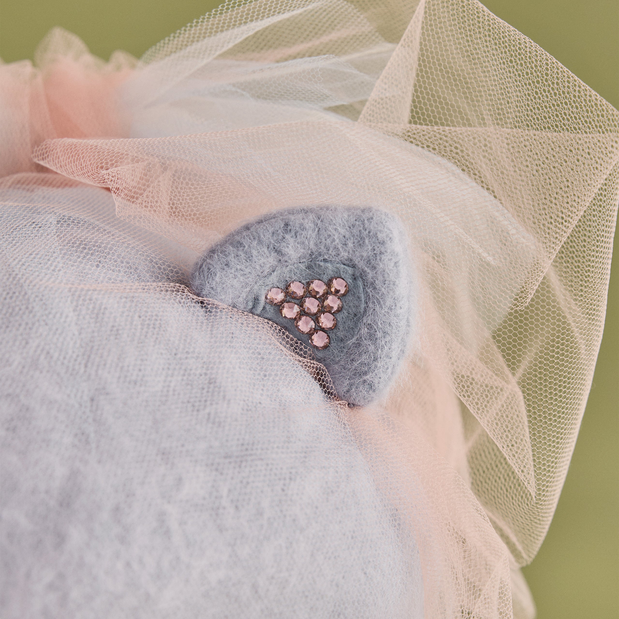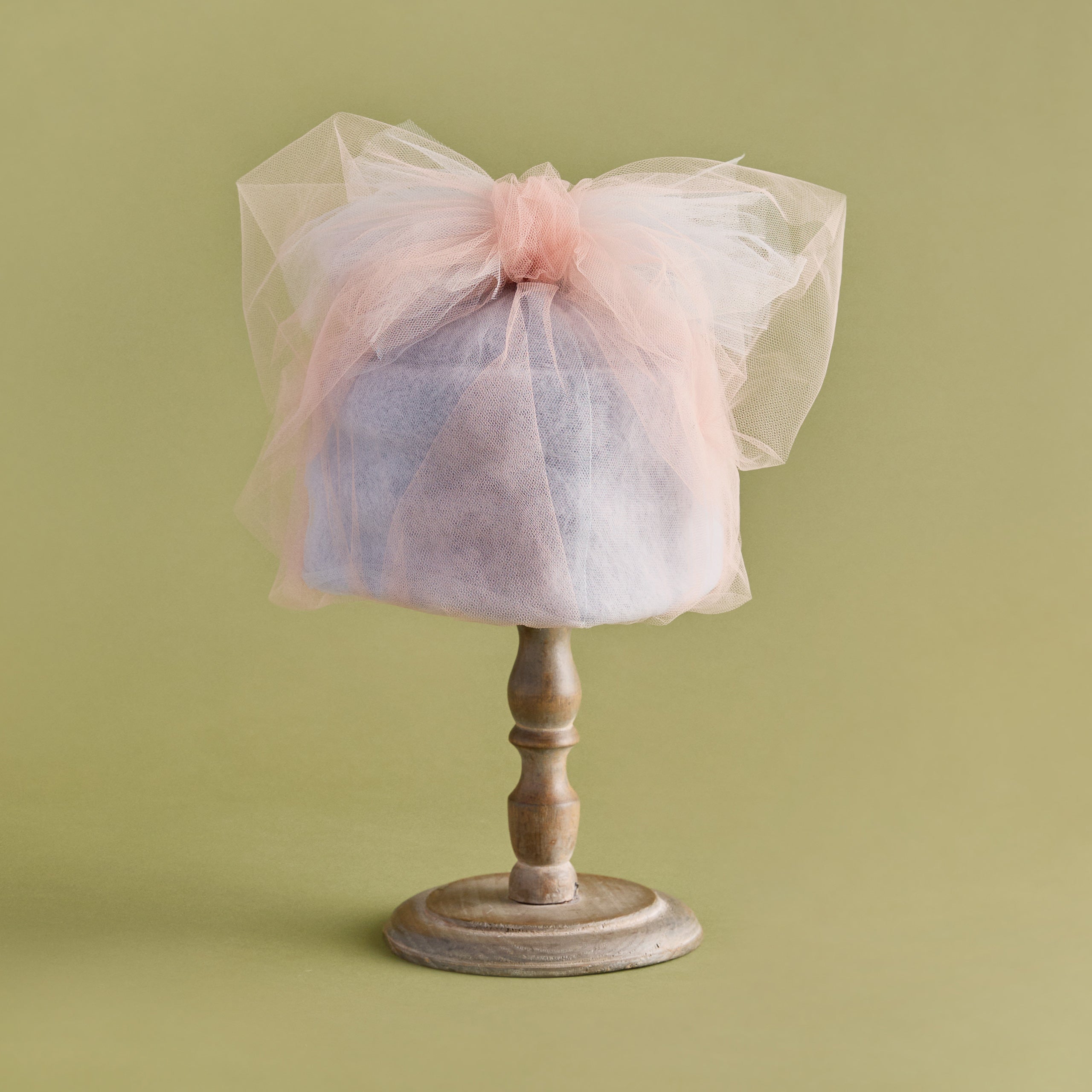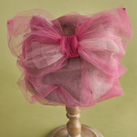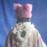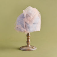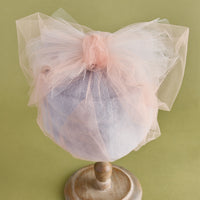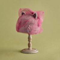 アンゴラ素材を縫製で立体的に構築した帽子を土台に、幻想的なチュールを纏わせたデザイン。