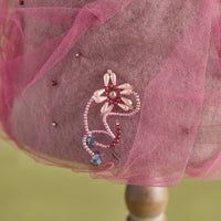チュールの中には「不思議な星座」をイメージした飾りを仕込みました。星座の飾りはビーズで表現しています。パーマネント加工のような手仕事を施し、揺れるたびに独特のきらめきを放ってくれるかと思います。動くたびにくるんと揺れる、その名もパーマネント星座。CIRQUTURE一座がテントを張る夜空に現れる風変わりな星座を表現しています。