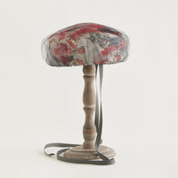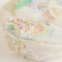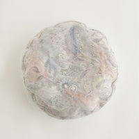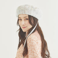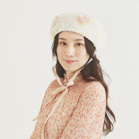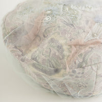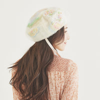 この銘仙のような夏の涼やかな生地をベースに、フランスの高級レースメーカーSOLSTISS社のスイートなレースパーツやスパンコール刺繍のパーツを合わせ、ベレーの中に小さな庭園を作り出しました。