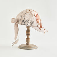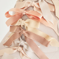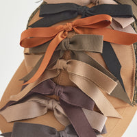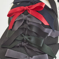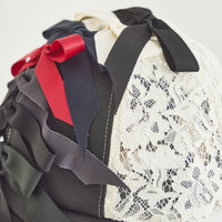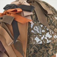 10個飾られたリボンは同じように見えて、実は少しづつ長さや色や付け位置が異なります。キャップの中心のラインをベースに、右に寄ったり左に寄ったり、斜めに傾いたり。そして一つだけがサテンのリボンになっています。