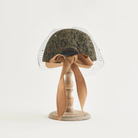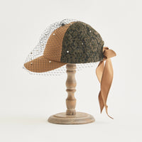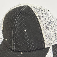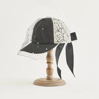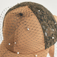 スポーティなCAPの型をベースに、マットなグログラン生地とレースを組み合わせ、スポーティな雰囲気とガーリーな要素を併せ持つキャップに仕上げました。パールを手仕事で留め付けたベールをまとっています。