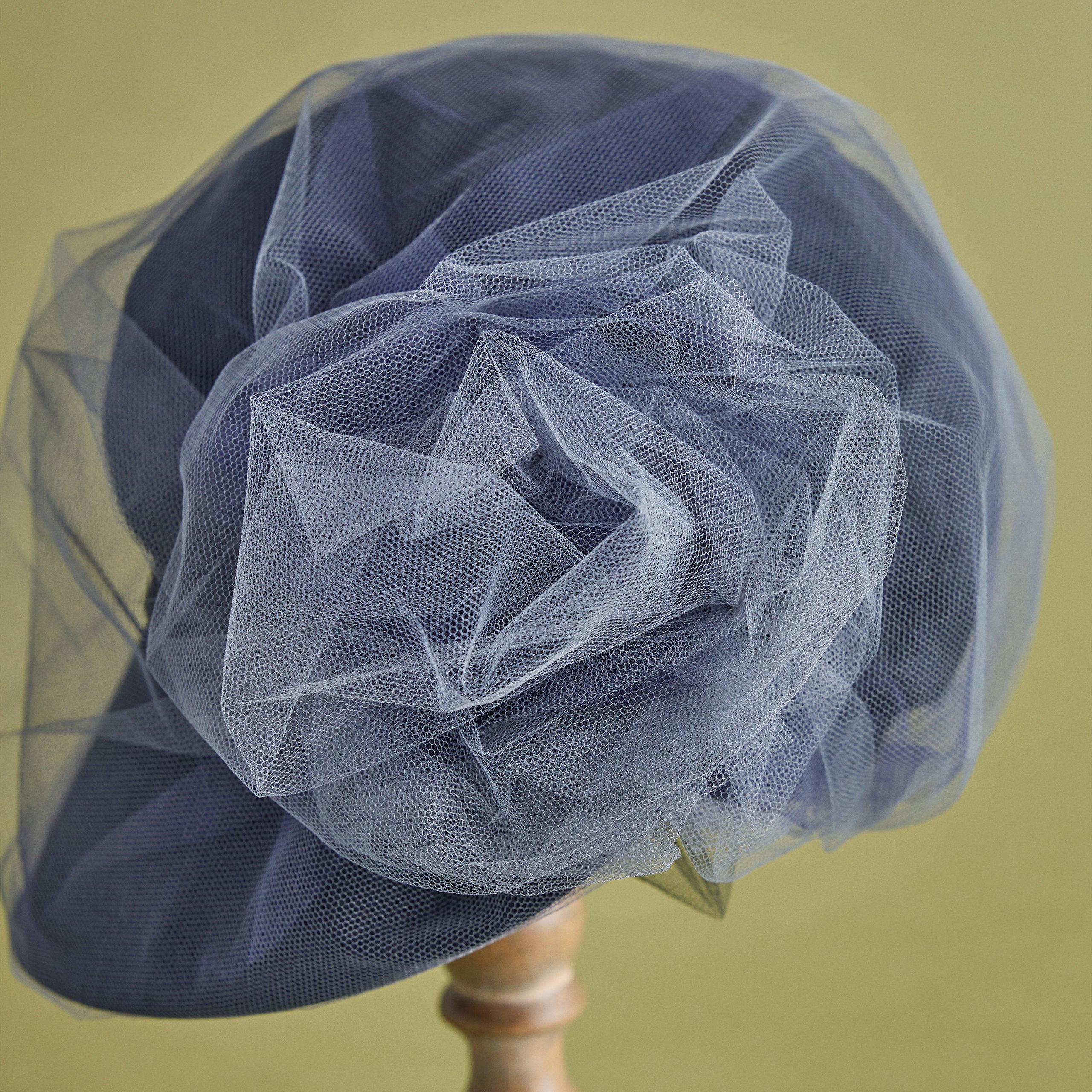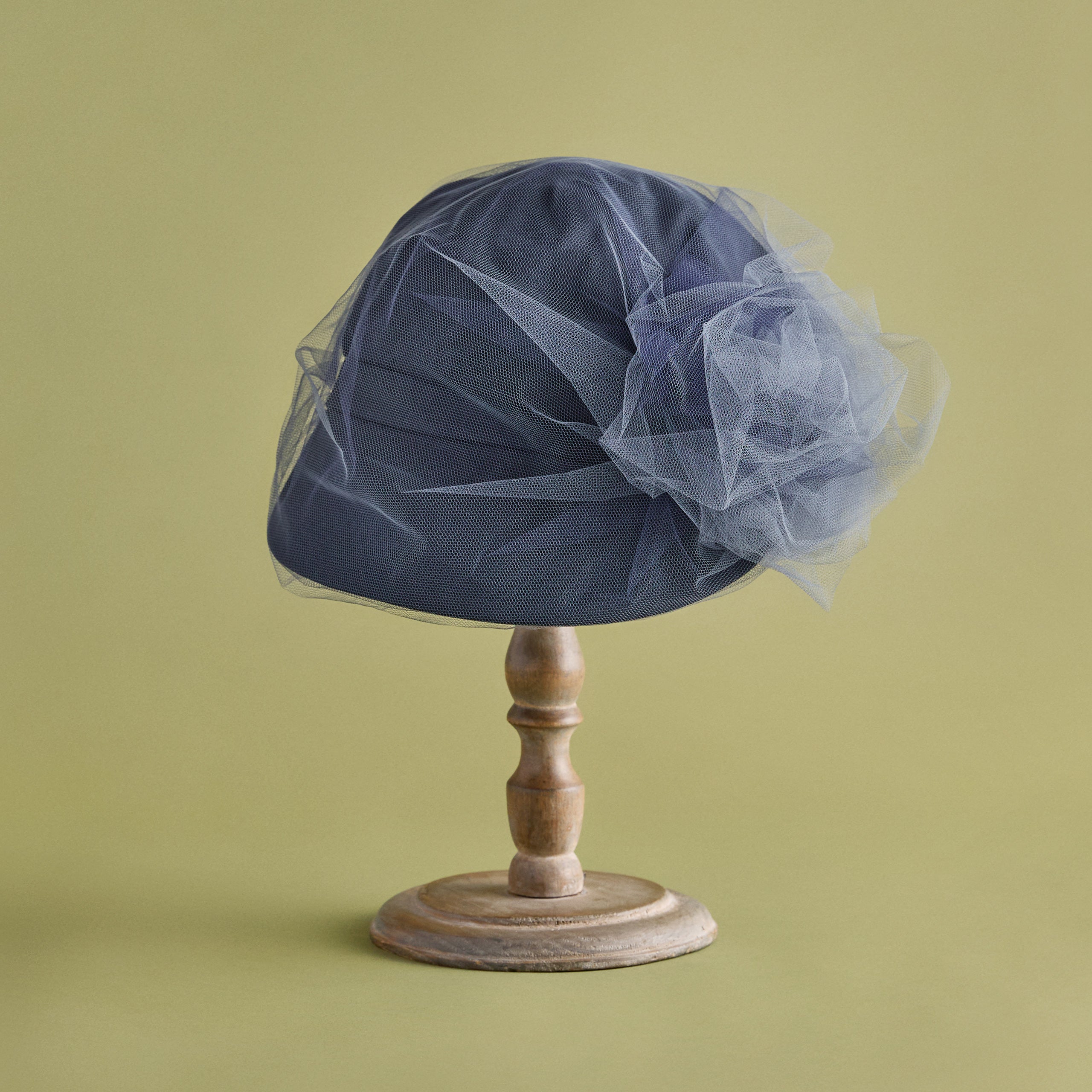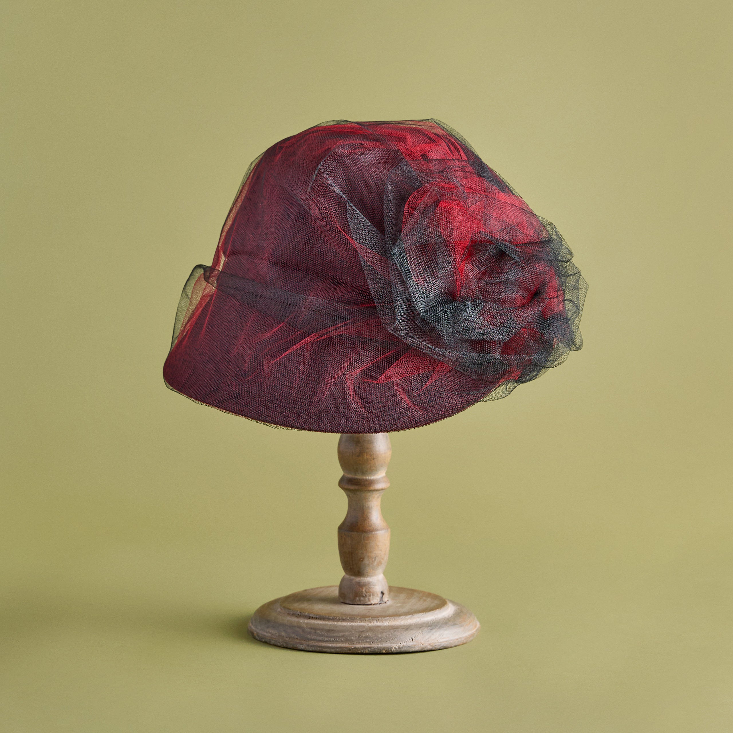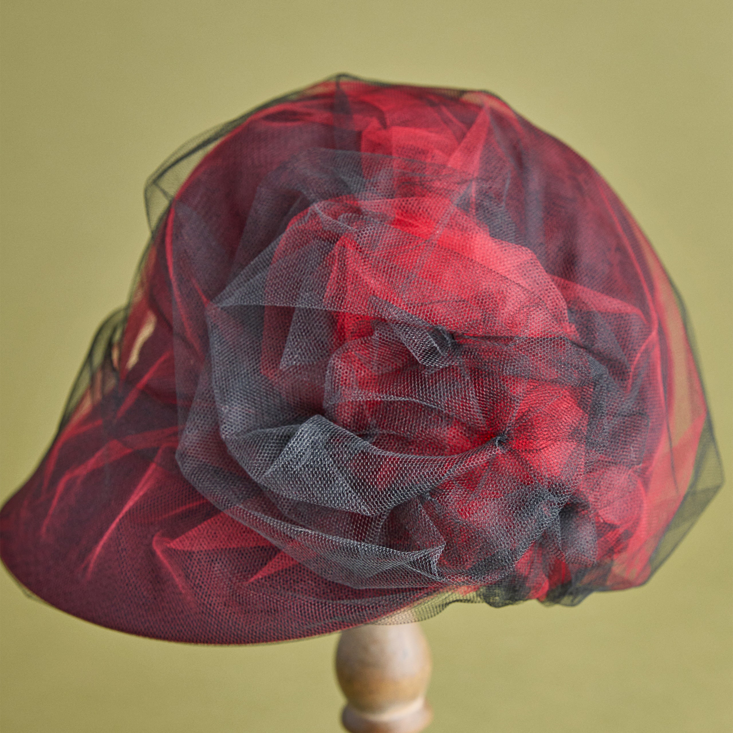 帽子をキャンバスに見立て、2色のチュールを重ね合わせ、抽象と具象のあいだを漂う薔薇を描きました。ワーカースタイルを思わせるステッチミシンの力強さと、チュールの繊細な質感と薔薇のデリケートなディテールが交差し、相反するムードが絶妙なバランスで調和しています。