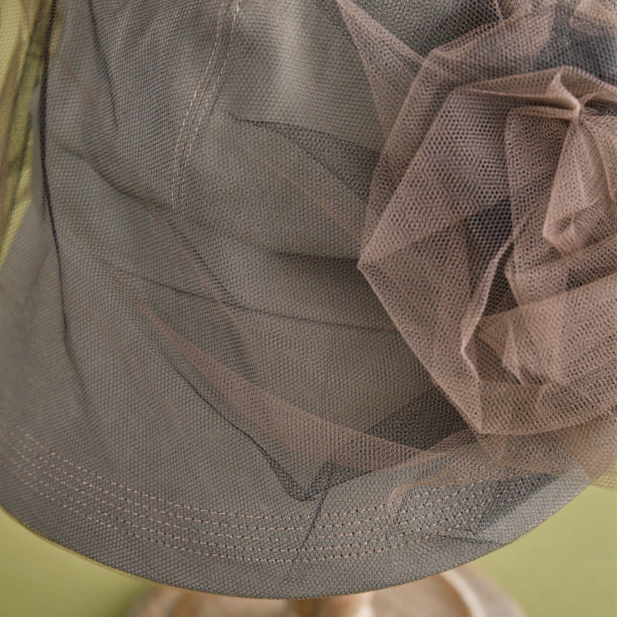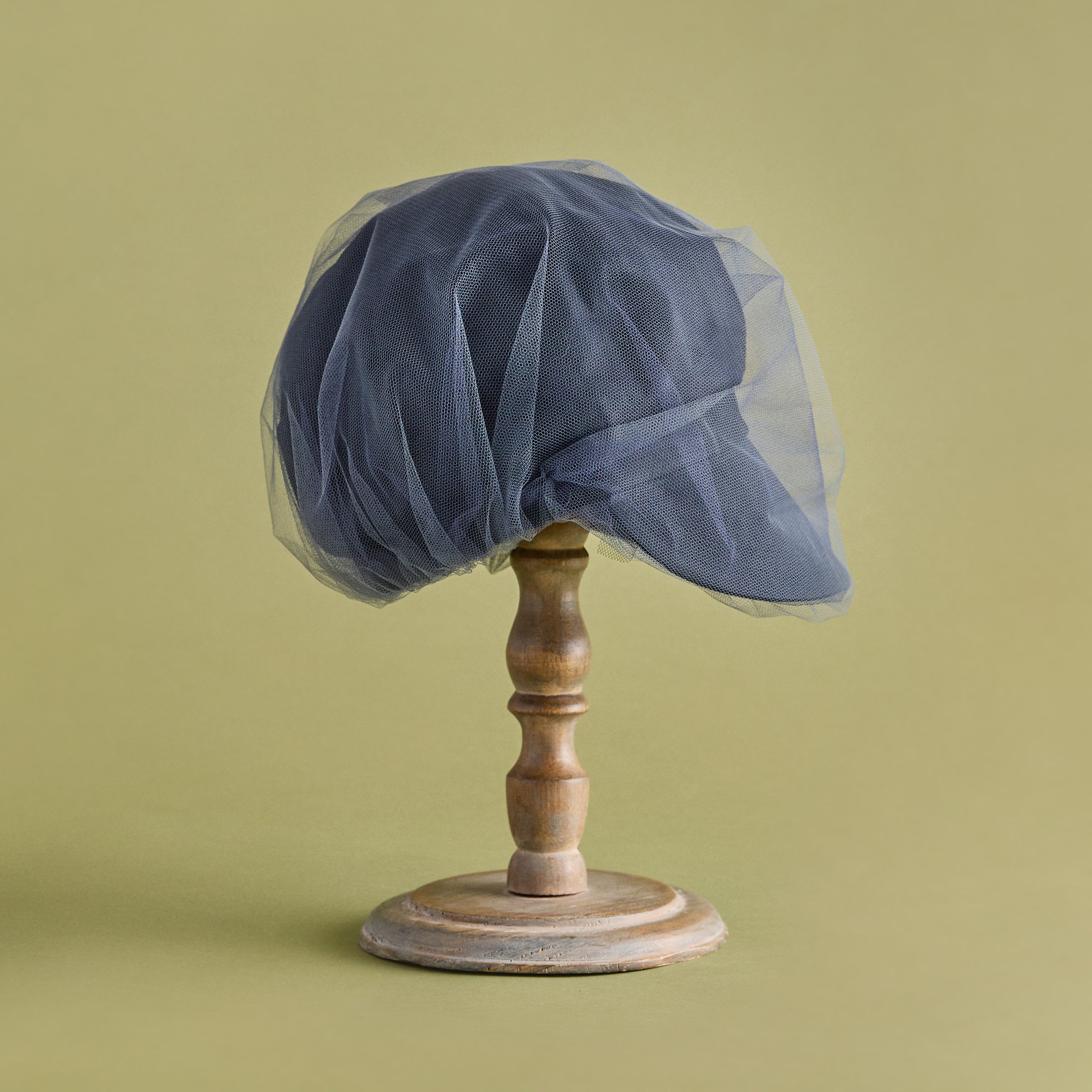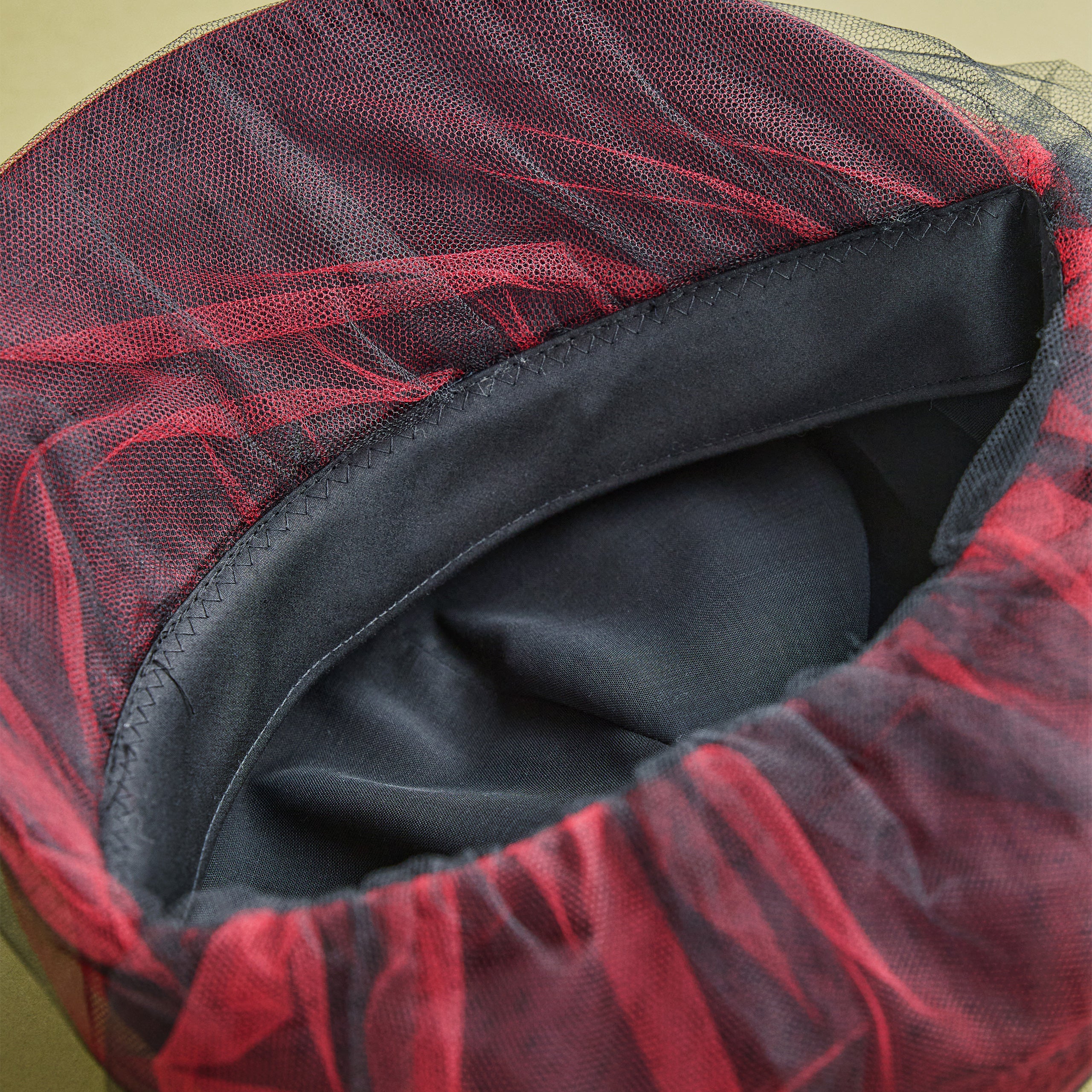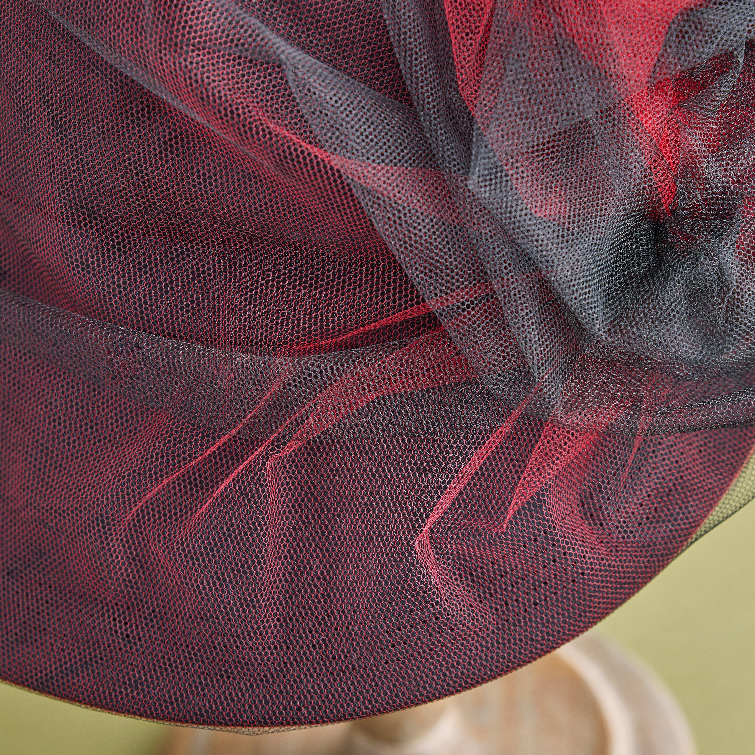 帽子をキャンバスに見立て、2色のチュールを重ね合わせ、抽象と具象のあいだを漂う薔薇を描きました。ワーカースタイルを思わせるステッチミシンの力強さと、チュールの繊細な質感と薔薇のデリケートなディテールが交差し、相反するムードが絶妙なバランスで調和しています。