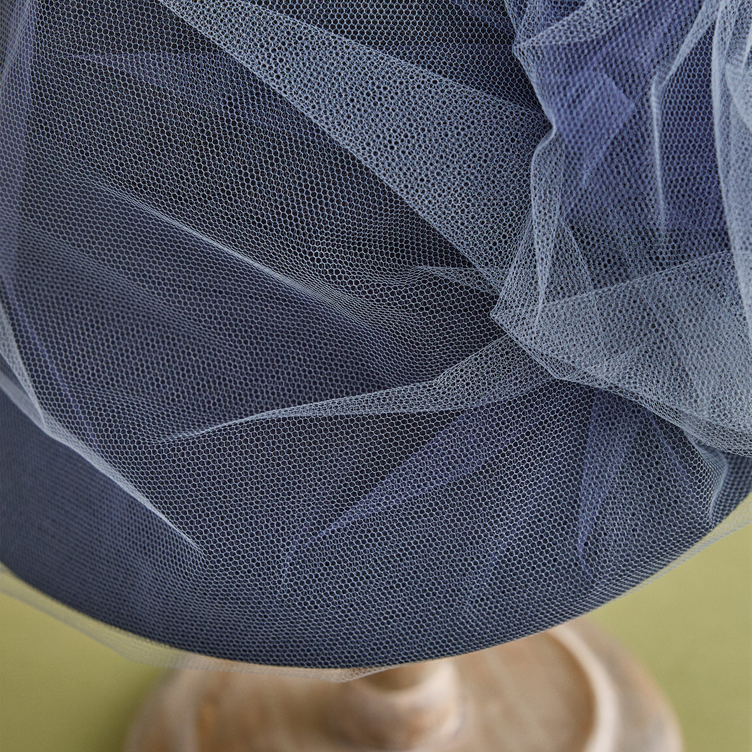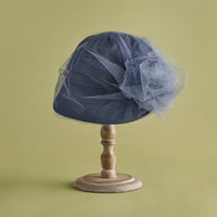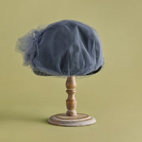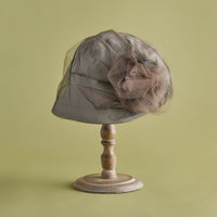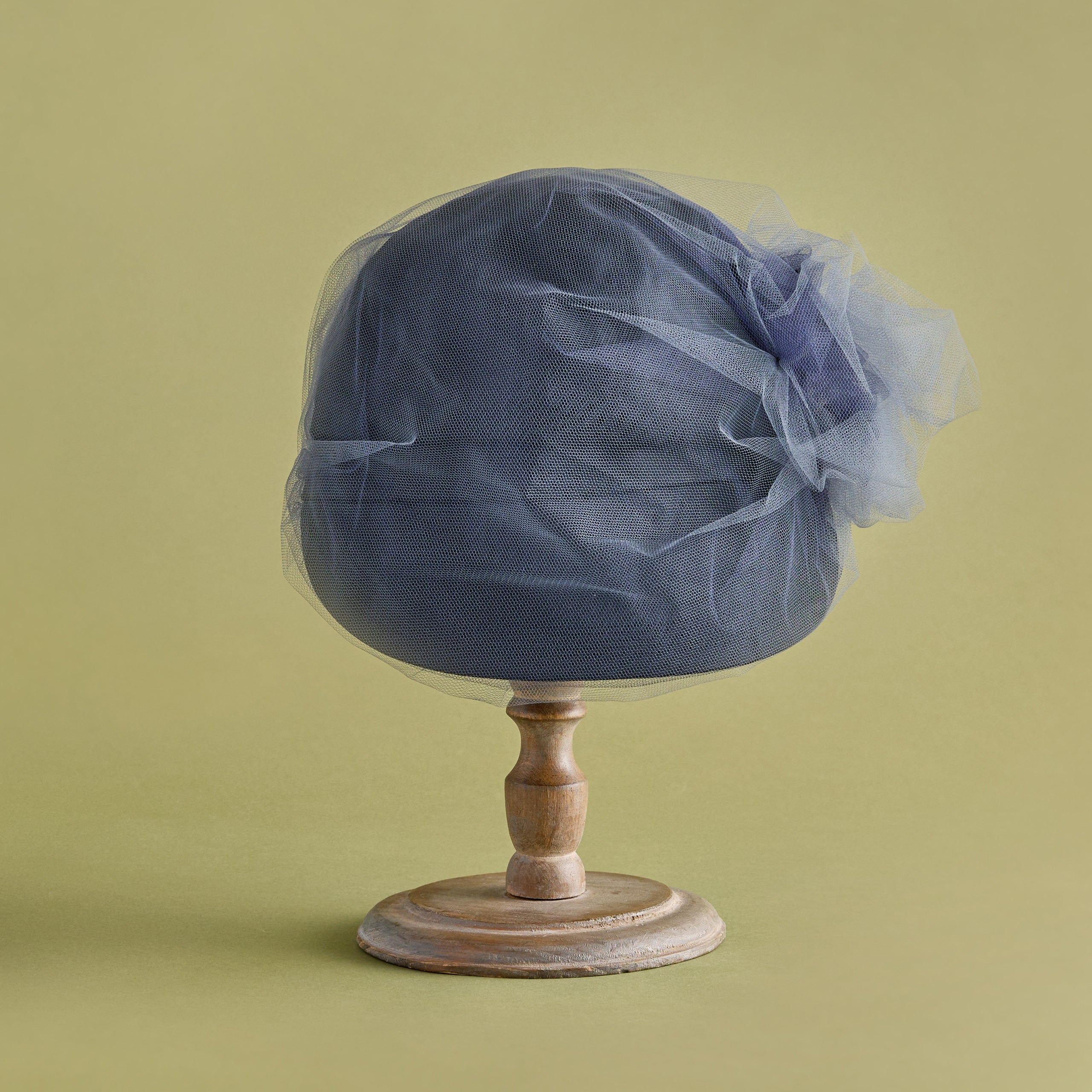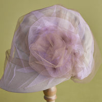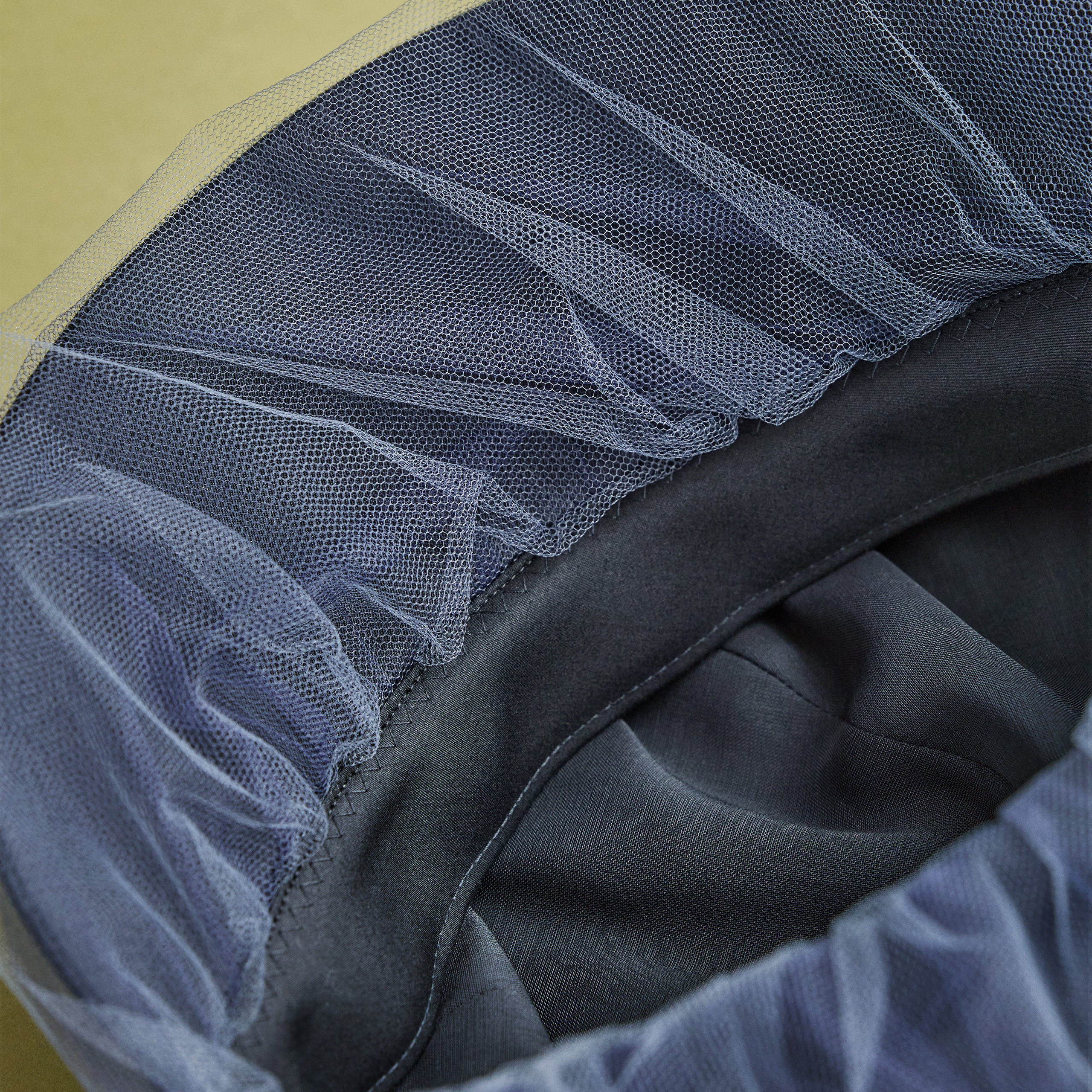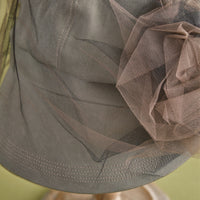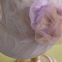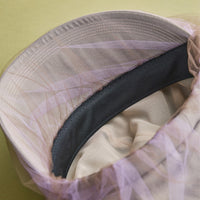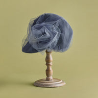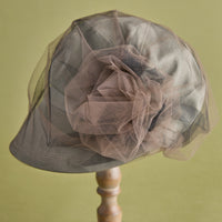 帽子をキャンバスに見立て、2色のチュールを重ね合わせ、抽象と具象のあいだを漂う薔薇を描きました。ワーカースタイルを思わせるステッチミシンの力強さと、チュールの繊細な質感と薔薇のデリケートなディテールが交差し、相反するムードが絶妙なバランスで調和しています。