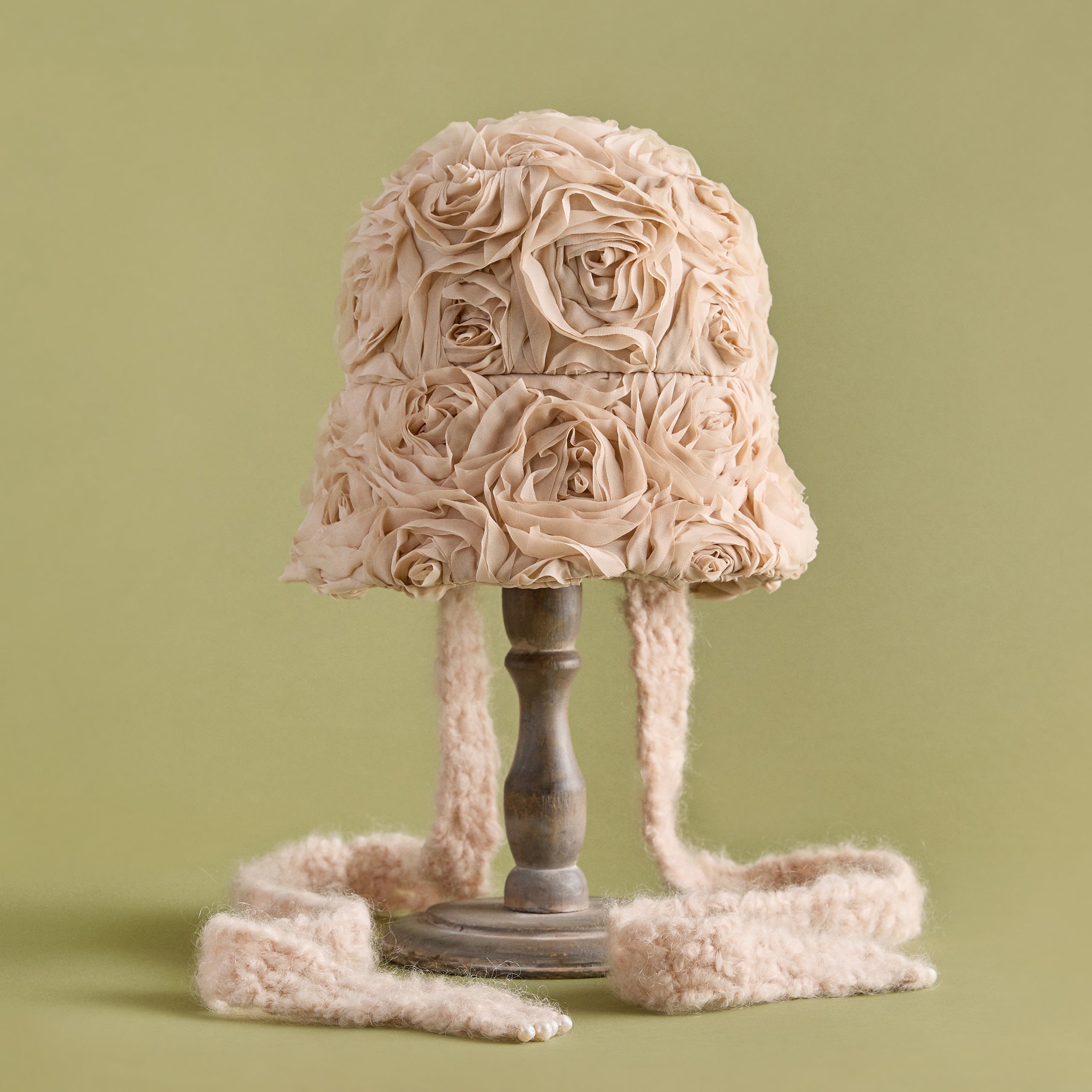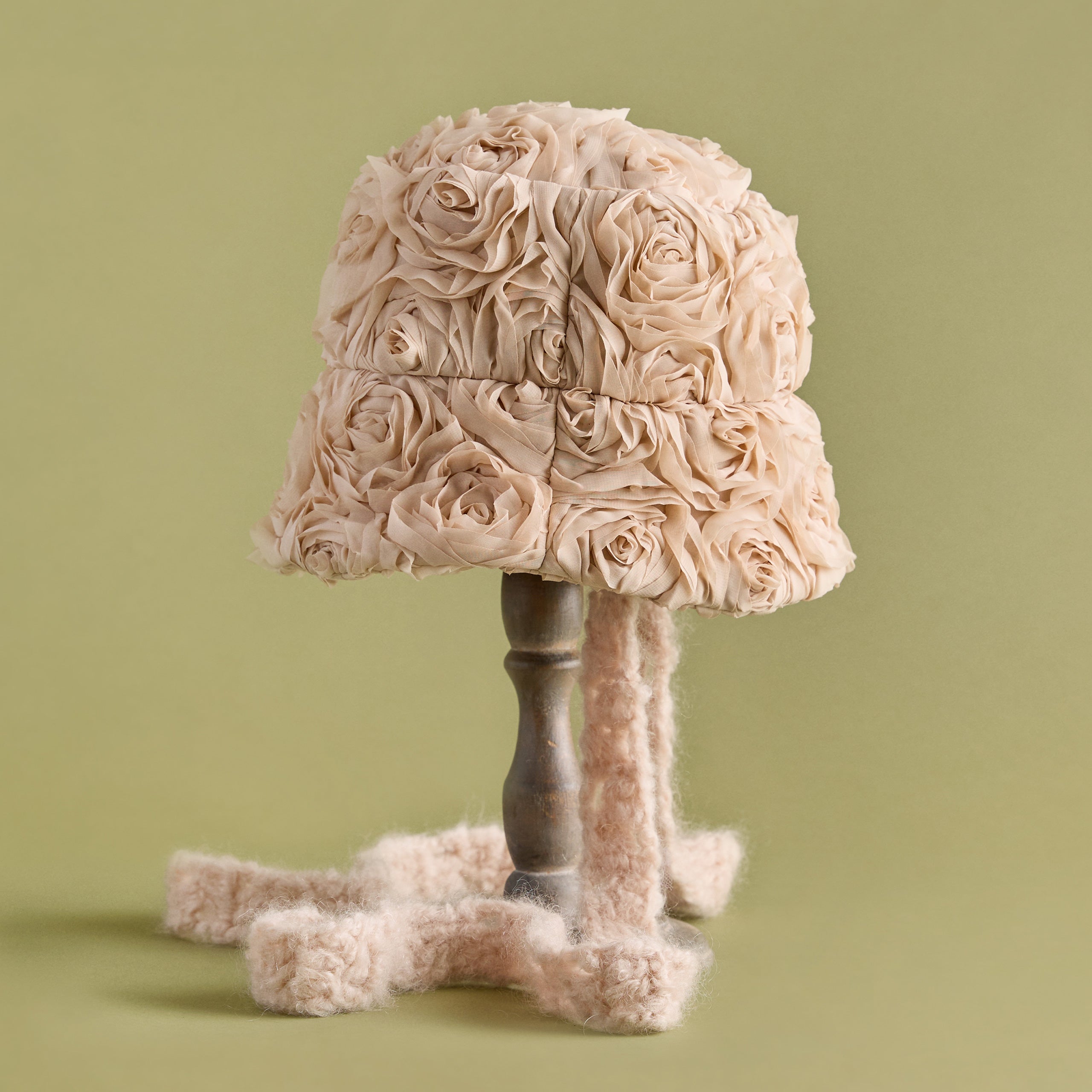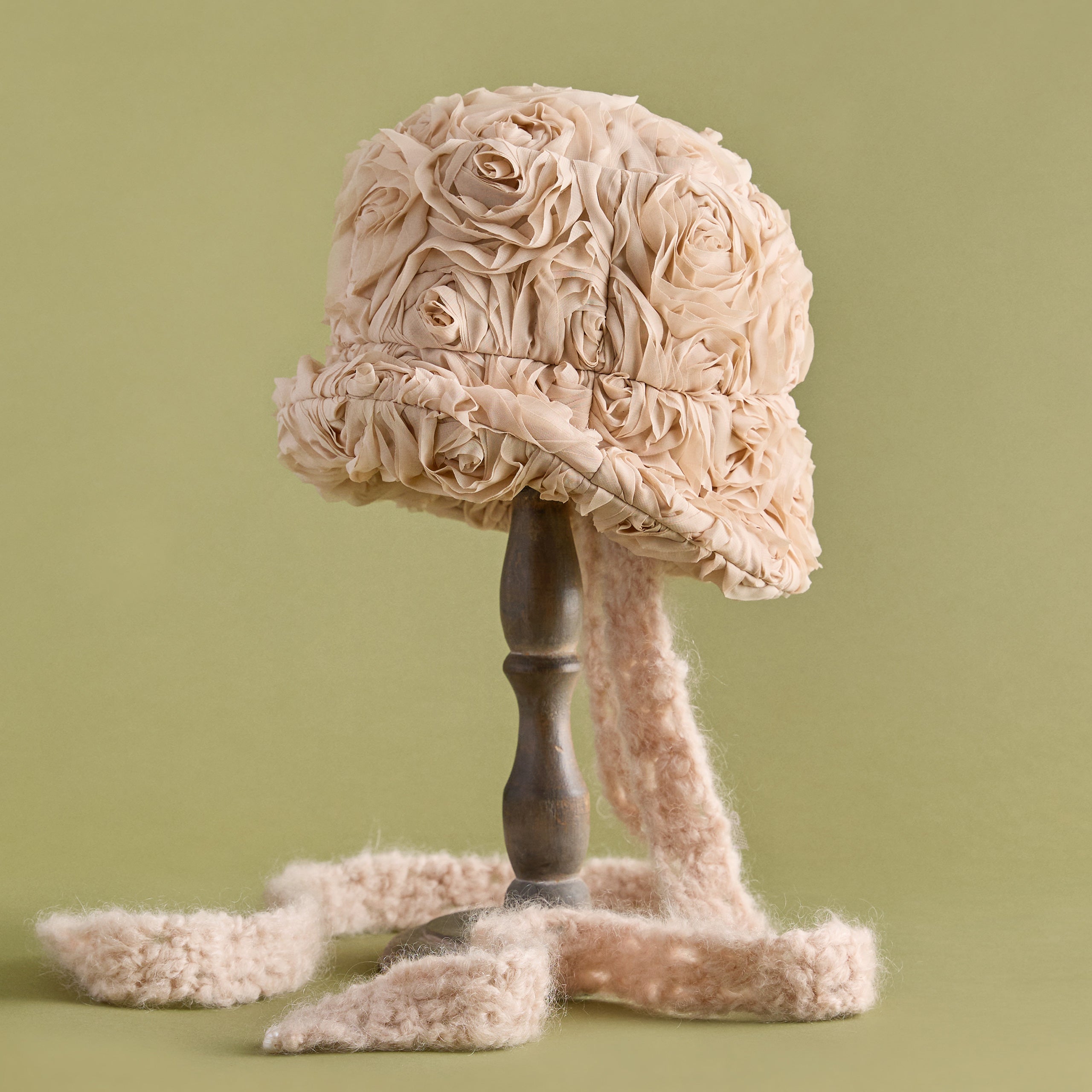 キルト綿芯を生地の裏側に纏わせることで、まるで巣に包まれるような温さと、程よいボリューム感を実現しました。ベースはバケットハット型。つばを後ろだけ上げたり、全体を上げたりと、シーンに合わせて表情を変えてお楽しみいただけます。