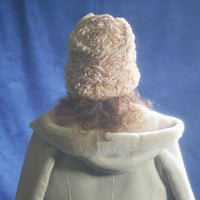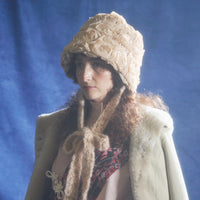 手編みのマフラーを思わせる、可愛らしいボリュームのある顎紐。モヘア毛糸で手編みしています。顎紐の先端には天然パールをあしらい、上品な優しさをプラス(ループ式で容易に取り外し可能。帽子本体にリボンとして巻いても可愛らしくアレンジできます)。