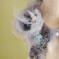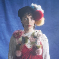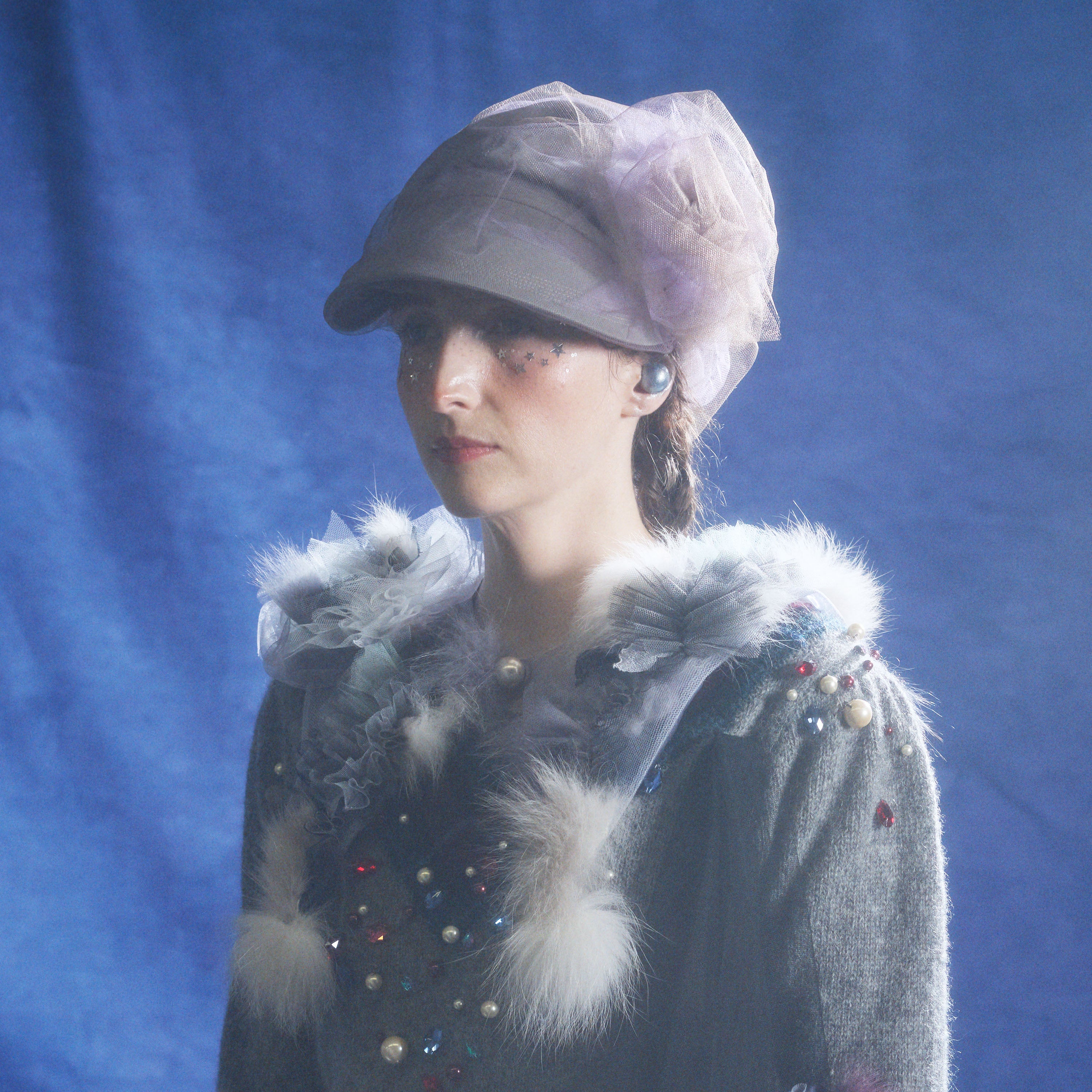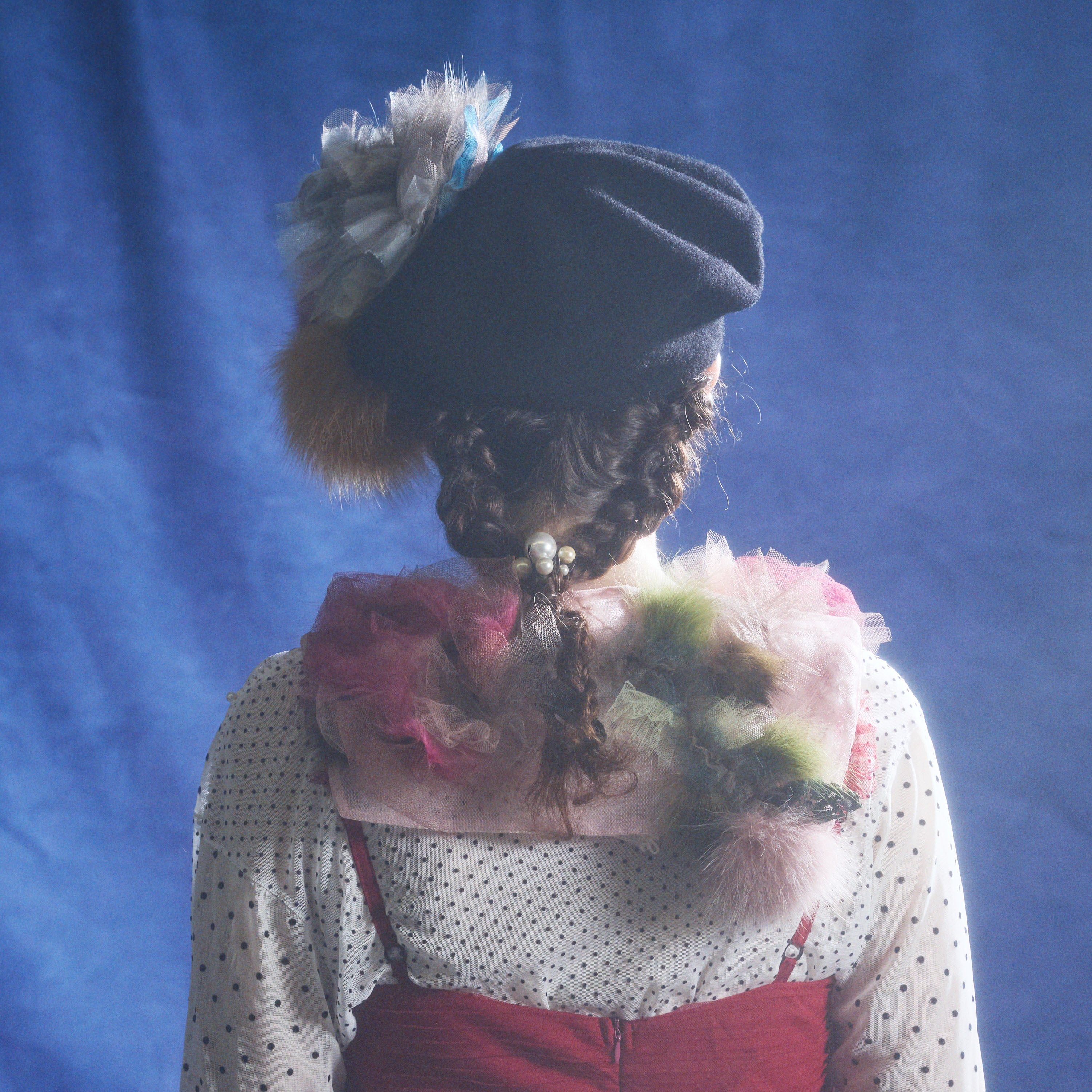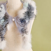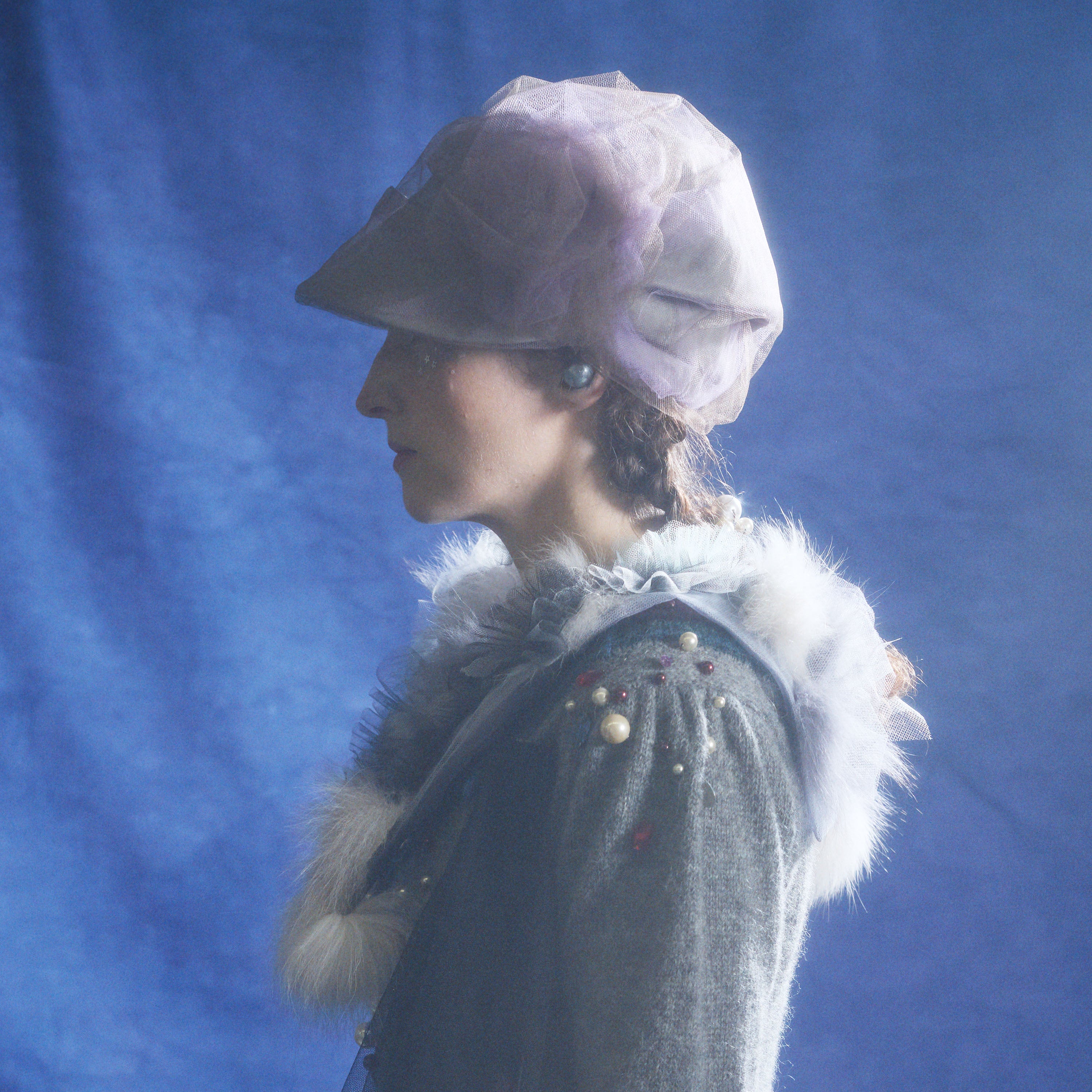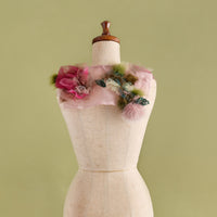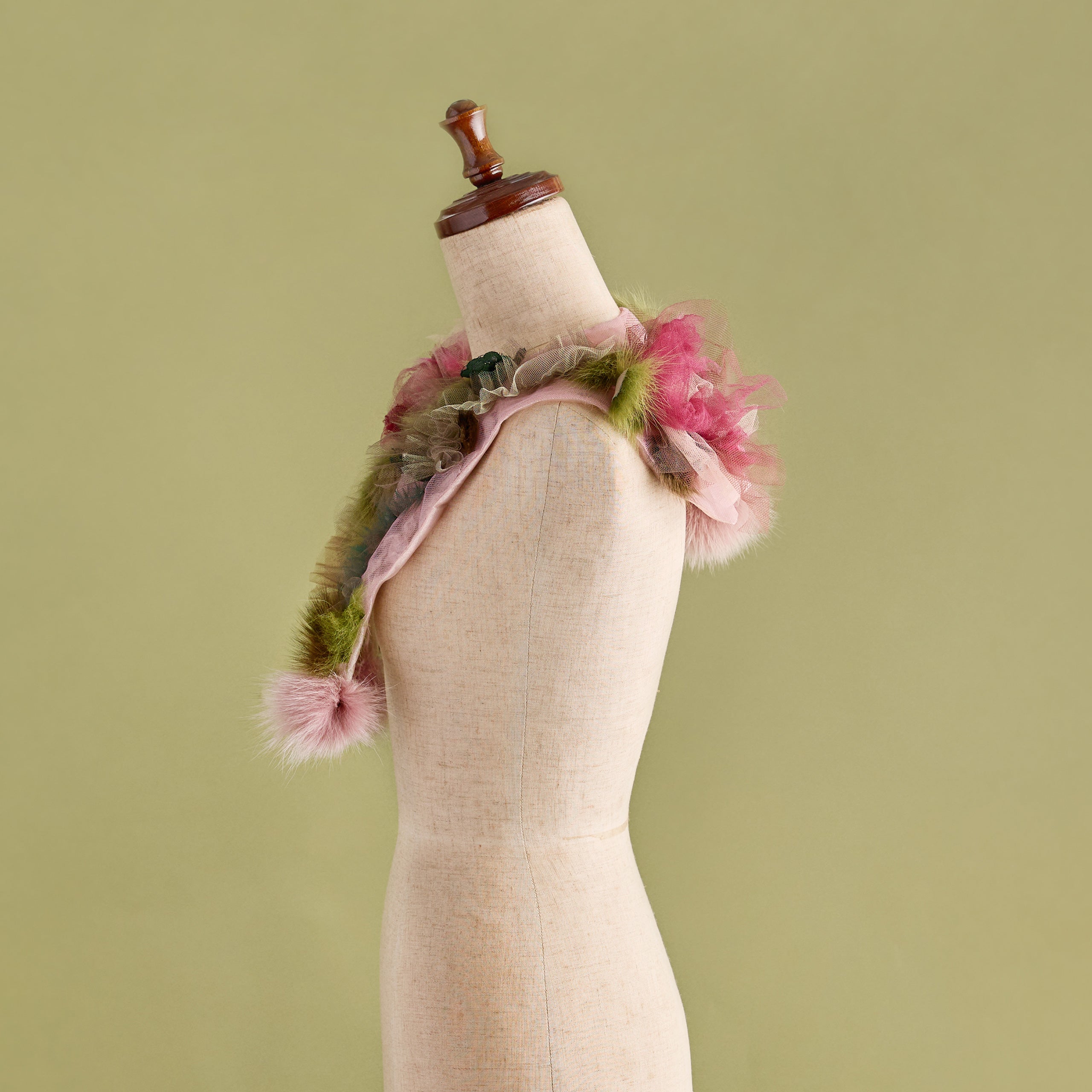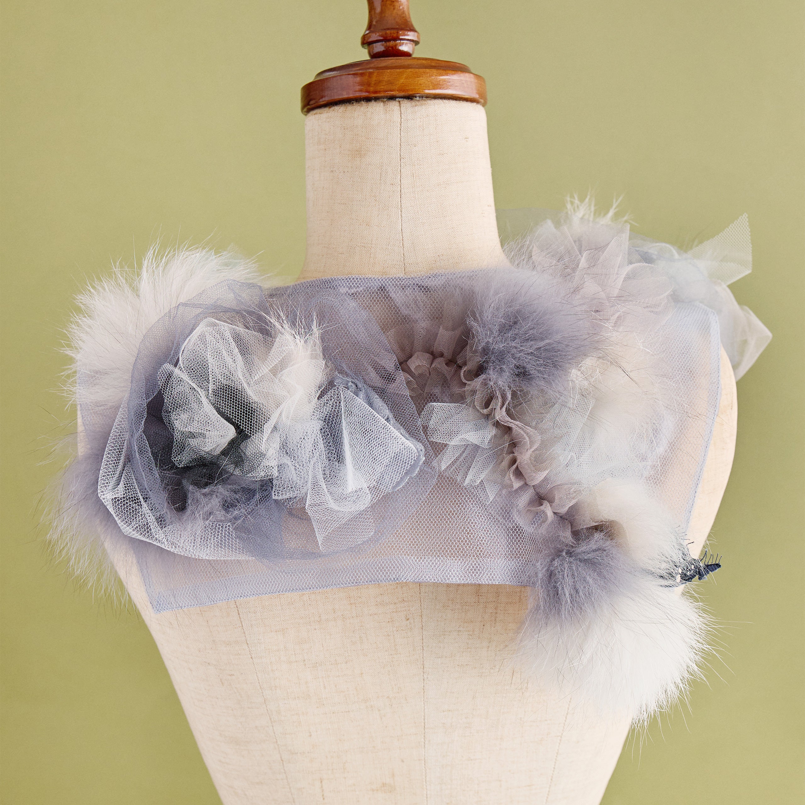 村には美しい森があり、芳しい薔薇の花が咲き、人々は景色と調和した独自の装いを楽しんでいる──。そんな物語からインスピレーションを受けました。大粒パールを1粒使用し、容易に着脱可能。表面はチュール、裏面はなめらかなオーガンジー仕立てにすることで、素肌に触れてもチクチクせず快適にご使用いただけます。さらに透ける襟の中にモヘア糸を這わせ、冬の装いに寄り添う小さな工夫を施しました。幻想的なムードを添える、特別な一枚です。
