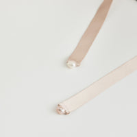 取り外し可能なサテンのあご紐には天然パールを飾りました。天然ですので微妙にひとつづつ形が違うのも楽しみなポイントです。